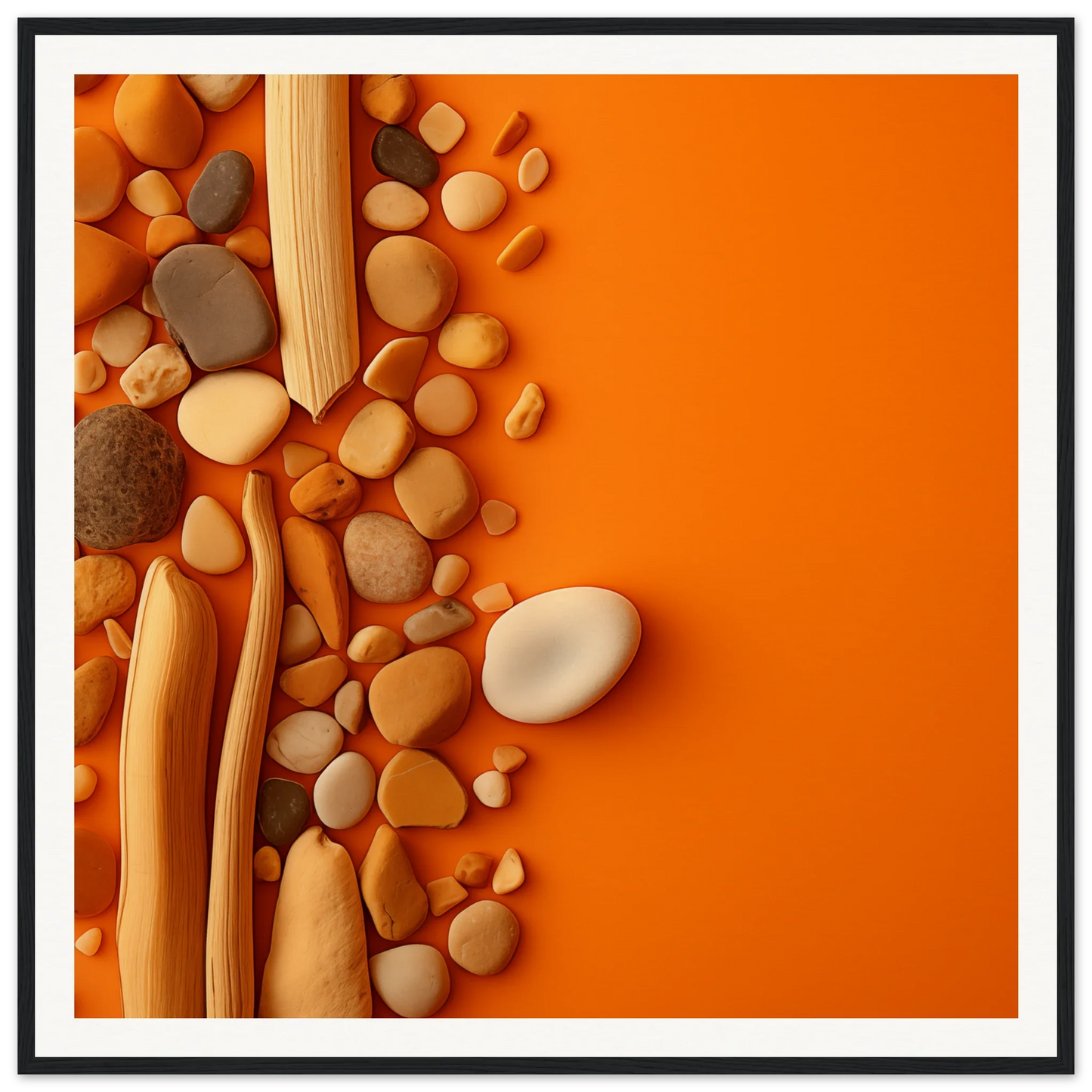 Envision tranquility and vitality intertwined, as this Anchored Orange Dharma wall art does just that. This masterpiece crafted with cutting-edge AI image generation techniques brings to life an abstract composition of natural elements. A vivid orange background serves as the canvas, highlighting a meticulously arranged collection of pebbles and elongated wood pieces.