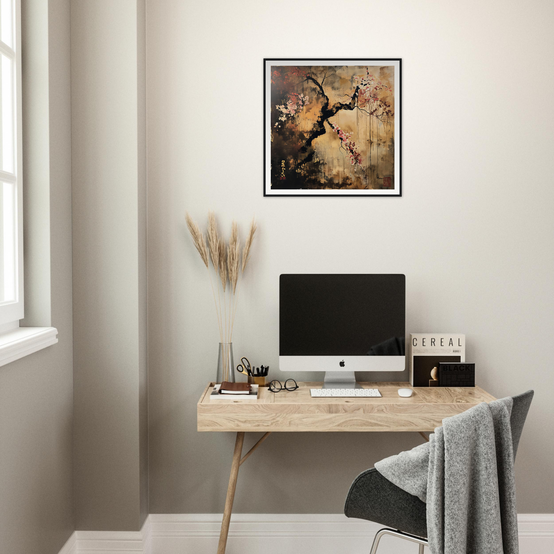 Crafted with the latest AI image generation technology, this art piece embodies a harmonious confluence of rich East Asian influences with contemporary expression. Its warm, earthy beige background complements the graceful diagonal sweep of the cherry branch, capturing a moment as fragile as it is beautiful.