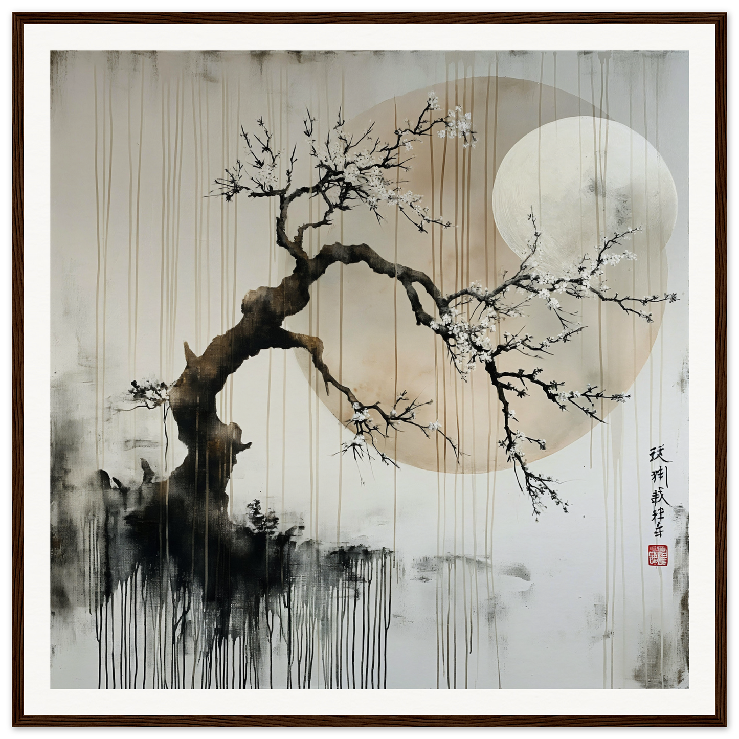 Step into a world where tranquility and grace harmonize. This exquisitely framed artwork, Blossoms’ Cosmic Serenade, captures the timeless beauty of nature through the latest in AI-generated innovation. Witness the delicate dance of white blossoms against a luminous moon, set upon an ancient branch. This motif, rich in East Asian symbolism, speaks to resilience and beauty amidst life's adversities.