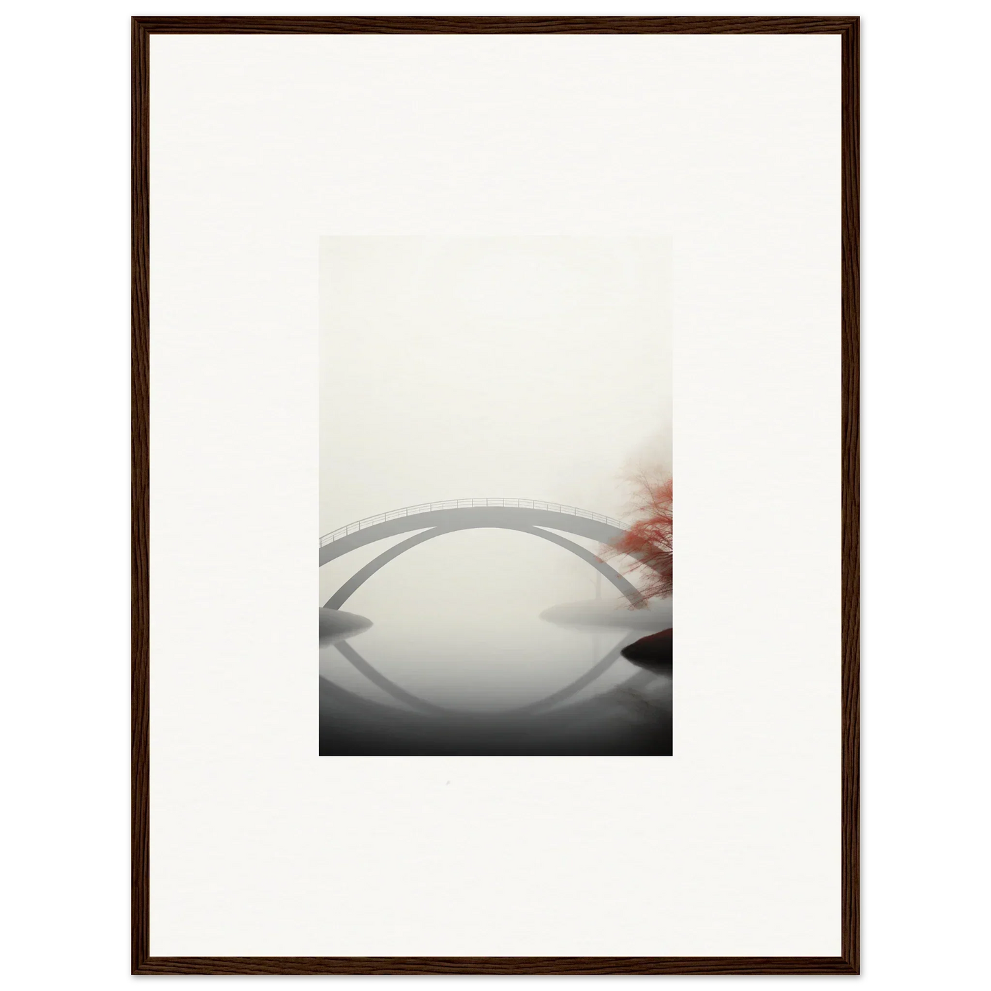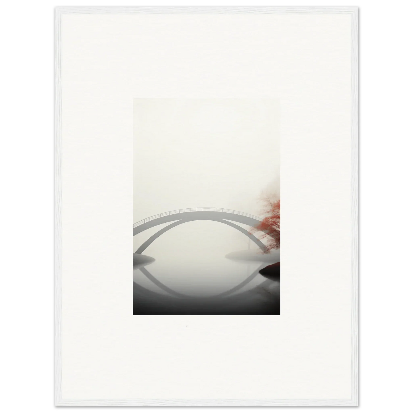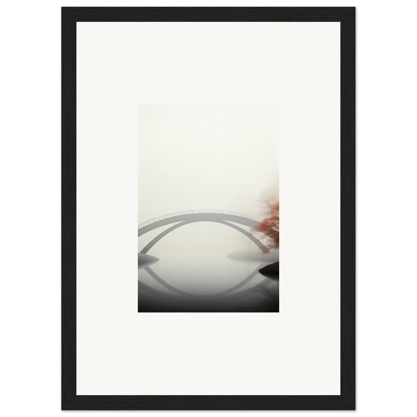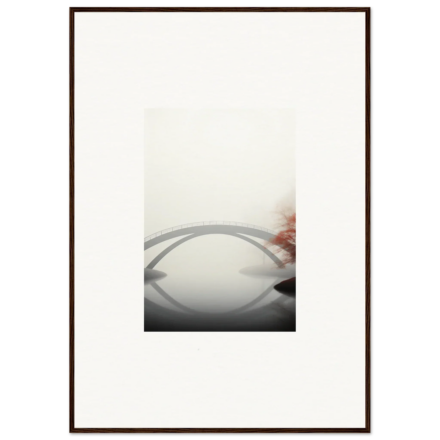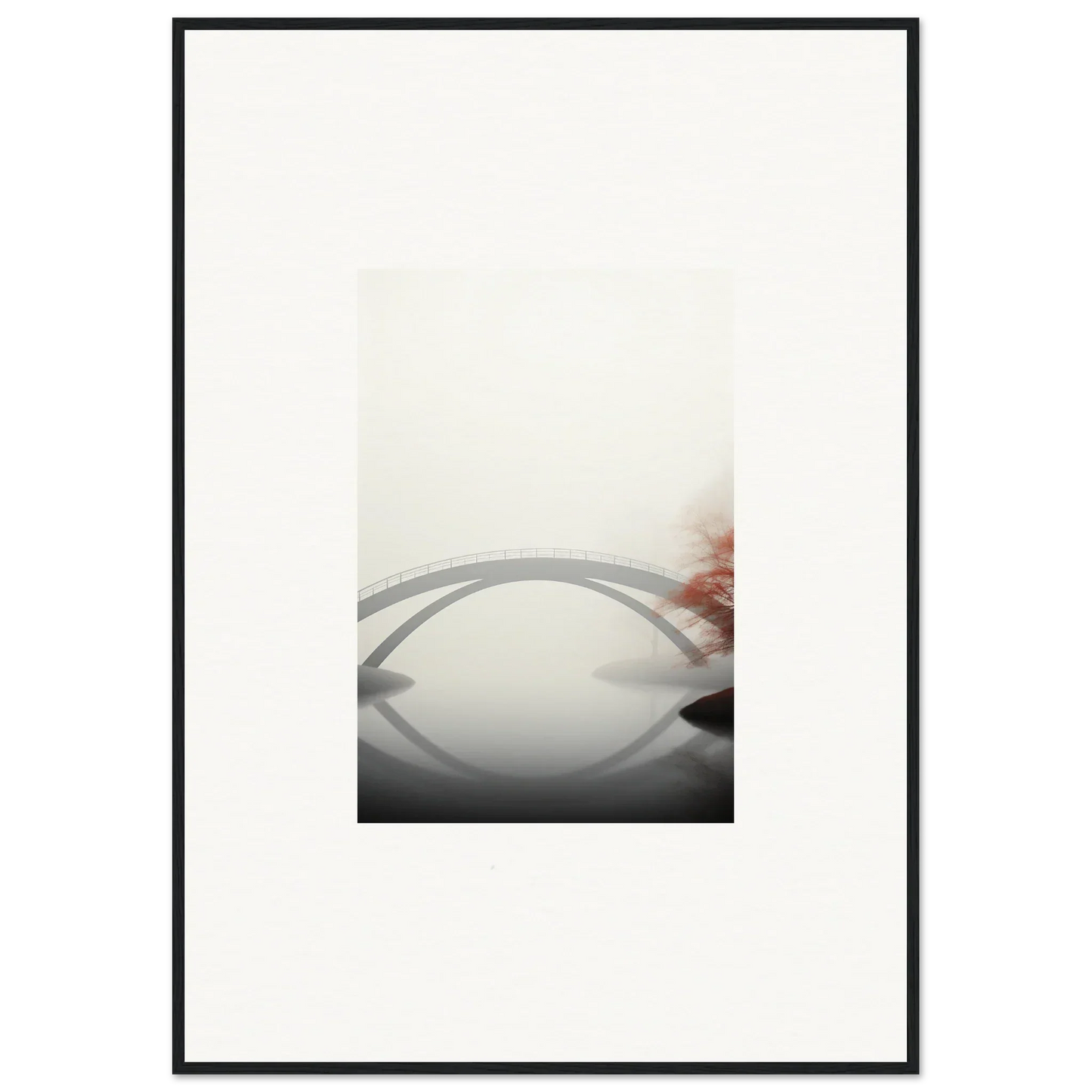 Imagine the gentle whisper of a solitary bridge arching gracefully over a serene waterway, captured in striking monochrome with a hint of vibrant red. Our Bridge Reflection framed wall art, meticulously crafted using the latest AI image generation technology, is more than just a decor piece—it's an experience. Transform your living spaces into sanctuaries of calm and elegance, evoking moods of focus, serenity, and peace.
