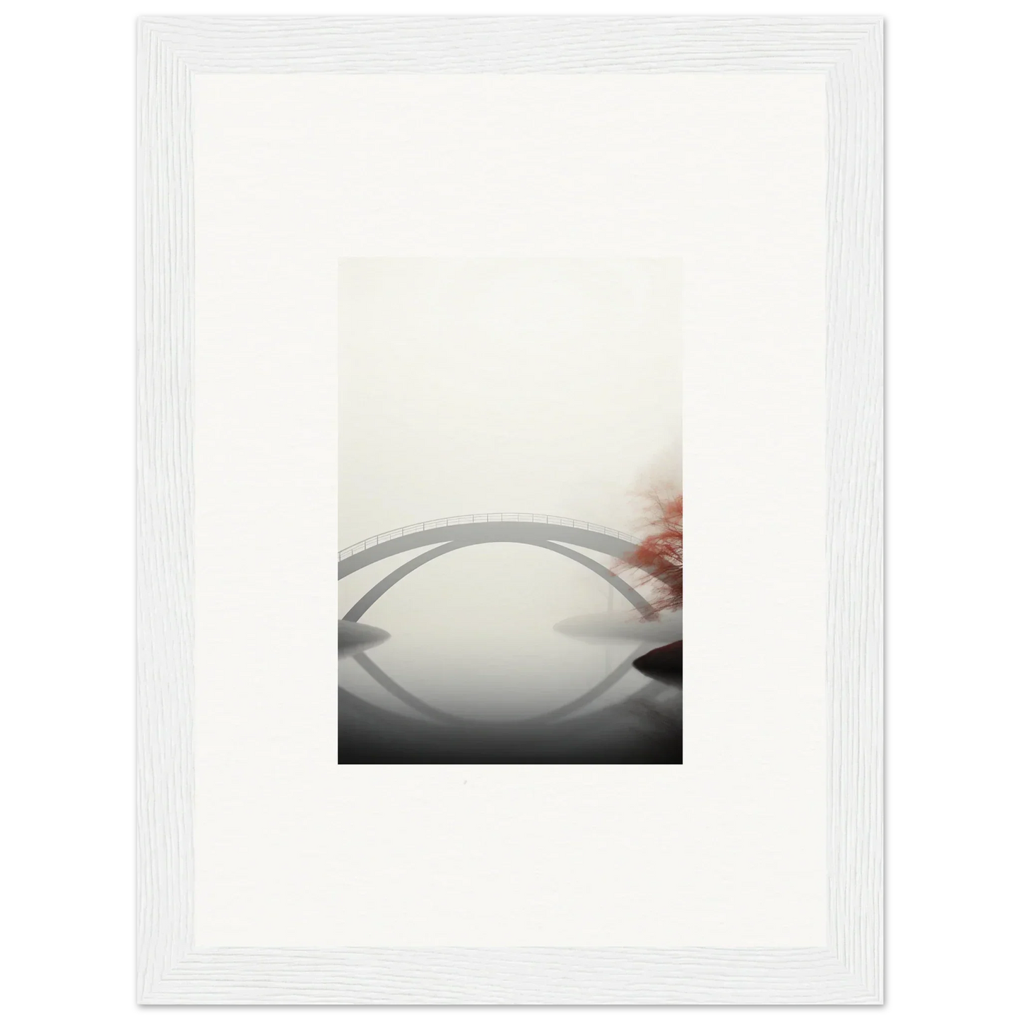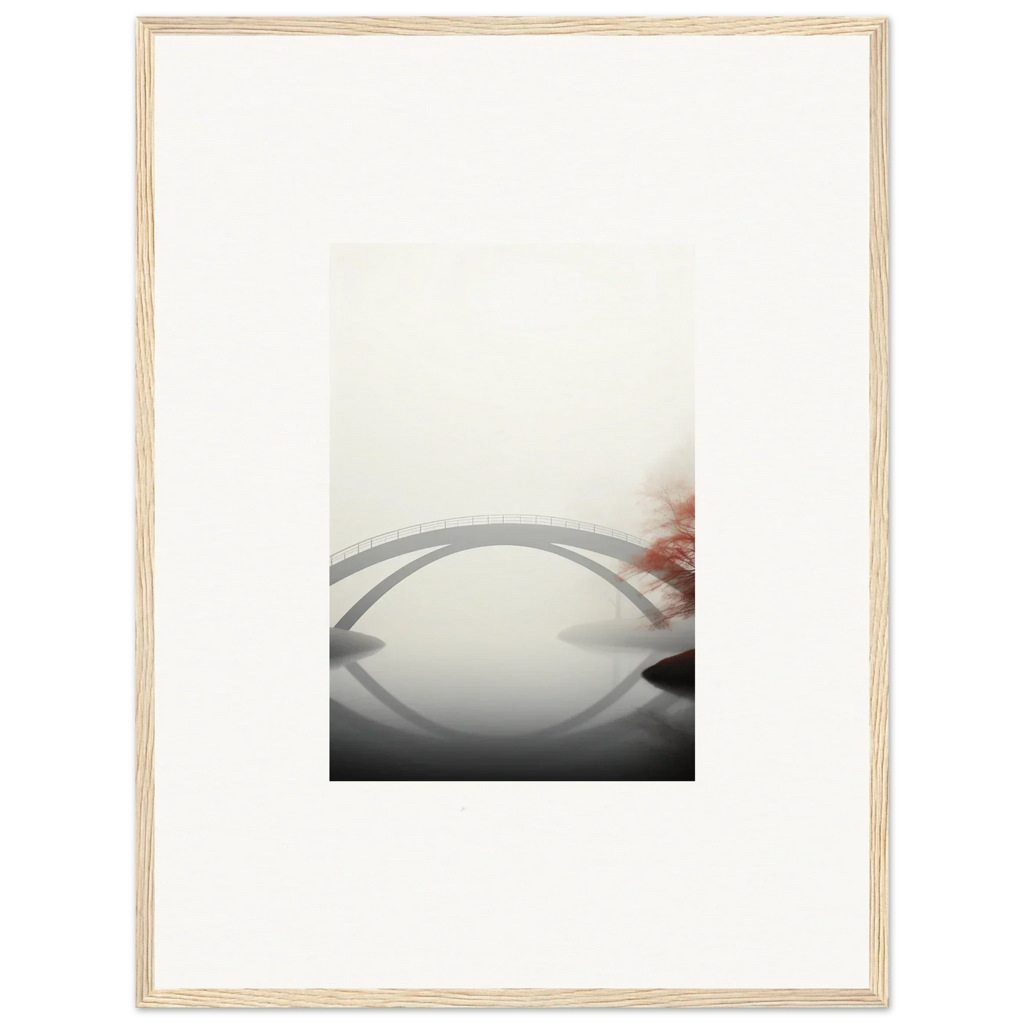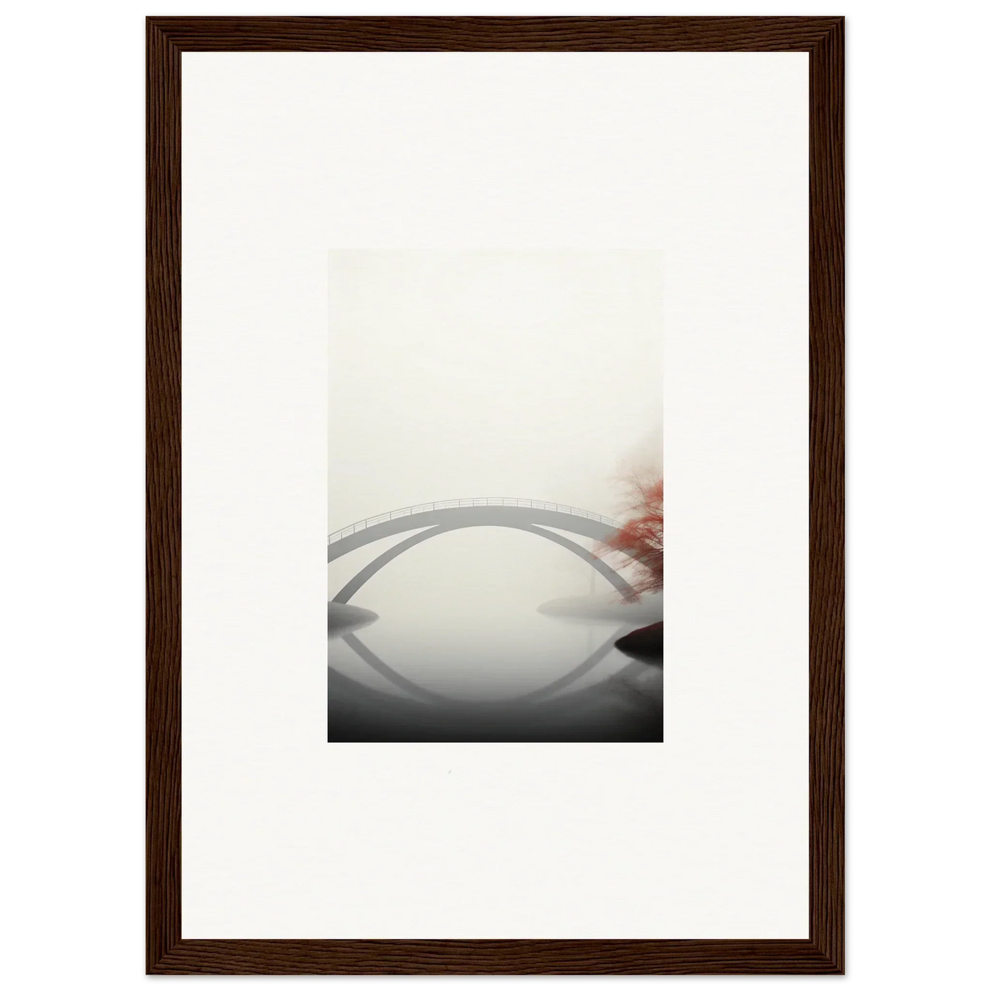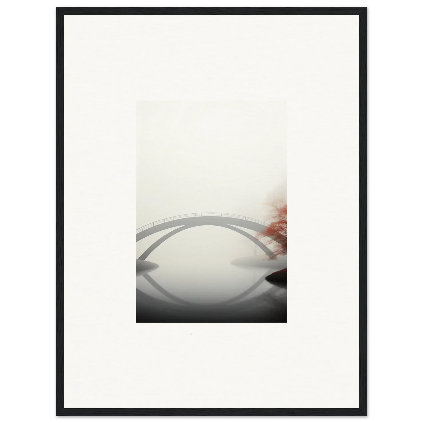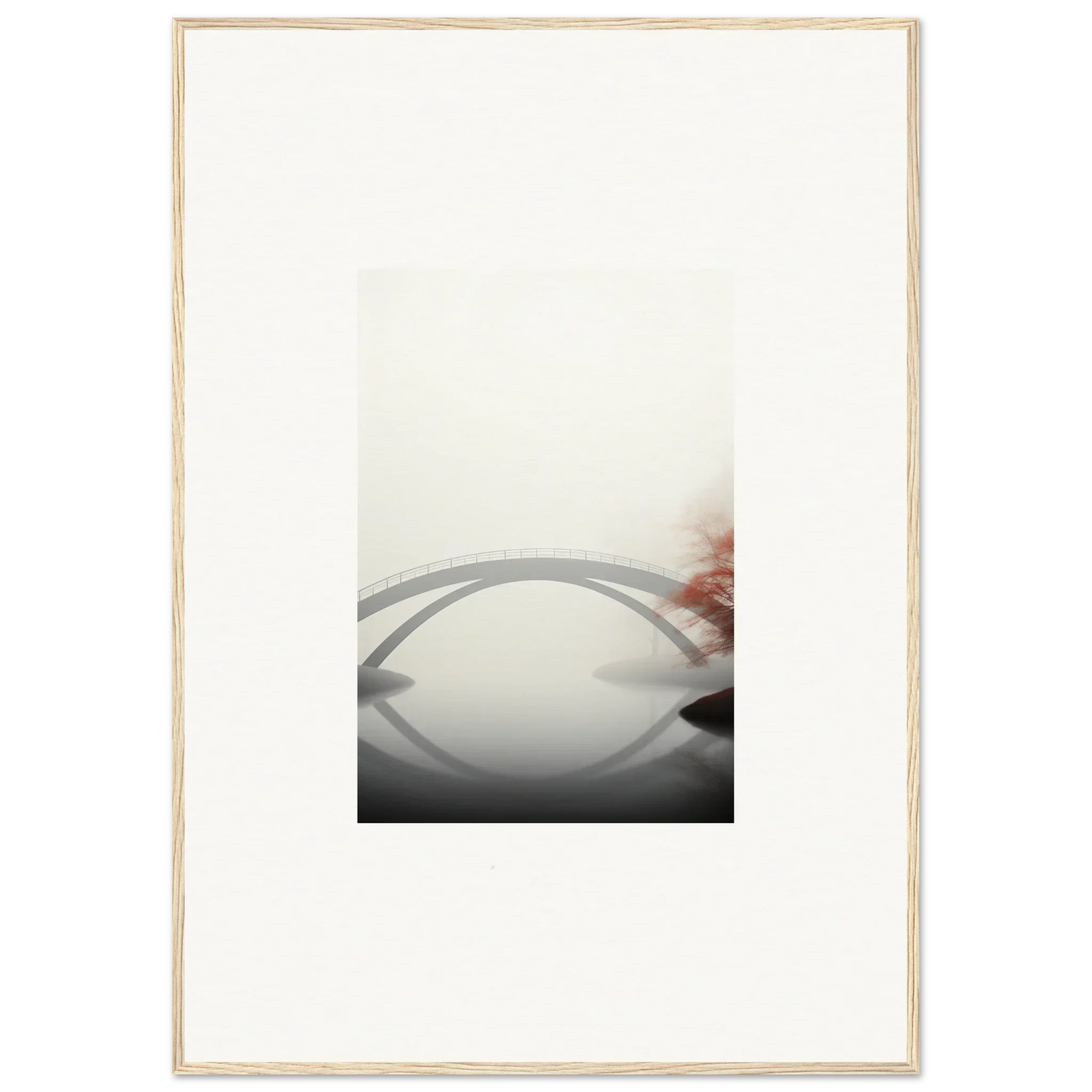 Imagine the gentle whisper of a solitary bridge arching gracefully over a serene waterway, captured in striking monochrome with a hint of vibrant red. Our Bridge Reflection framed wall art, meticulously crafted using the latest AI image generation technology, is more than just a decor piece—it's an experience. Transform your living spaces into sanctuaries of calm and elegance, evoking moods of focus, serenity, and peace.