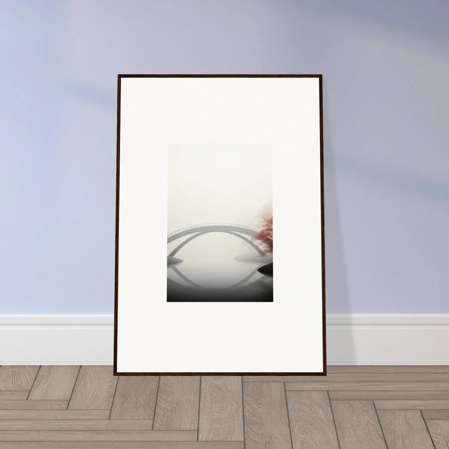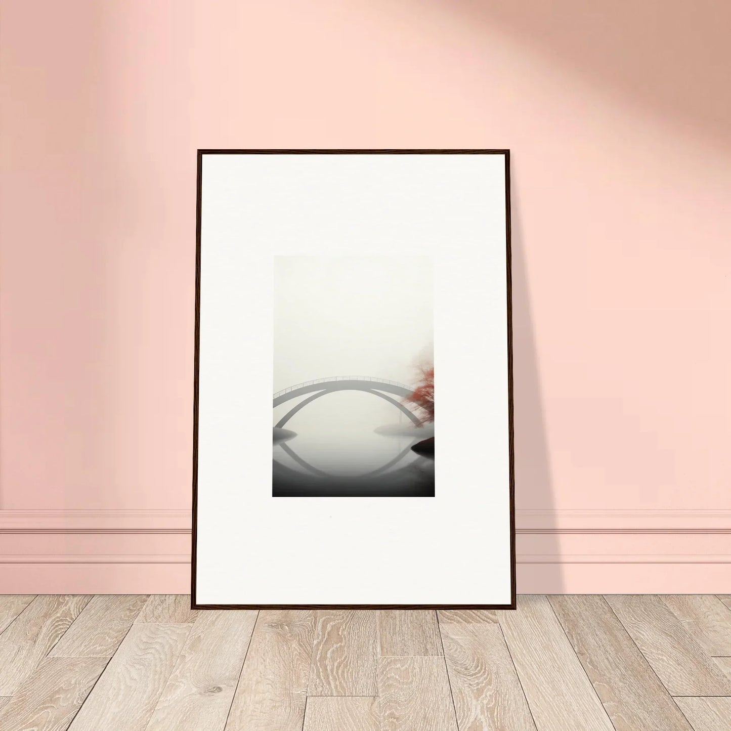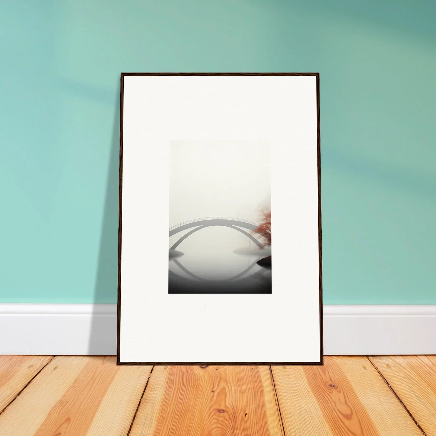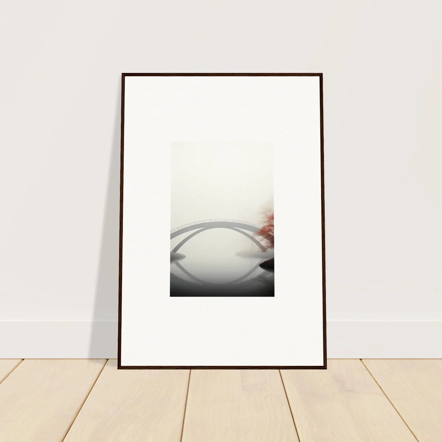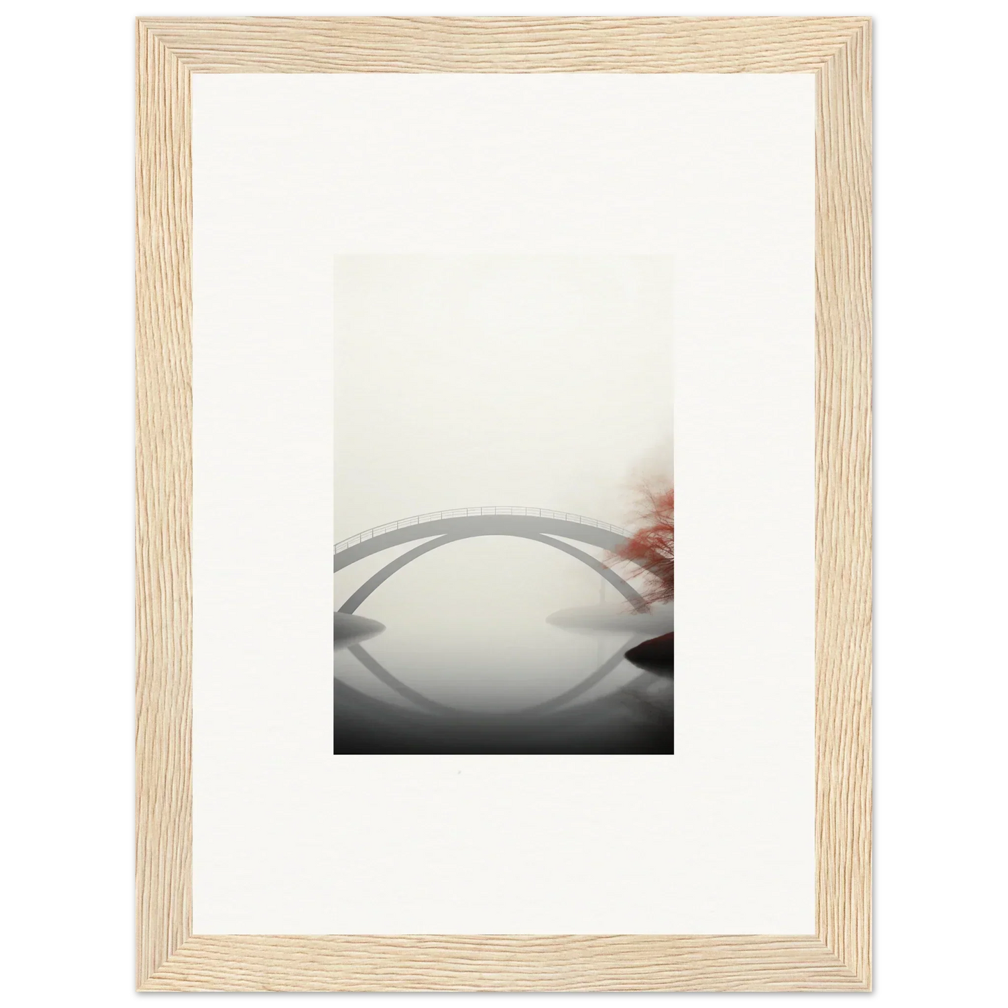 Imagine the gentle whisper of a solitary bridge arching gracefully over a serene waterway, captured in striking monochrome with a hint of vibrant red. Our Bridge Reflection framed wall art, meticulously crafted using the latest AI image generation technology, is more than just a decor piece—it's an experience. Transform your living spaces into sanctuaries of calm and elegance, evoking moods of focus, serenity, and peace.