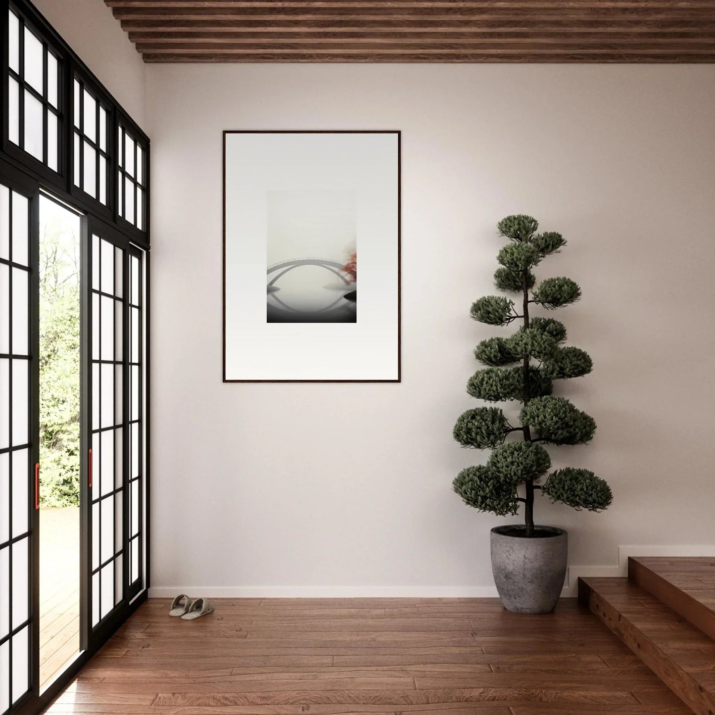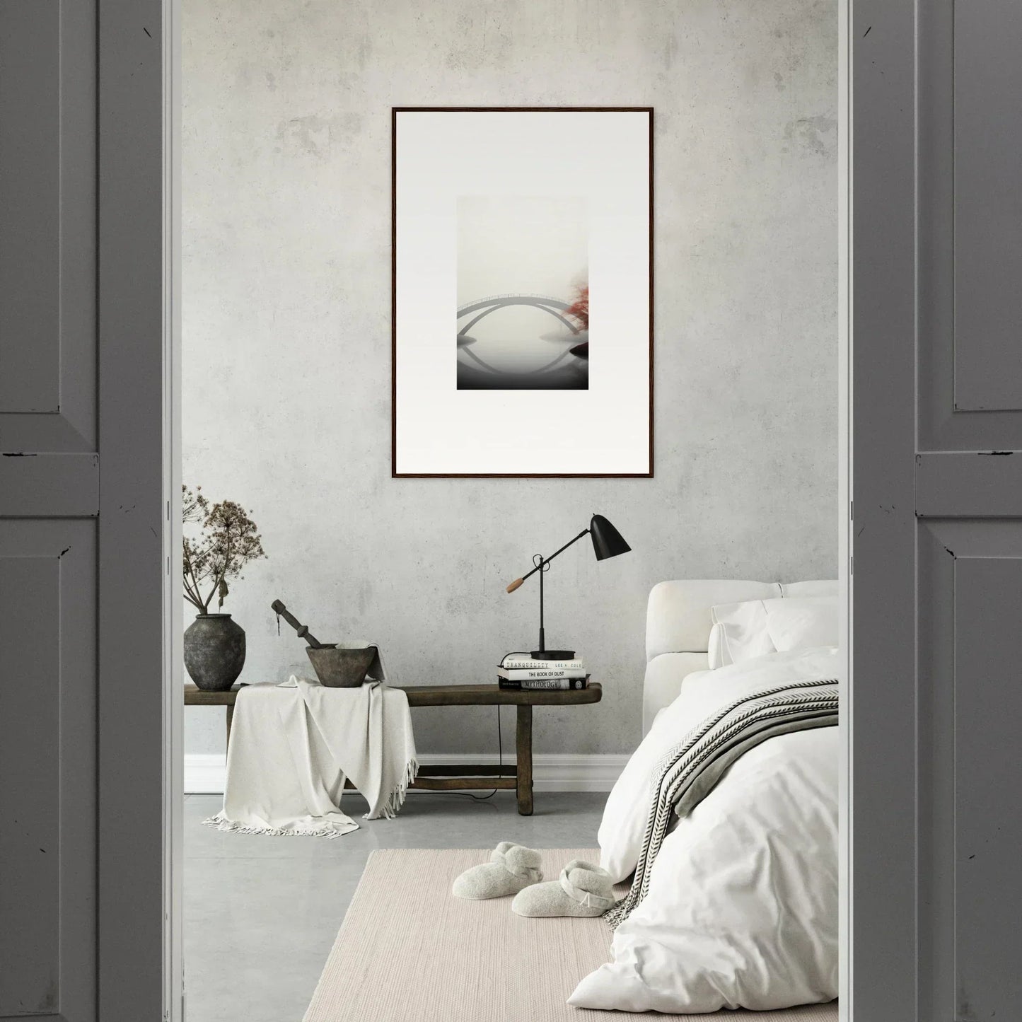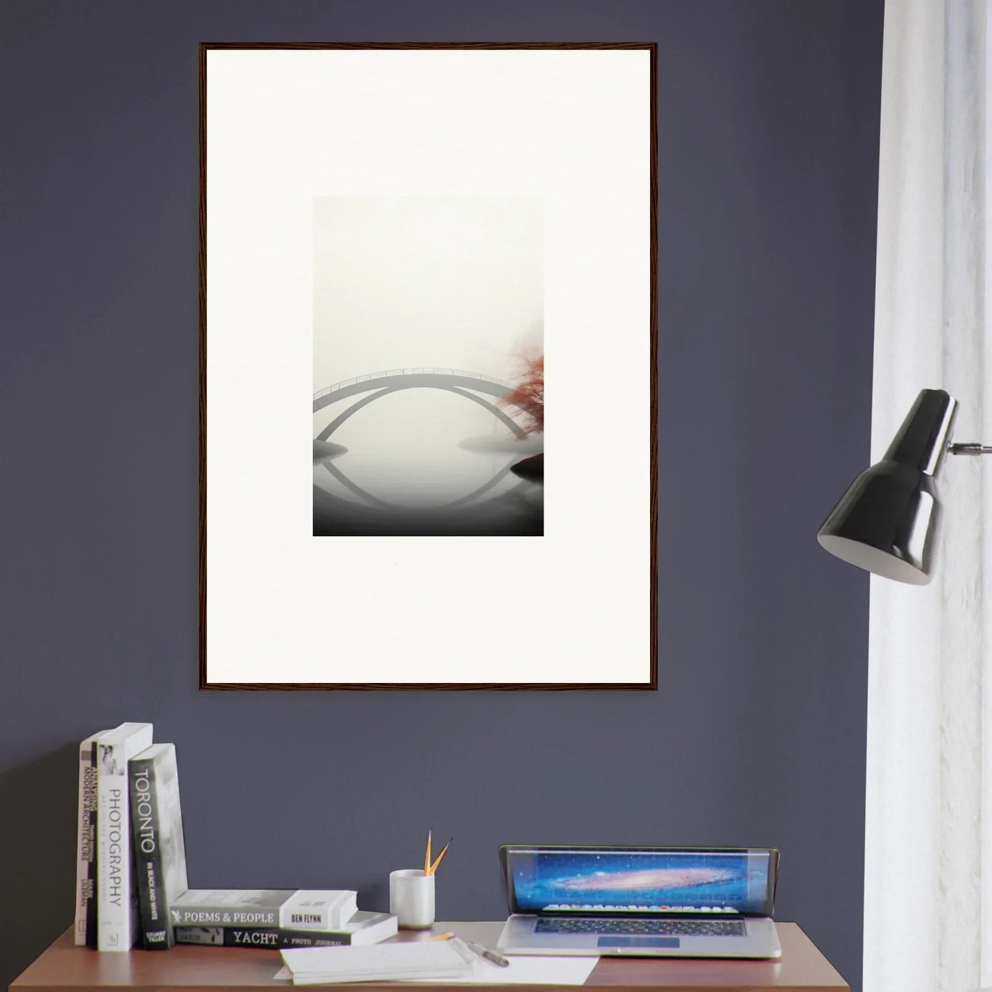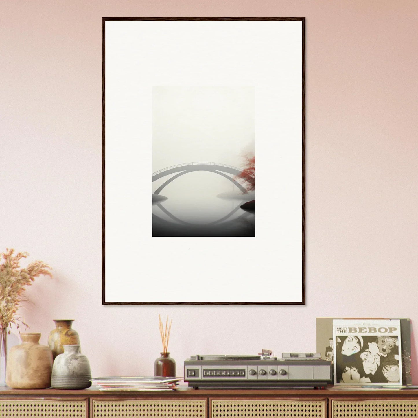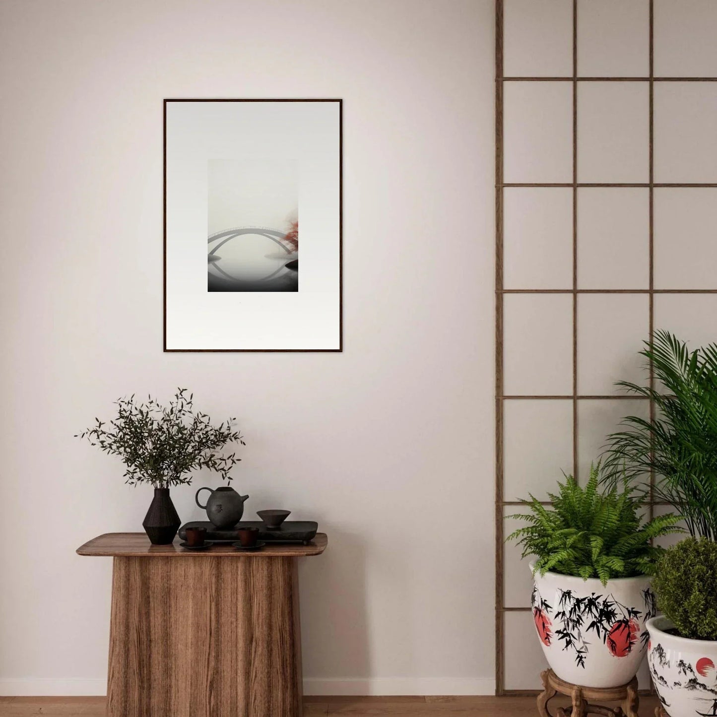 Imagine the gentle whisper of a solitary bridge arching gracefully over a serene waterway, captured in striking monochrome with a hint of vibrant red. Our Bridge Reflection framed wall art, meticulously crafted using the latest AI image generation technology, is more than just a decor piece—it's an experience. Transform your living spaces into sanctuaries of calm and elegance, evoking moods of focus, serenity, and peace.