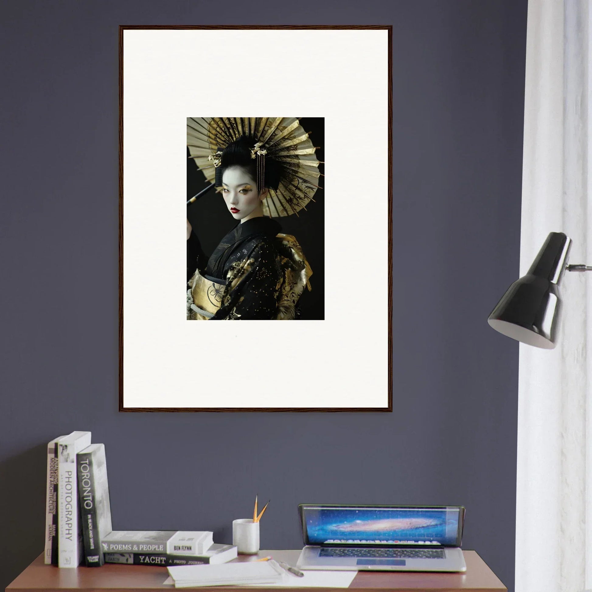 Lose yourself in the enchanting allure of "Celestial Velvet Chorale," a meticulously crafted masterpiece that blends tradition with modern elegance. This framed wall art, developed with the latest AI-image generation technology, embodies the exquisite fusion of Japanese Art style with contemporary sophistication.