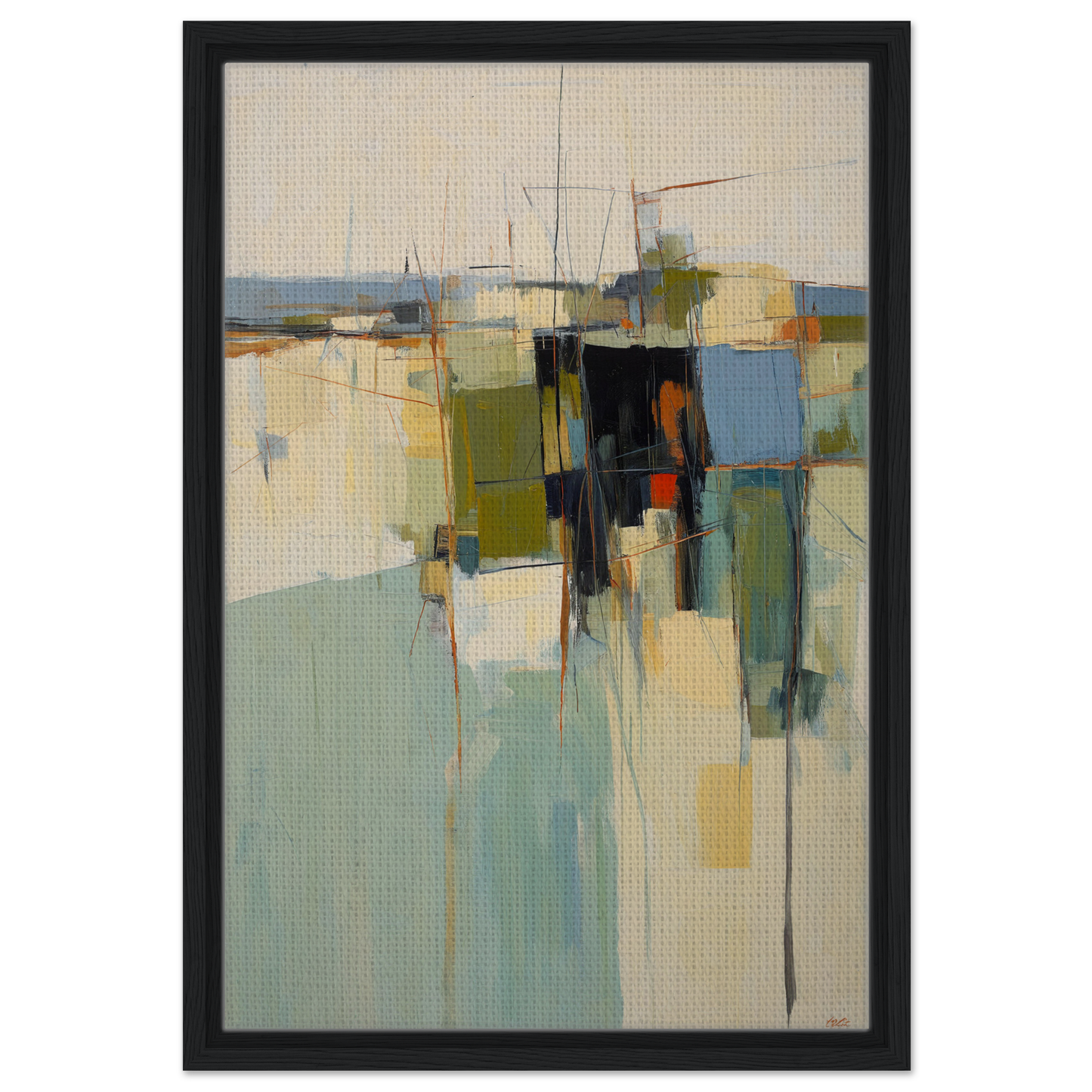The artwork's muted green backdrop, contrasted by intricate shades of blue, yellow, and black, evokes a serene cityscape of intersecting forms. Its subdued sophistication makes it ideal for your living room, bedroom, or office, inviting calm contemplation and inspiring personalization of every space.