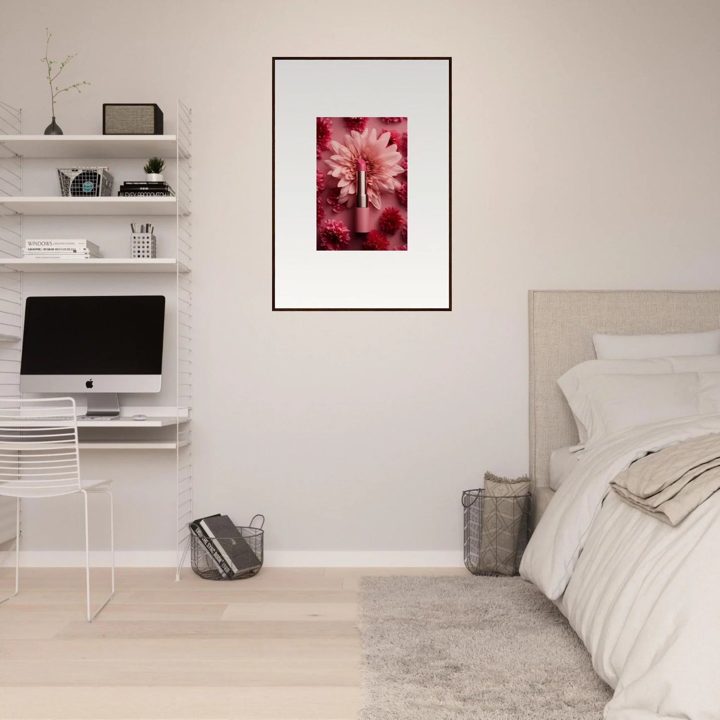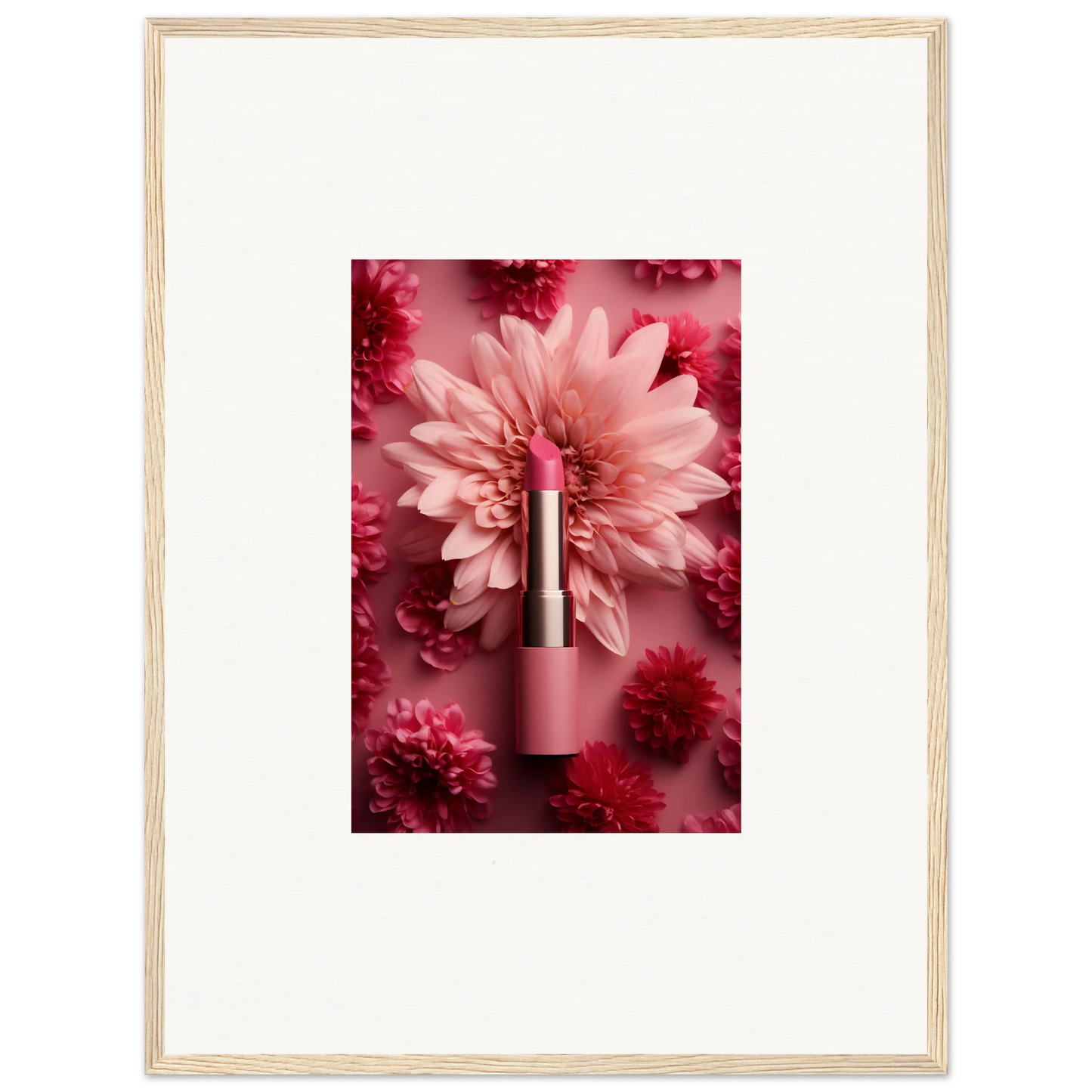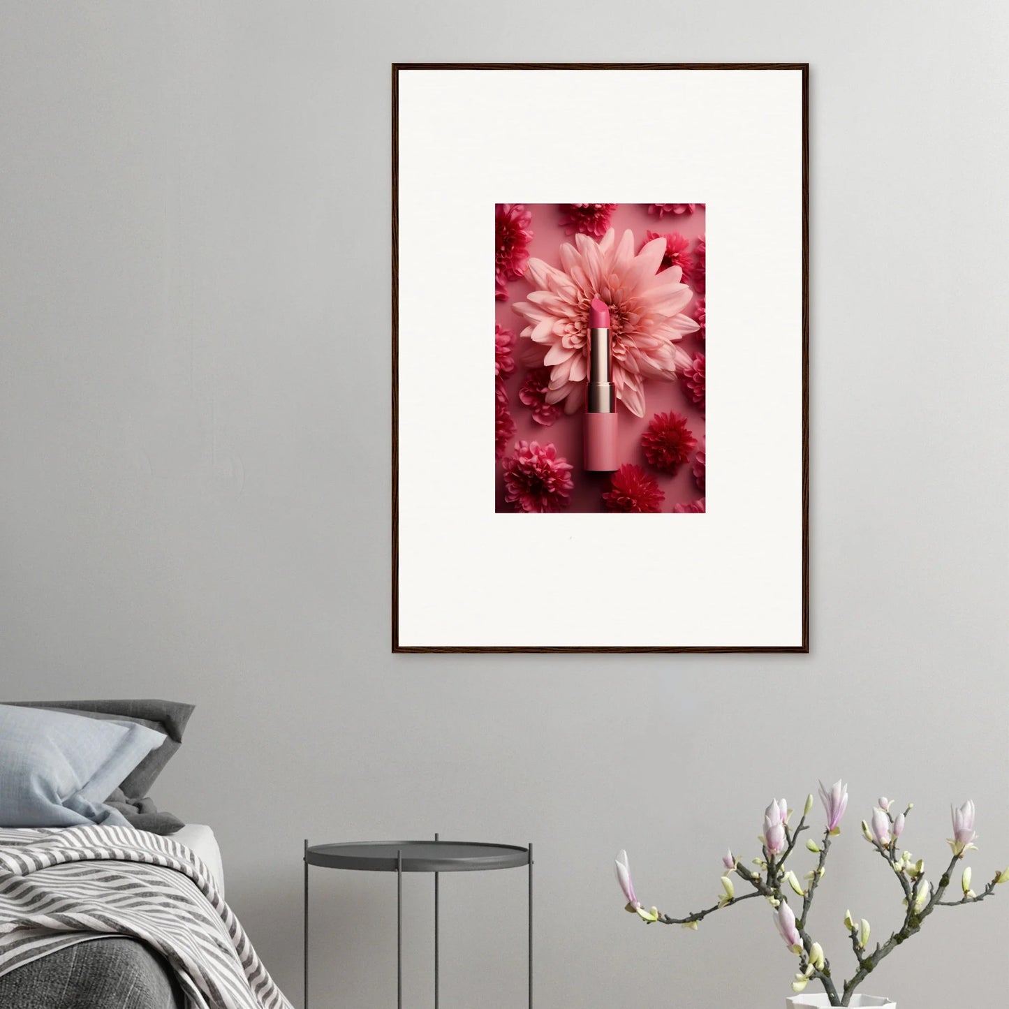 The "Chrysanthemum Velvet Hymn" framed wall art is a versatile addition to any space. Its pink and red hues paired with the complementary color palette create an aura of compassion and love, making it perfect for makeup rooms, women’s spaces, or any room where an atmosphere of creativity and inspiration is desired. The floral and botanical subject matter paired with makeup and beauty elements speaks volumes of elegance and sophistication, ideal for those who appreciate fine photography art.