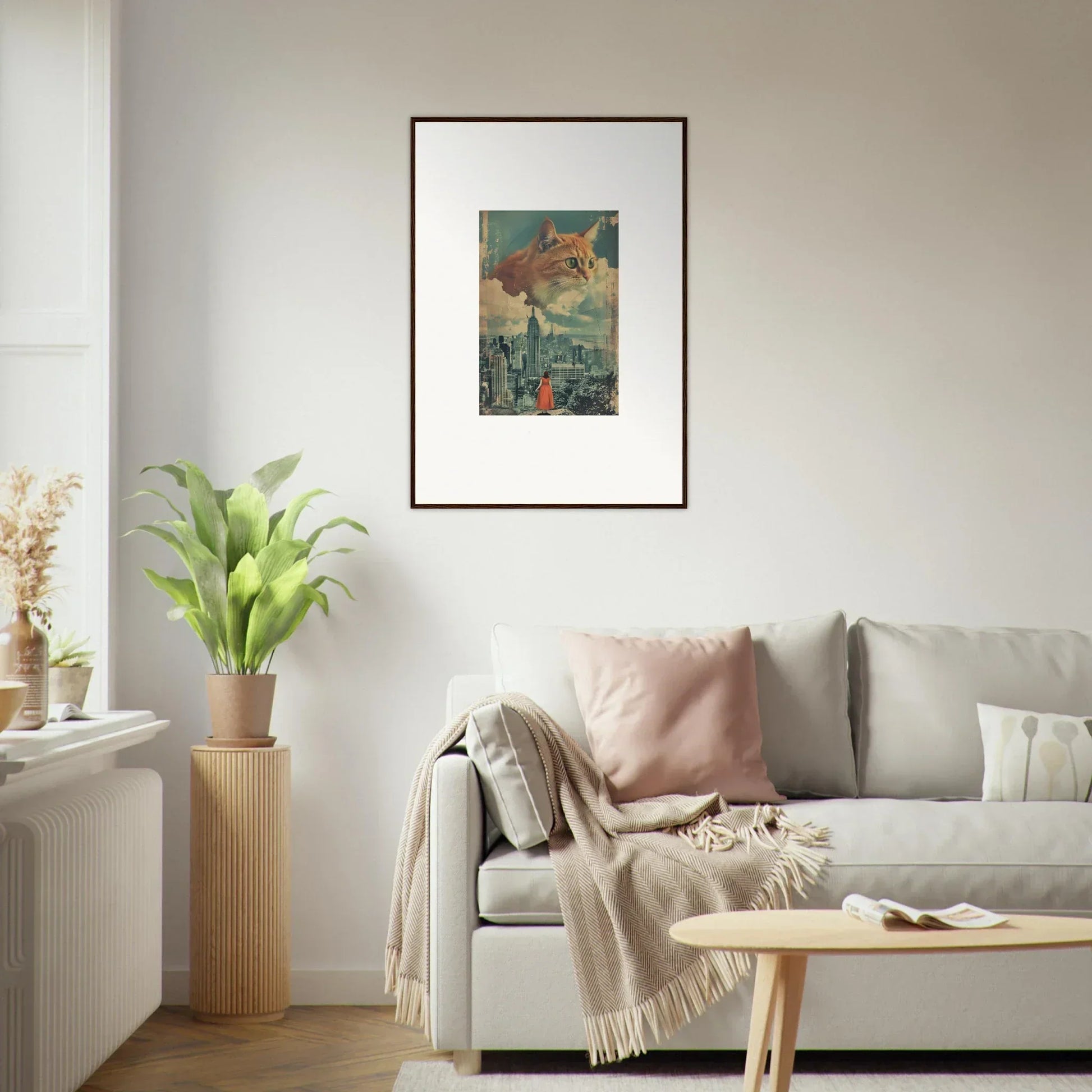 This piece, 'Cosmic Cat Visions,' is a stunning example of surrealism art that melds the fantastical with the everyday, all through the lens of AI technology. Its complementary color palette featuring muted teals and natural tones seamlessly integrates with various interiors—be it a home office that thrives on creativity or a living room that yearns for a touch of intrigue.