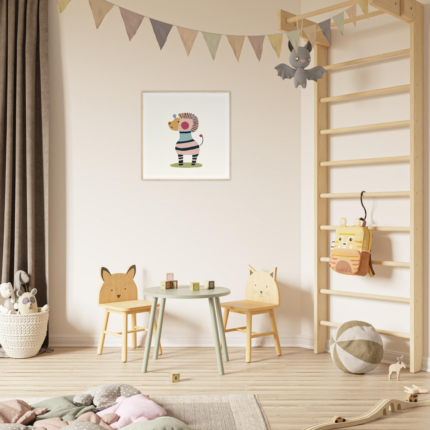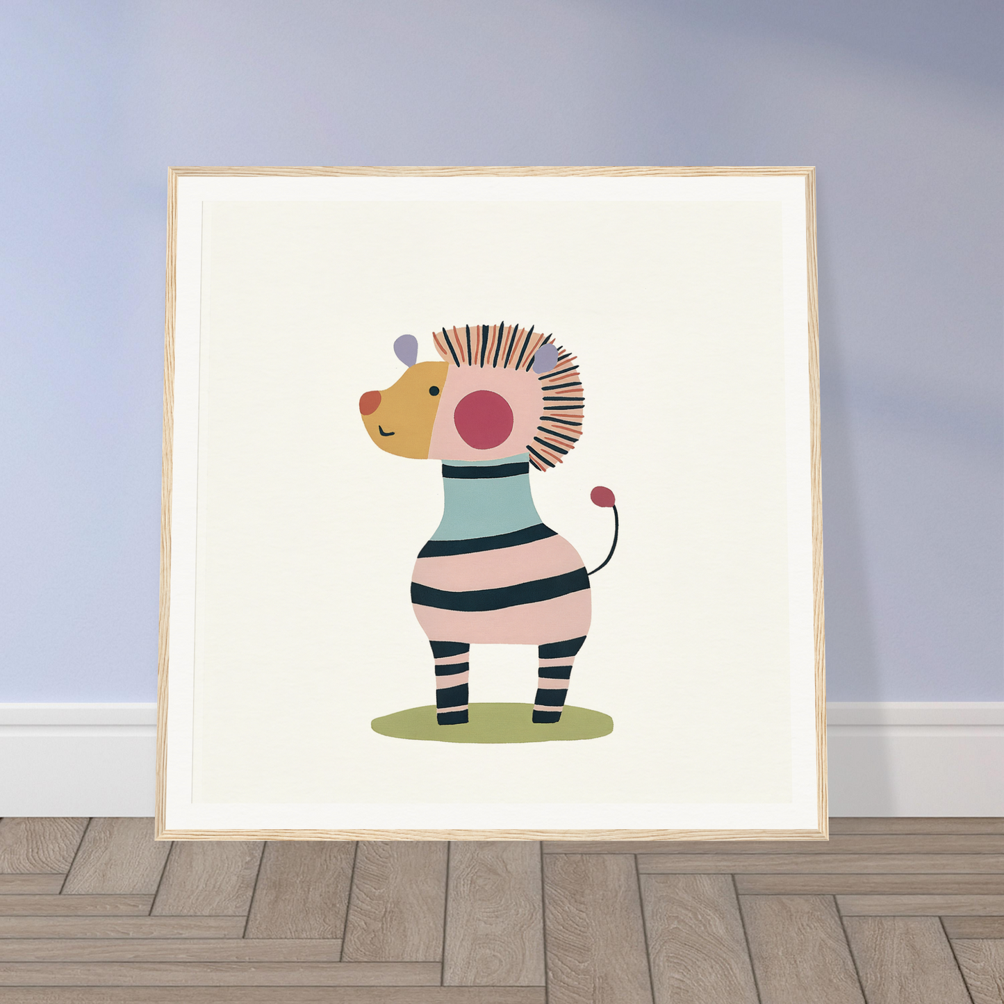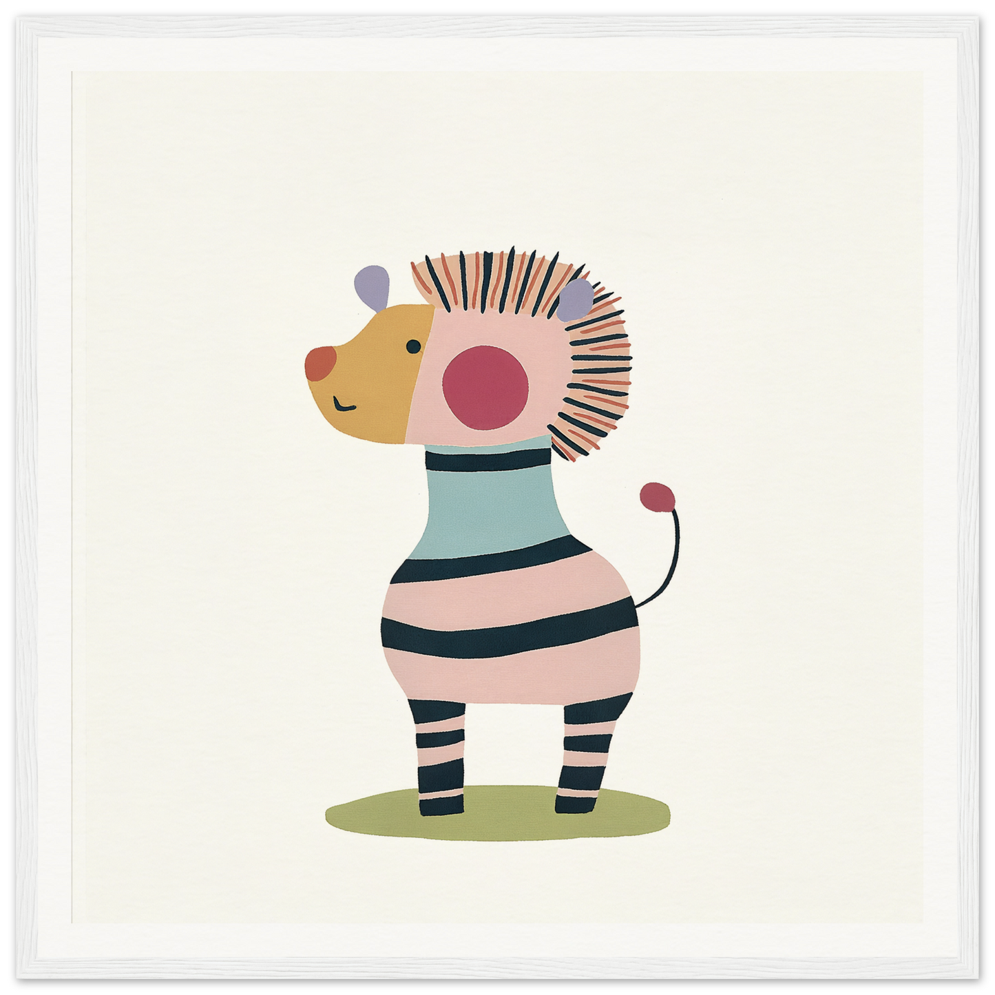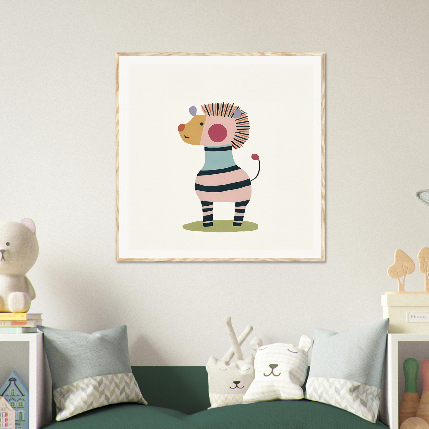 The warm beige background serves as a neutral homage to purity, allowing the vibrant creature in muted pinks and teals to take center stage. The soft hues and bold black stripes offer a gentle yet striking contrast, speaking to the inner child in every viewer.