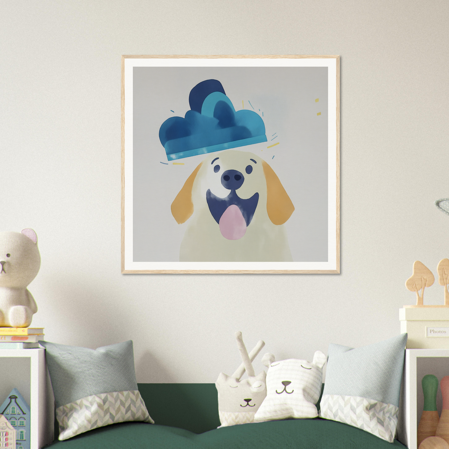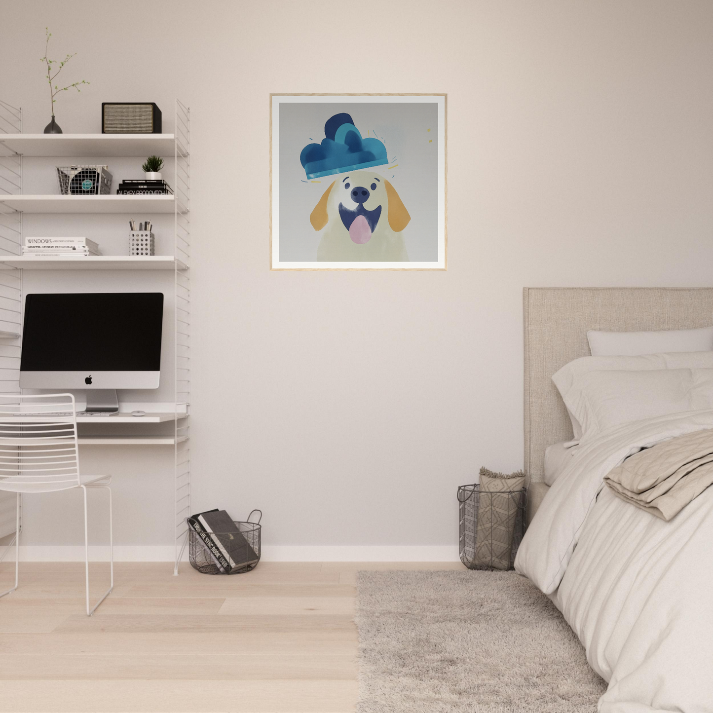 This canvas boasts a soft cream dog body that delicately contrasts with a vivid blue cloud crown, further enlivened by joyful pops of yellow and pink. Perfect for those who wish to infuse their space with a dash of fantasy and light-heartedness.