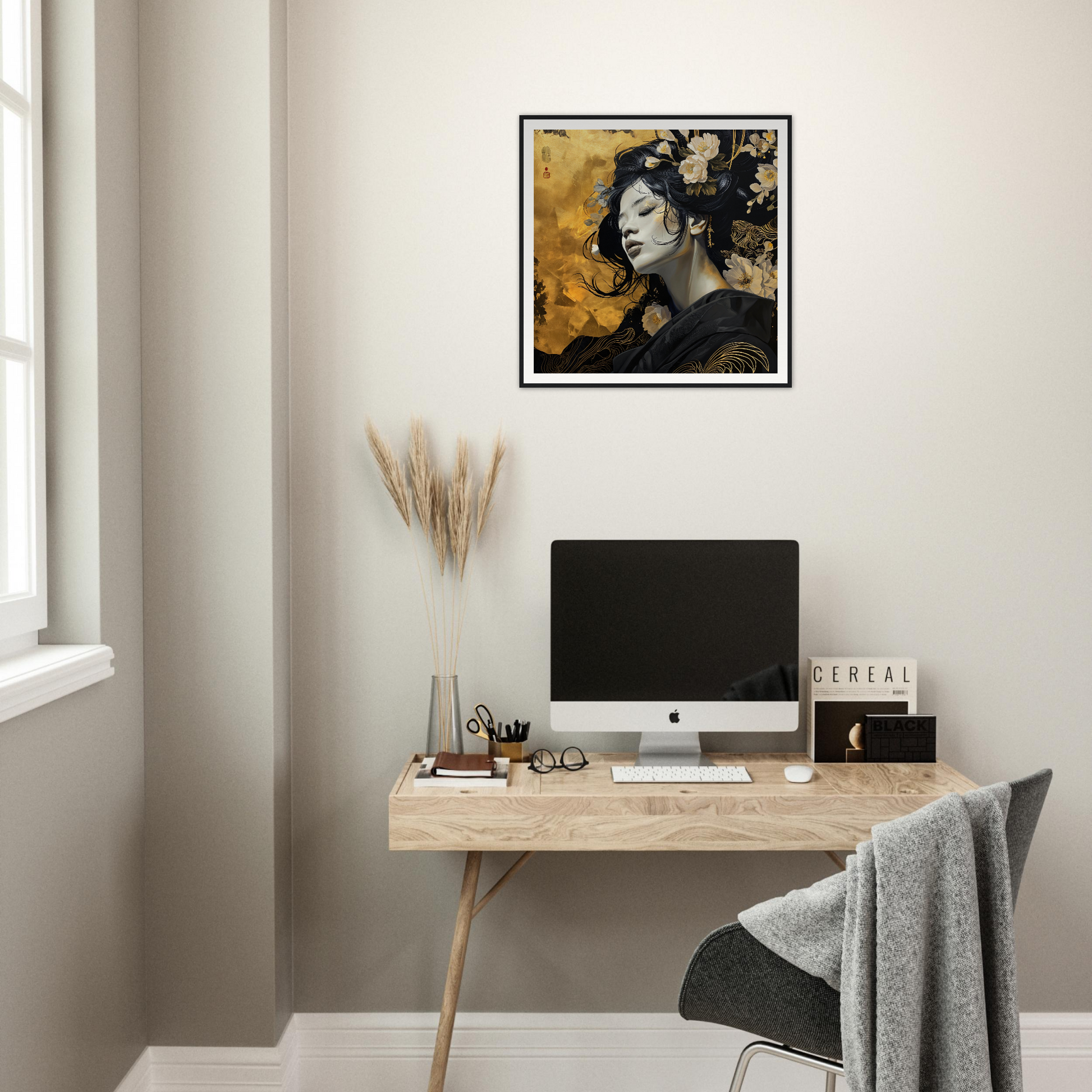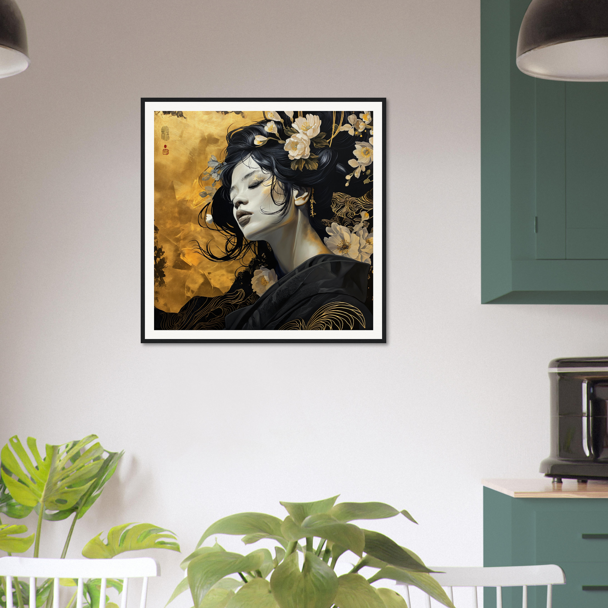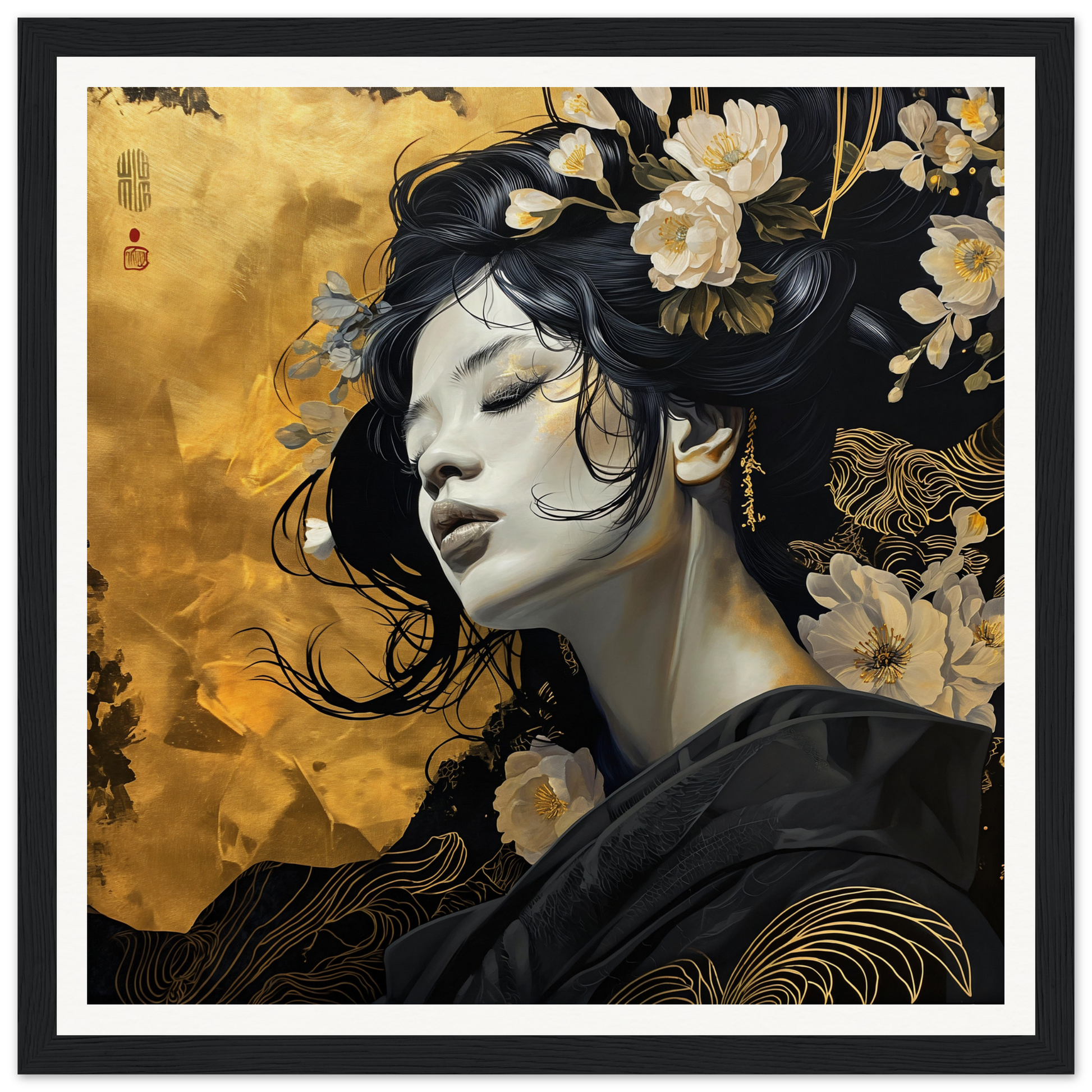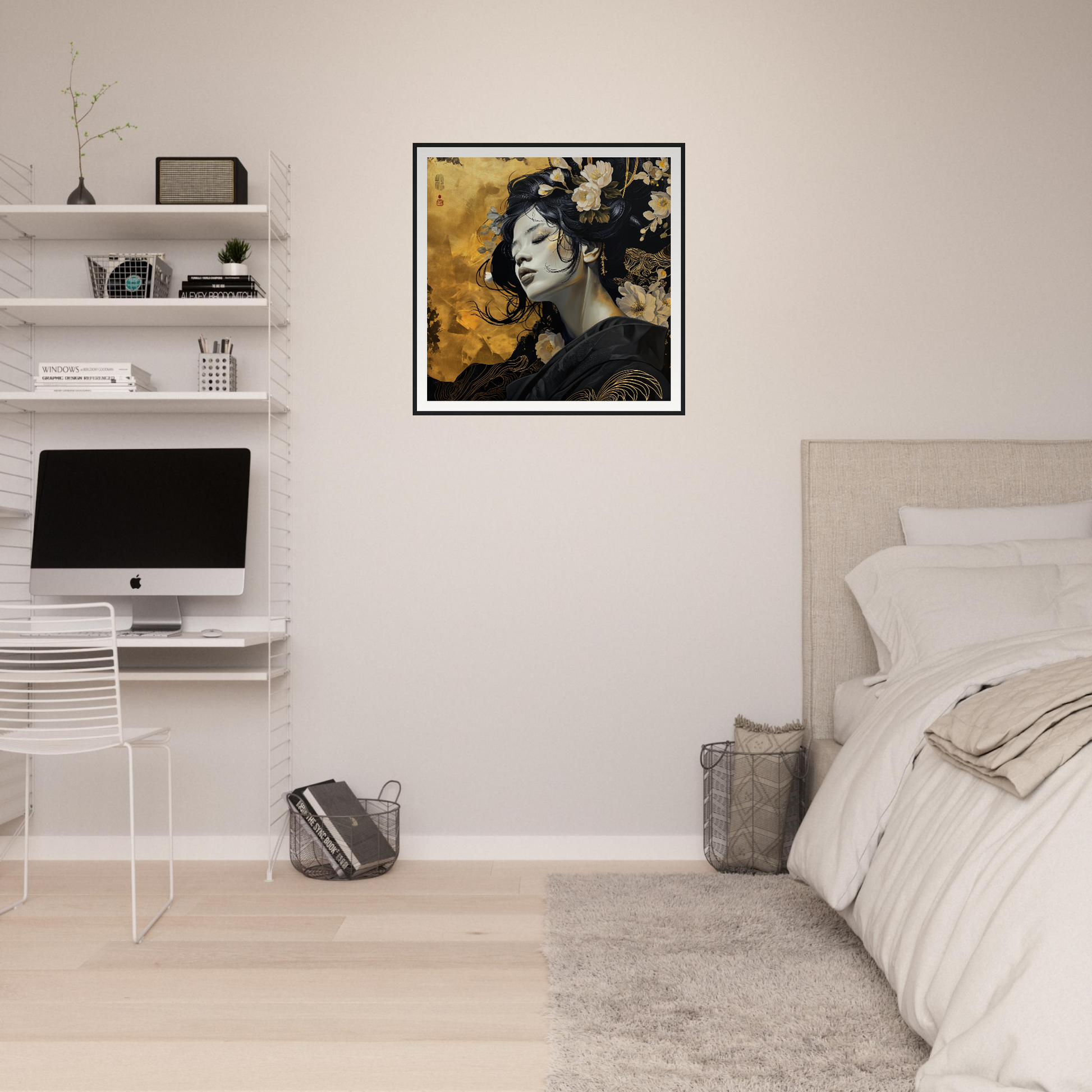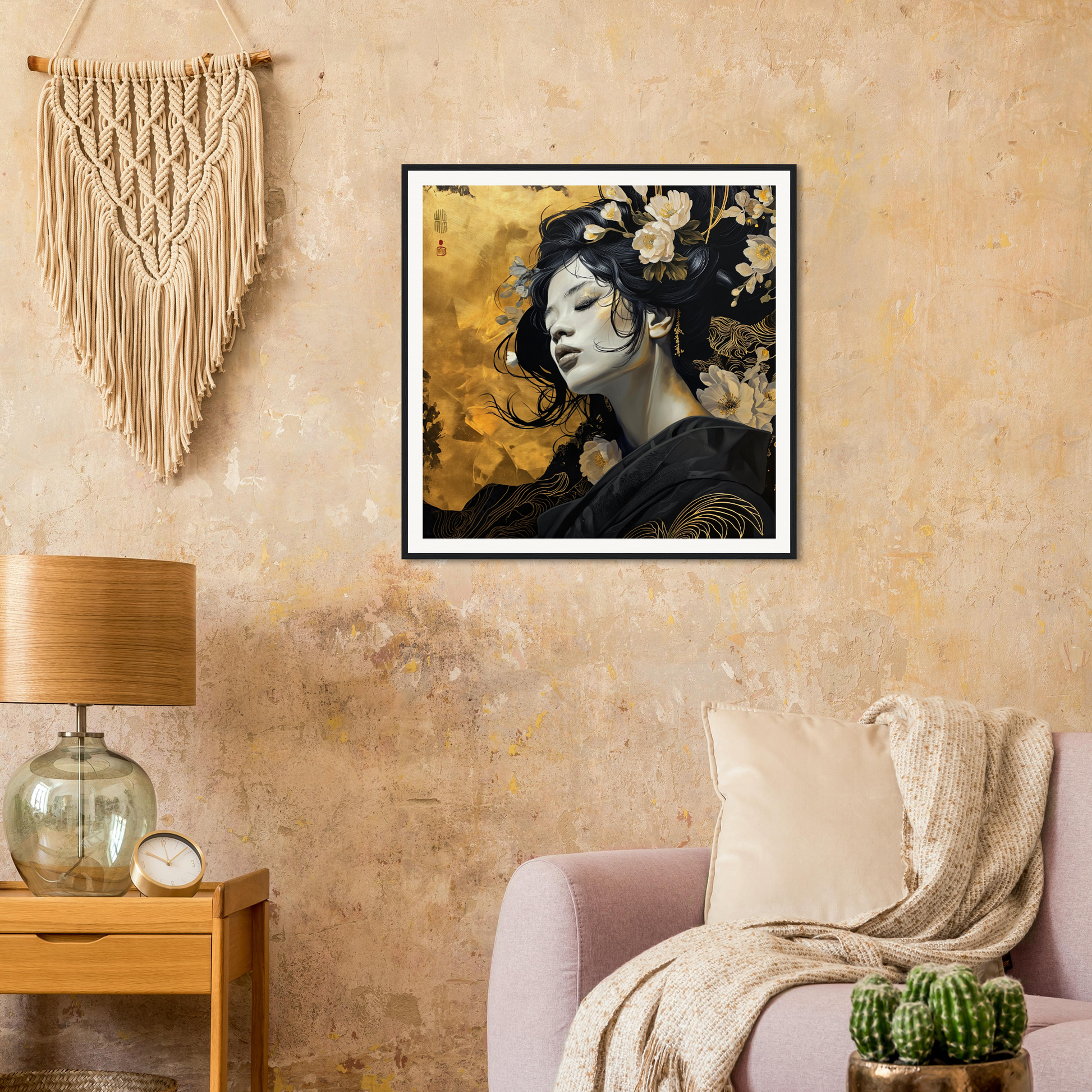 This framed wall art embodies a meditative stillness, encapsulating the ethereal beauty of floral motifs and elegant figure study. The woman, adorned with blooms, offers a harmonious blend of grace, growth, and introspection, perfect for sophisticated bedrooms or serene living spaces.