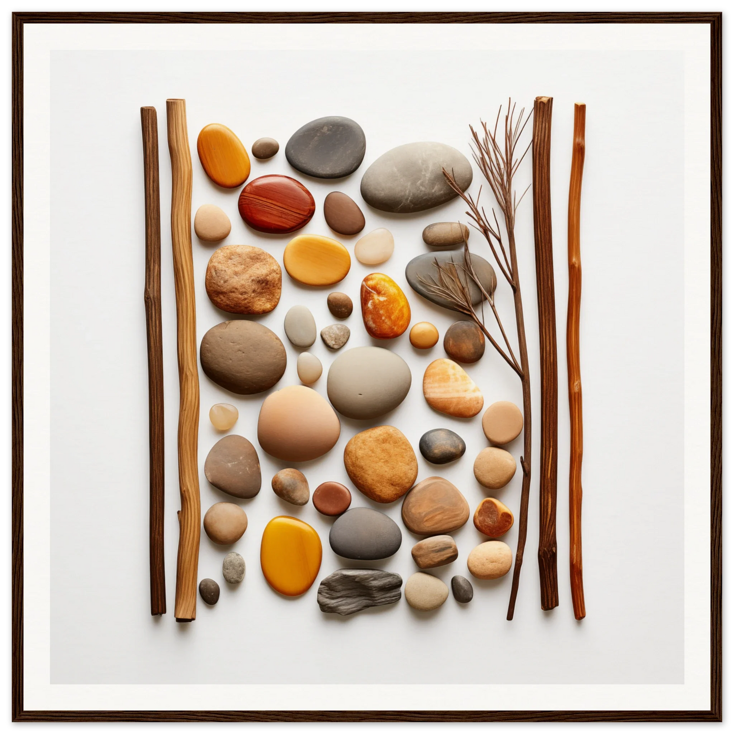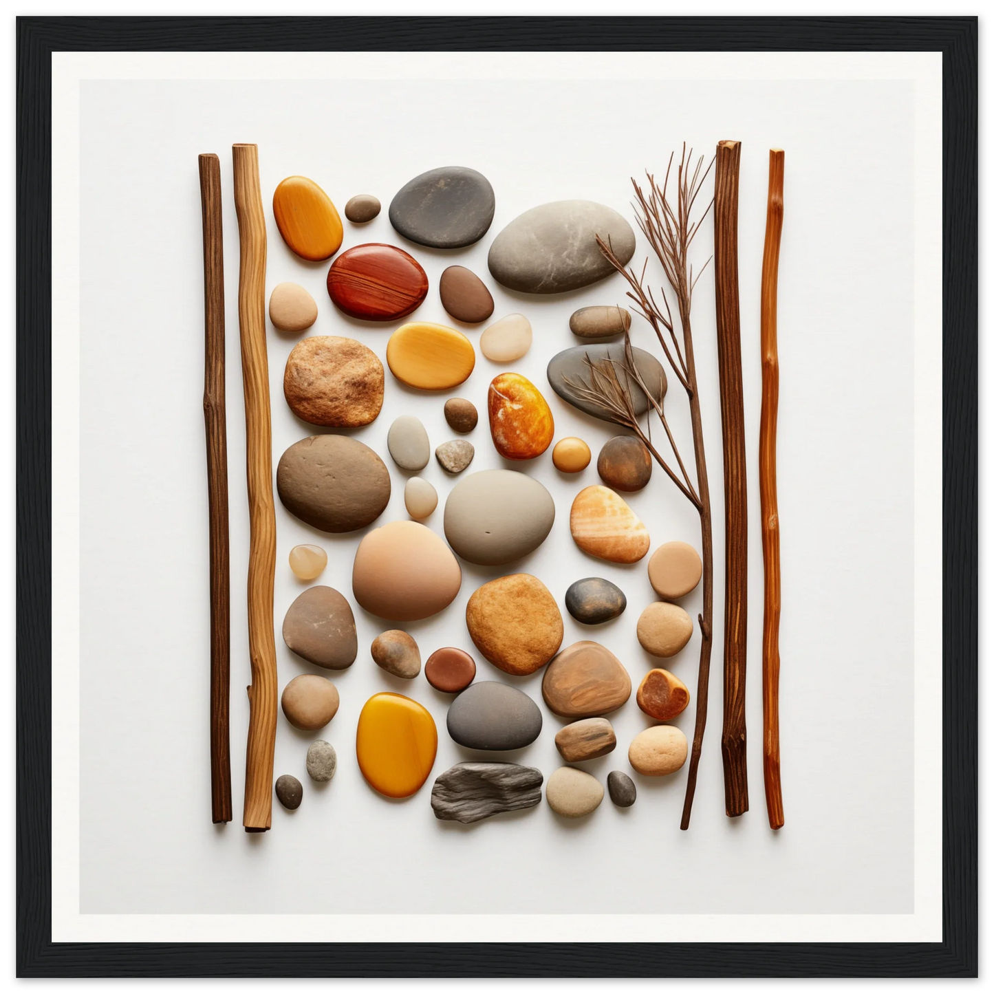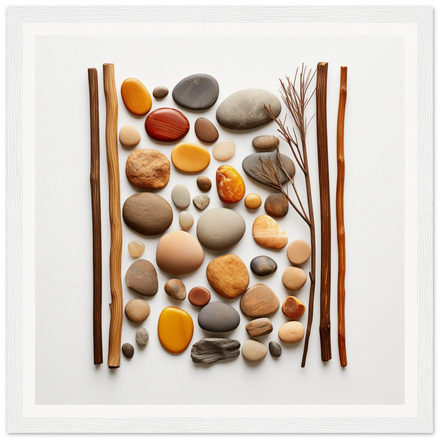 The detailed imagery, portraying stones and sticks in tranquil harmony, brings a sense of calmness to any space. The varying earthy tones of browns, grays, and subtle oranges harmonize beautifully, accented by linear branches that frame the composition.