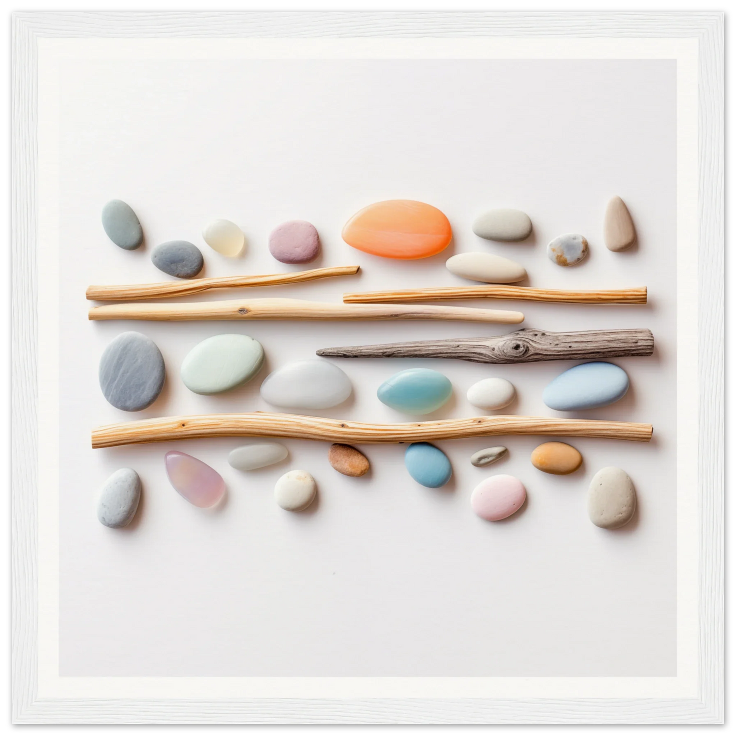 Embrace the meticulous arrangement of polished stones, ranging from gentle pastels to vibrant hues, aligned with driftwood. Let this balanced natural composition infuse your room with tranquility and an artful elegance reminiscent of contemporary minimalism.
