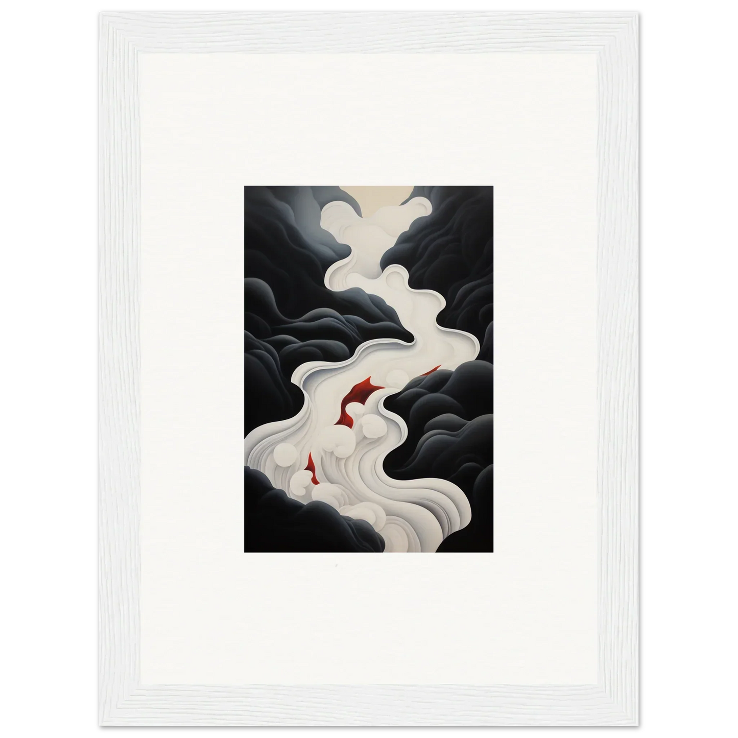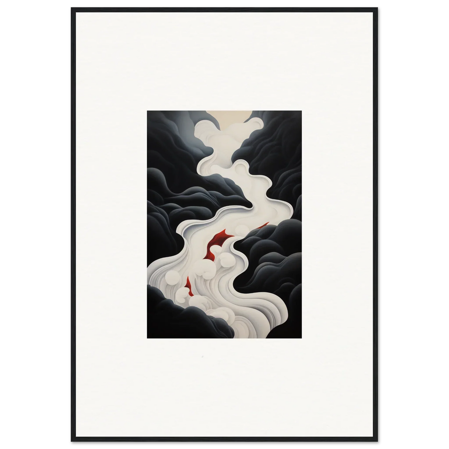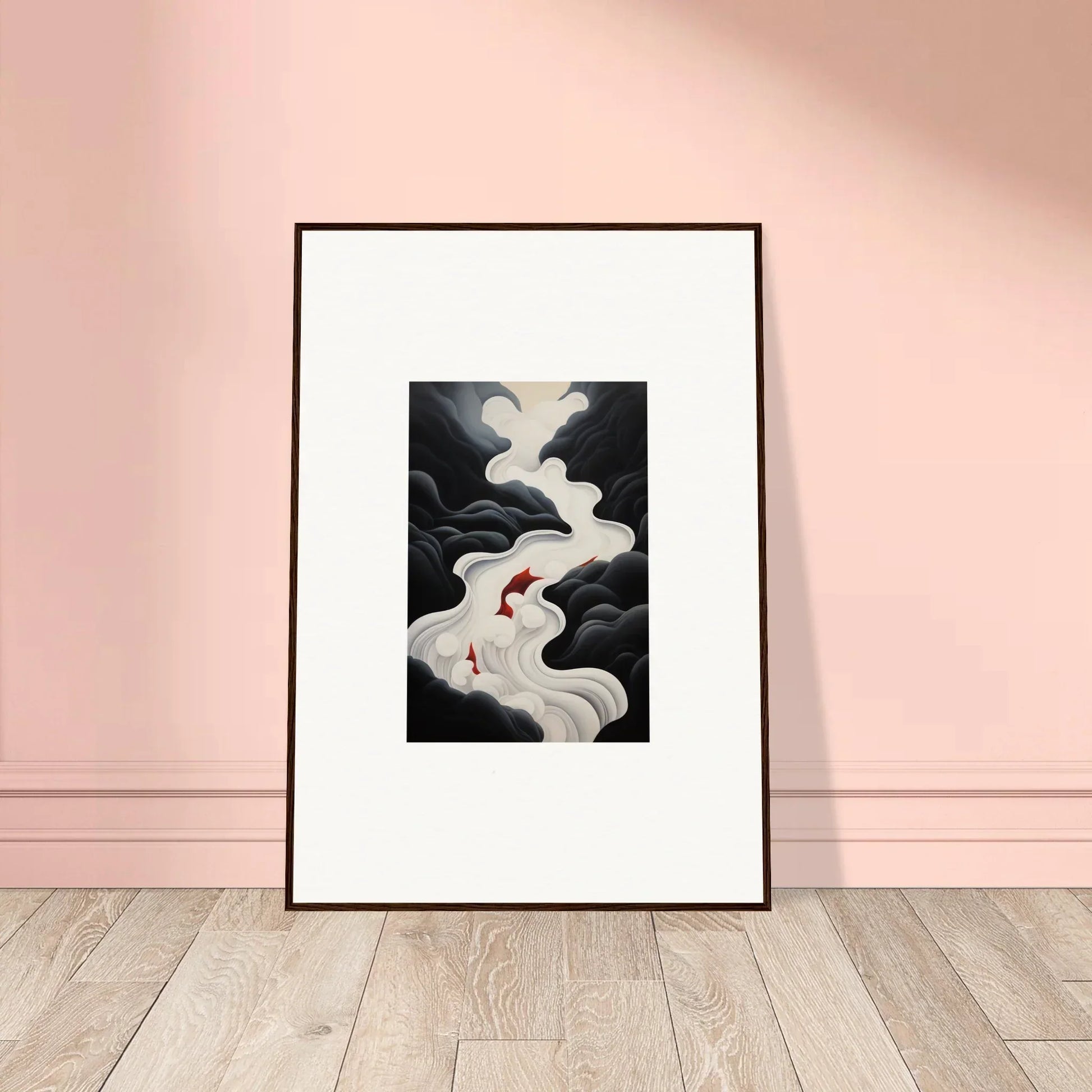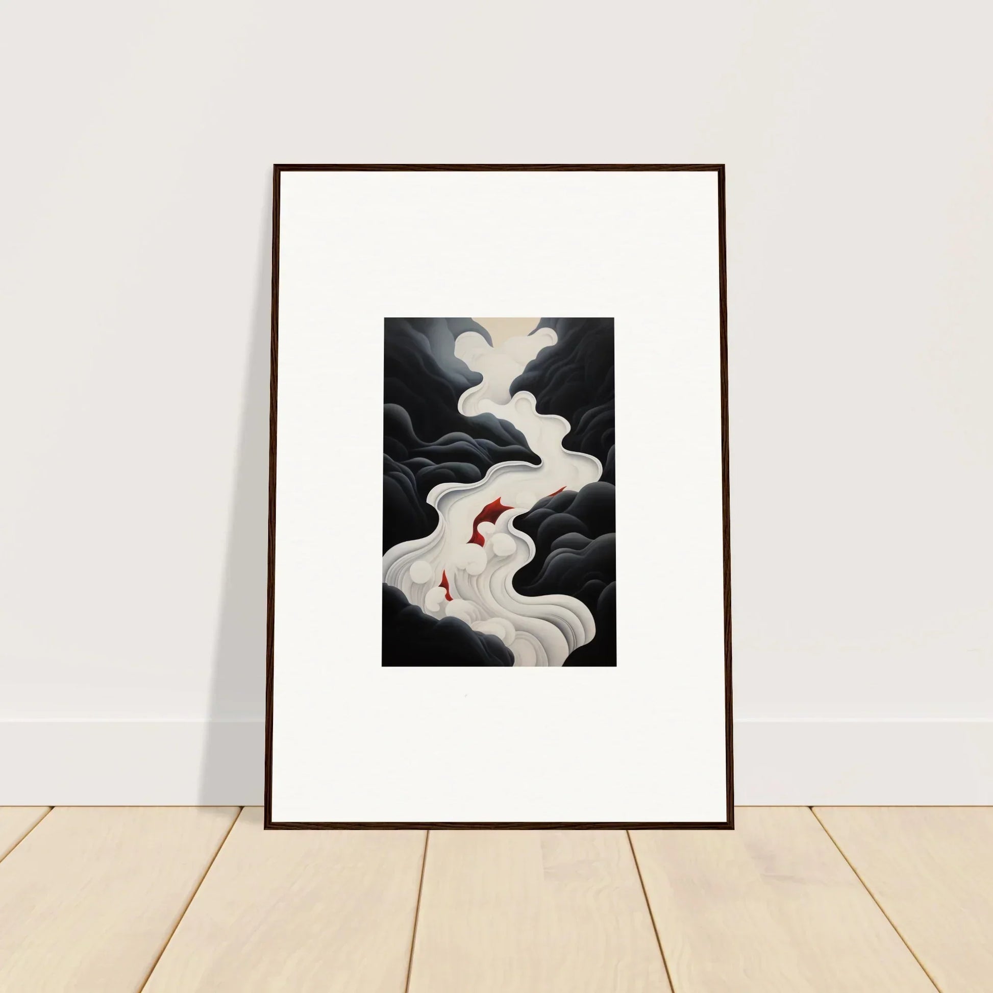 The Ethereal Flux Dream framed wall art, with its complementary red hues and the main black and white tones, fits perfectly in a living room or home office. The mysterious and serene mood adds depth and intrigue to any space.