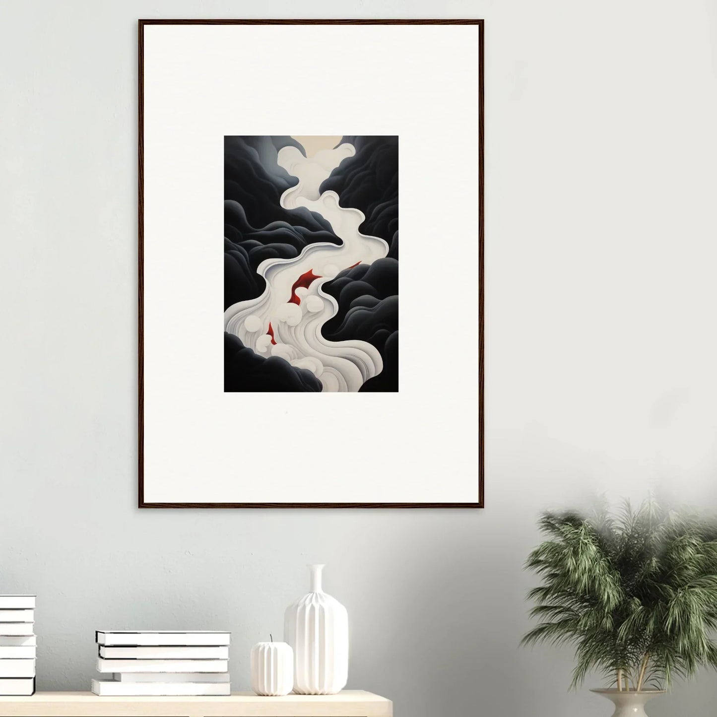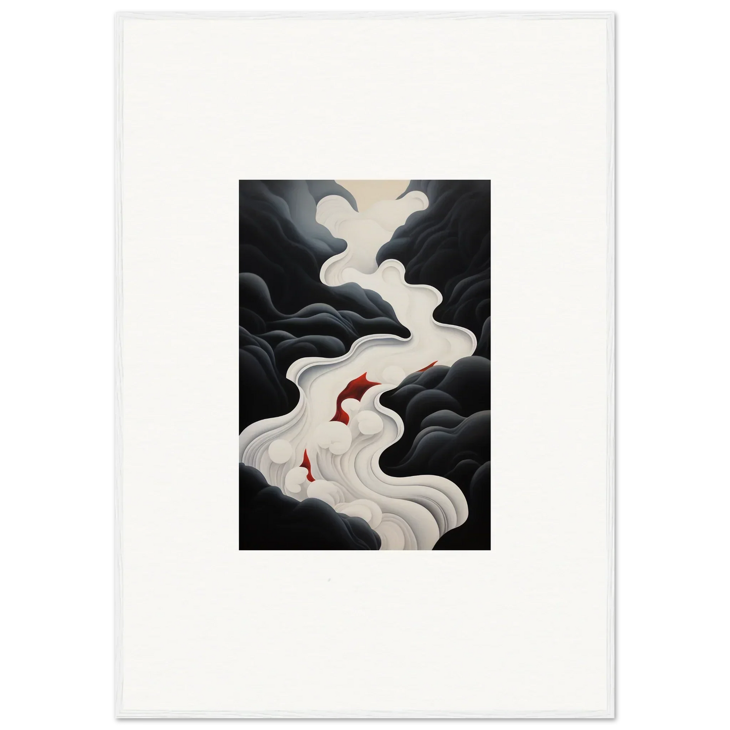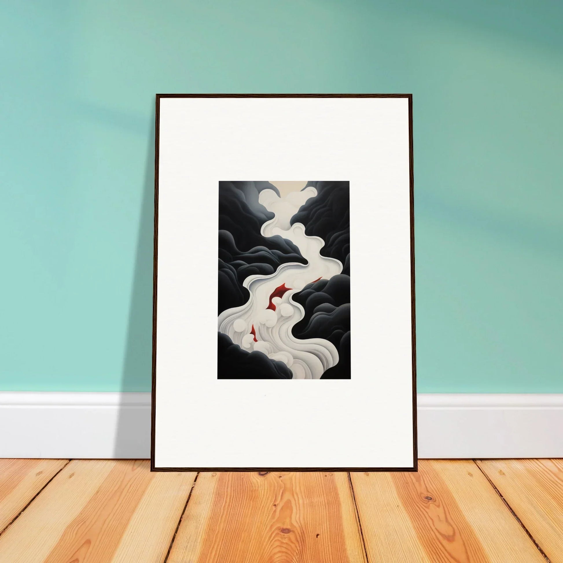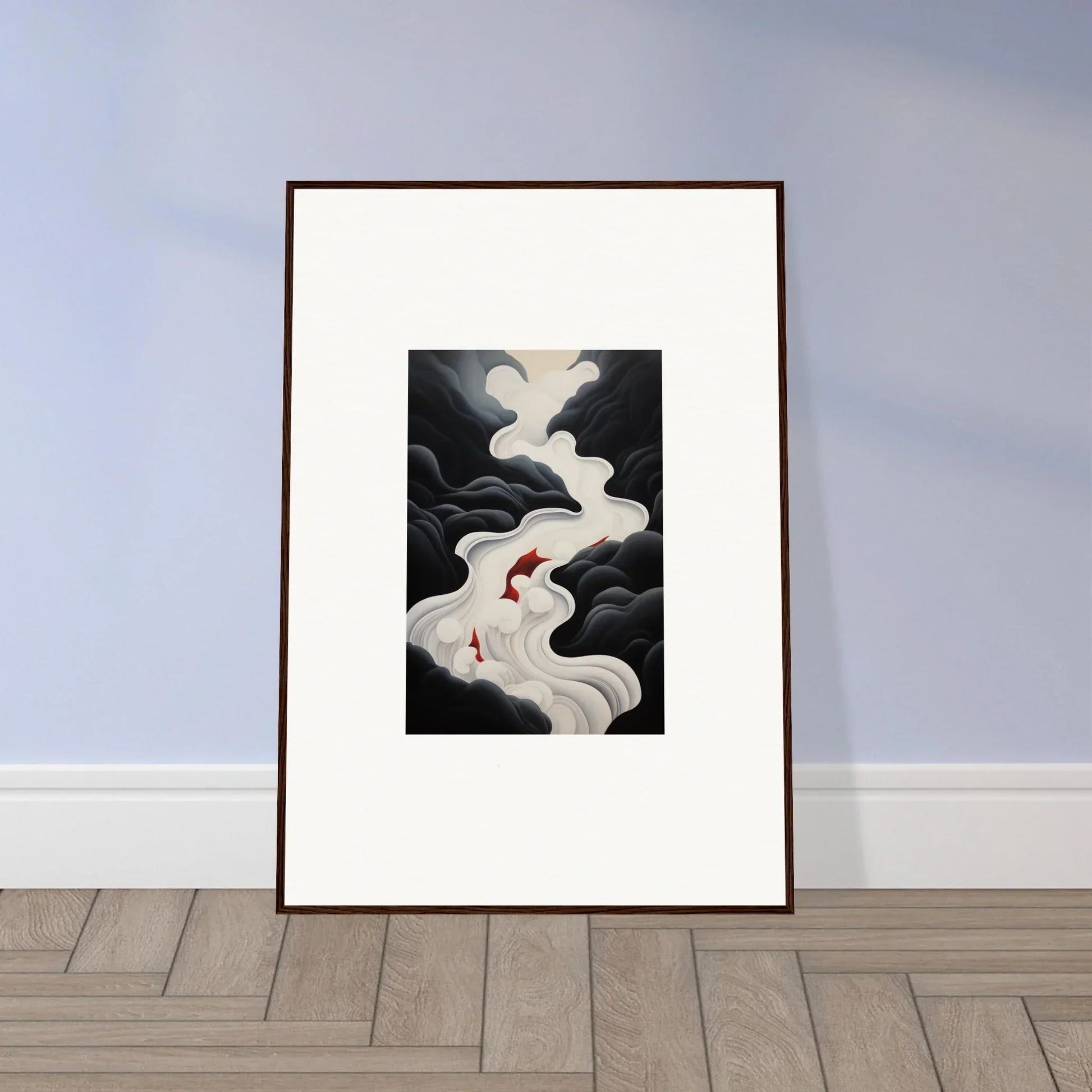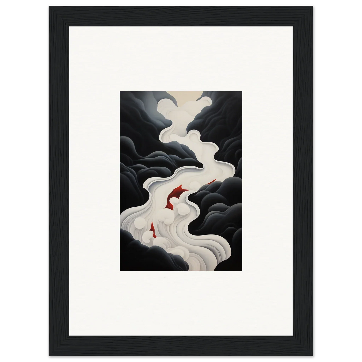 The Ethereal Flux Dream framed wall art, with its complementary red hues and the main black and white tones, fits perfectly in a living room or home office. The mysterious and serene mood adds depth and intrigue to any space.