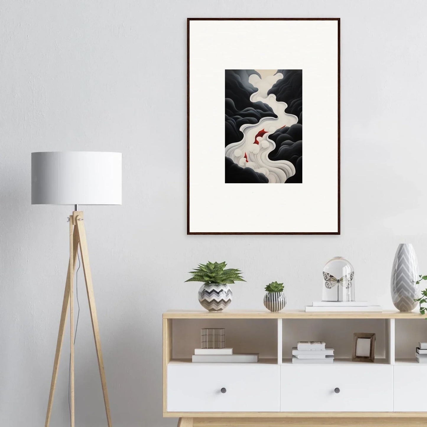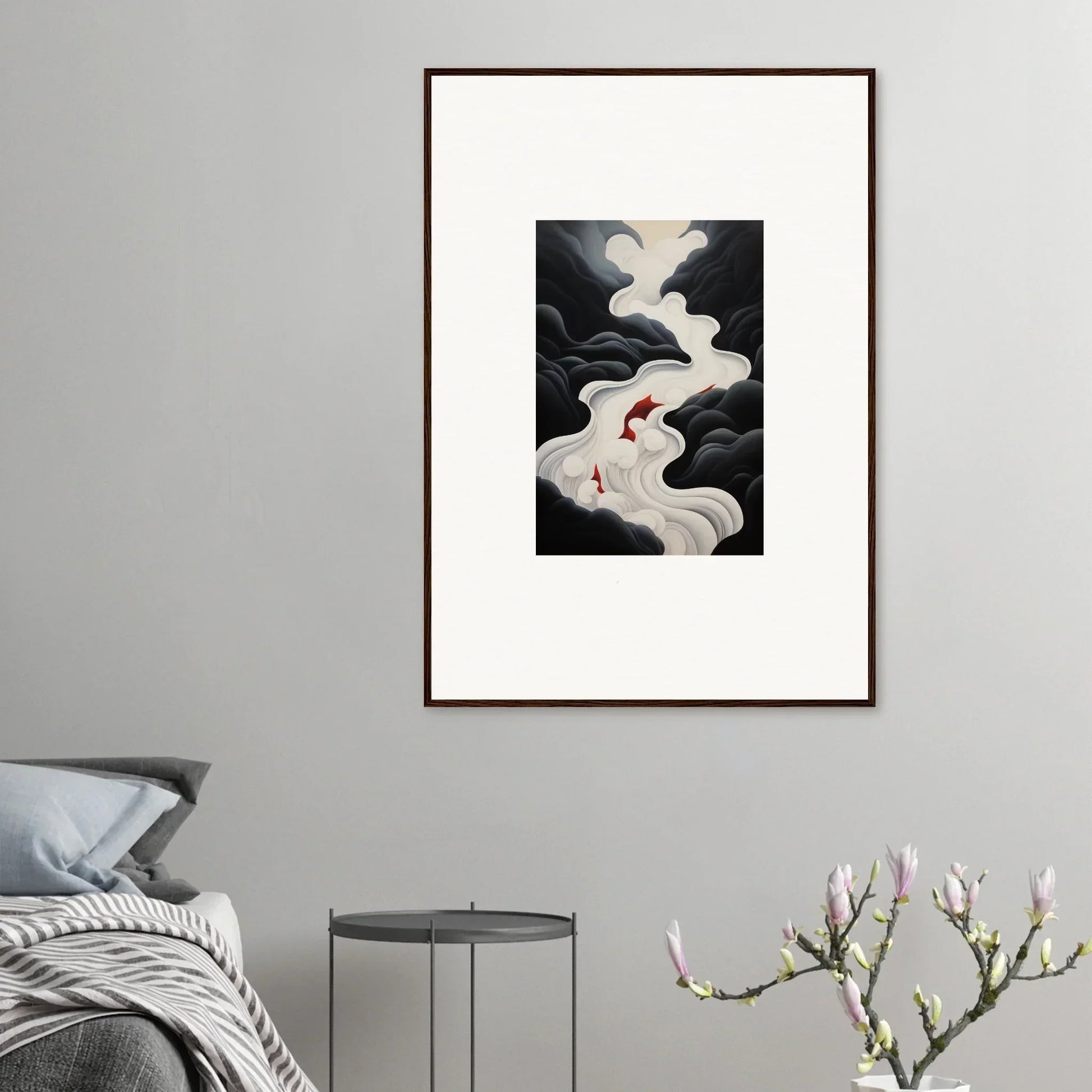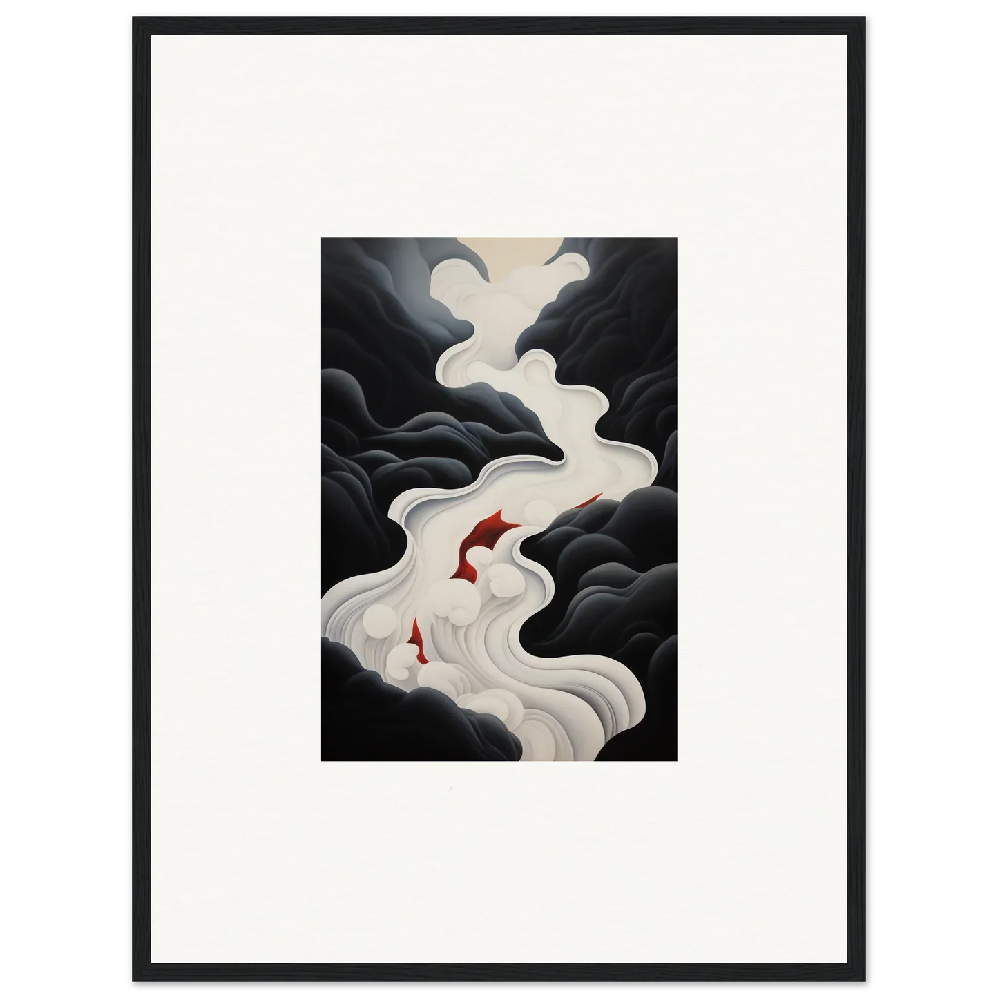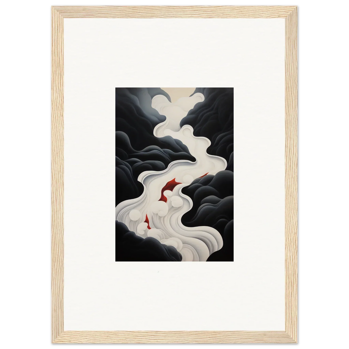 The Ethereal Flux Dream framed wall art, with its complementary red hues and the main black and white tones, fits perfectly in a living room or home office. The mysterious and serene mood adds depth and intrigue to any space.