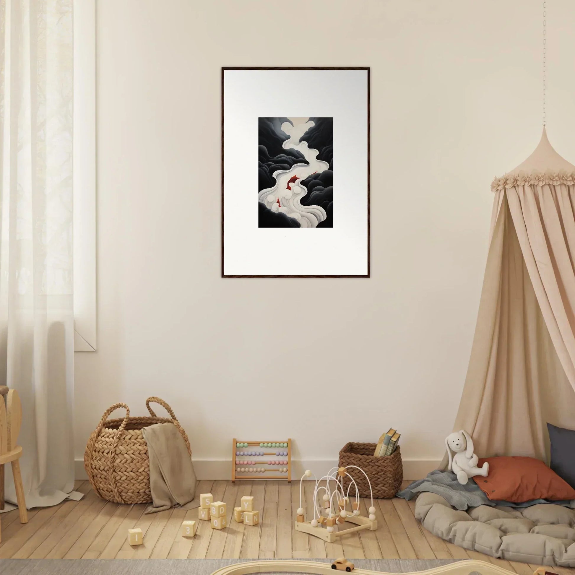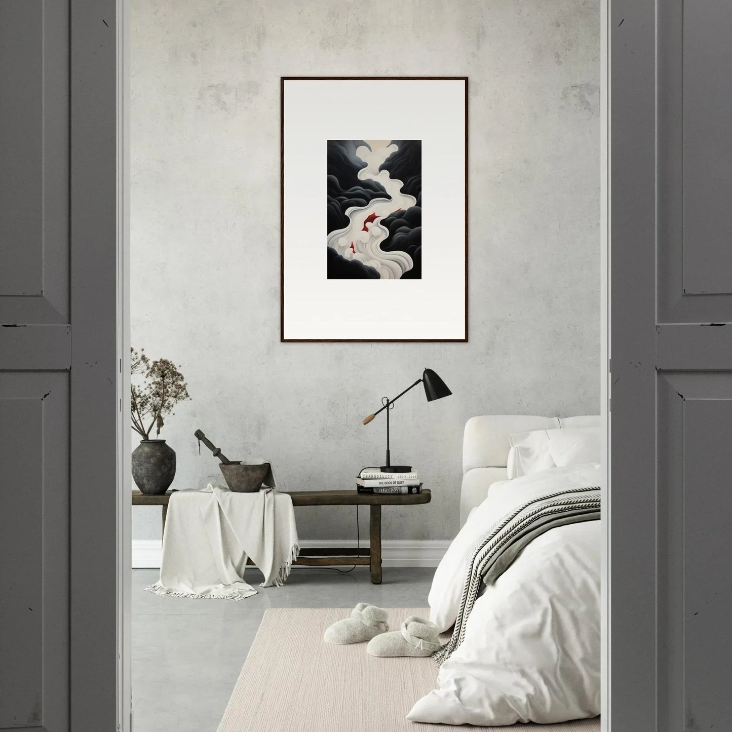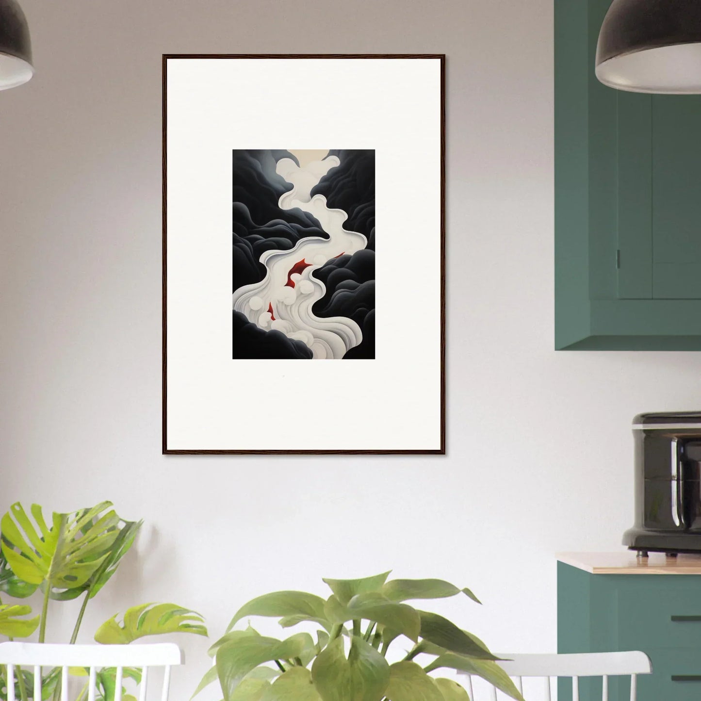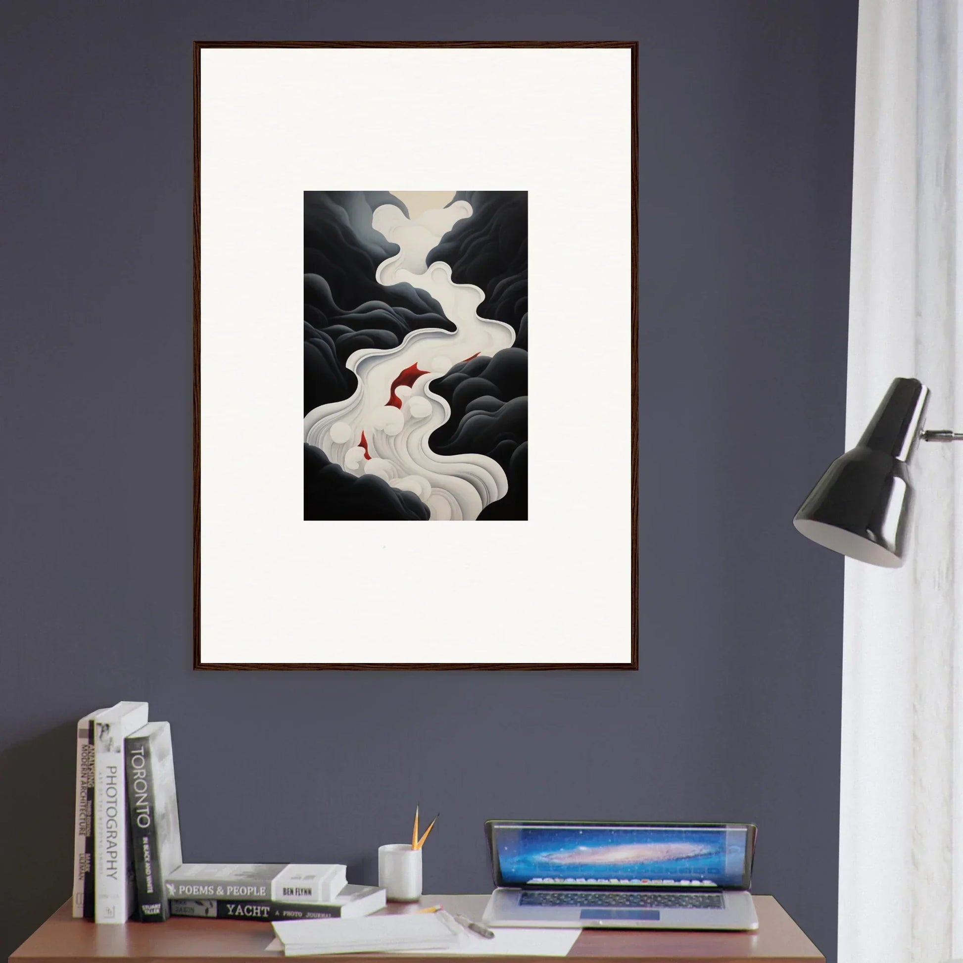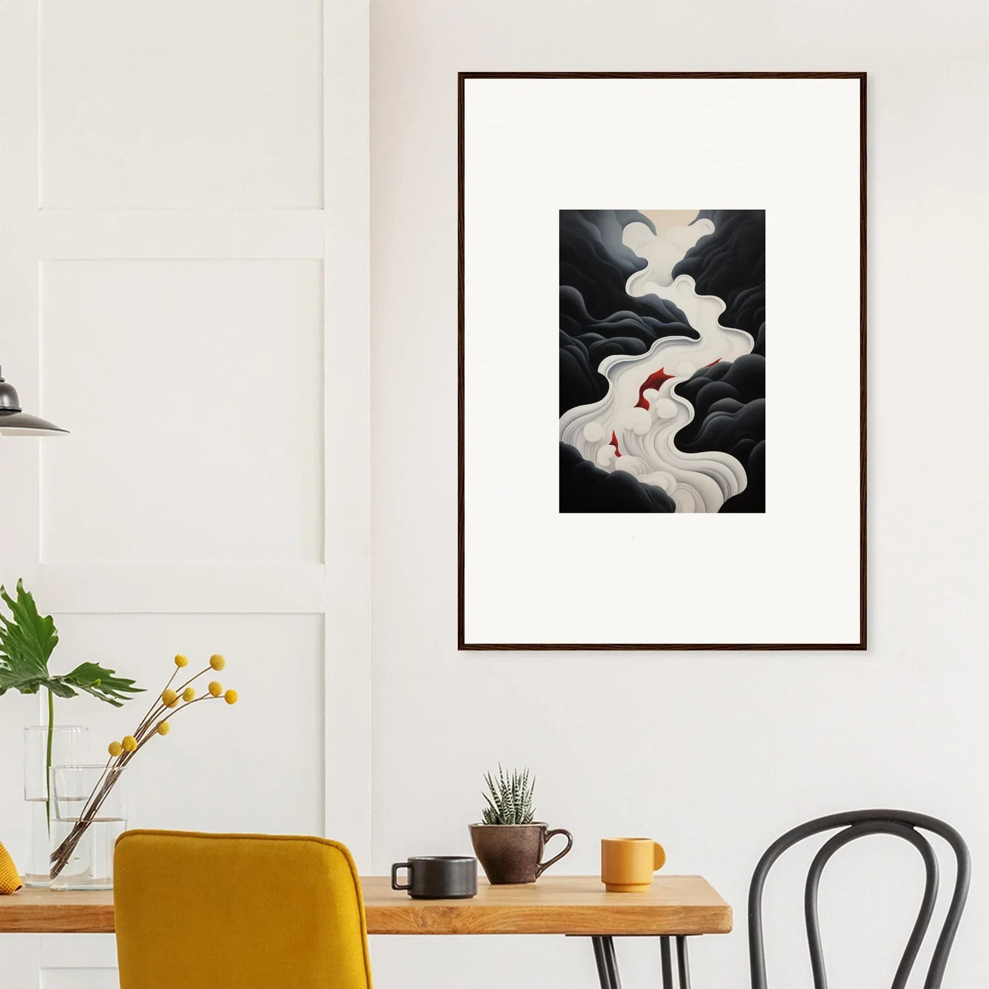 The Ethereal Flux Dream framed wall art, with its complementary red hues and the main black and white tones, fits perfectly in a living room or home office. The mysterious and serene mood adds depth and intrigue to any space.