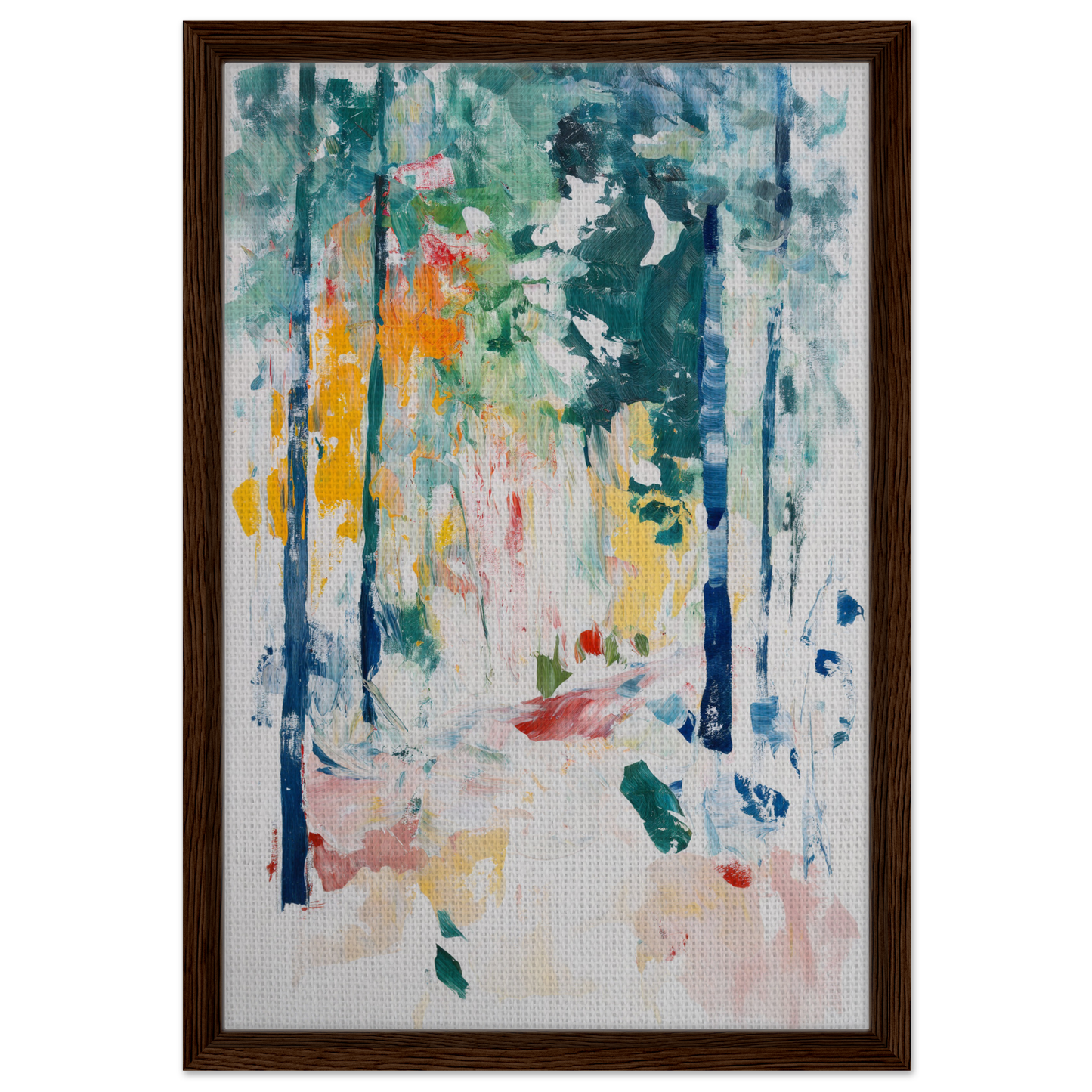 Be embraced by hues of cool greens and blues portraying the serene foliage, with vivid strokes of yellow and orange capturing sunlight like fleeting golden whispers. Framed with sustainable wood—choose from Black, Natural Wood, or Dark Brown—it offers a snug yet elegant fit to your living room, office, or even bedroom. The harmonious blend of colors adds tranquility and warmth, making vibrant spaces alive with a sense of peace.