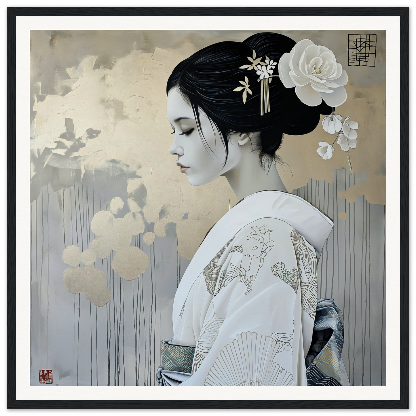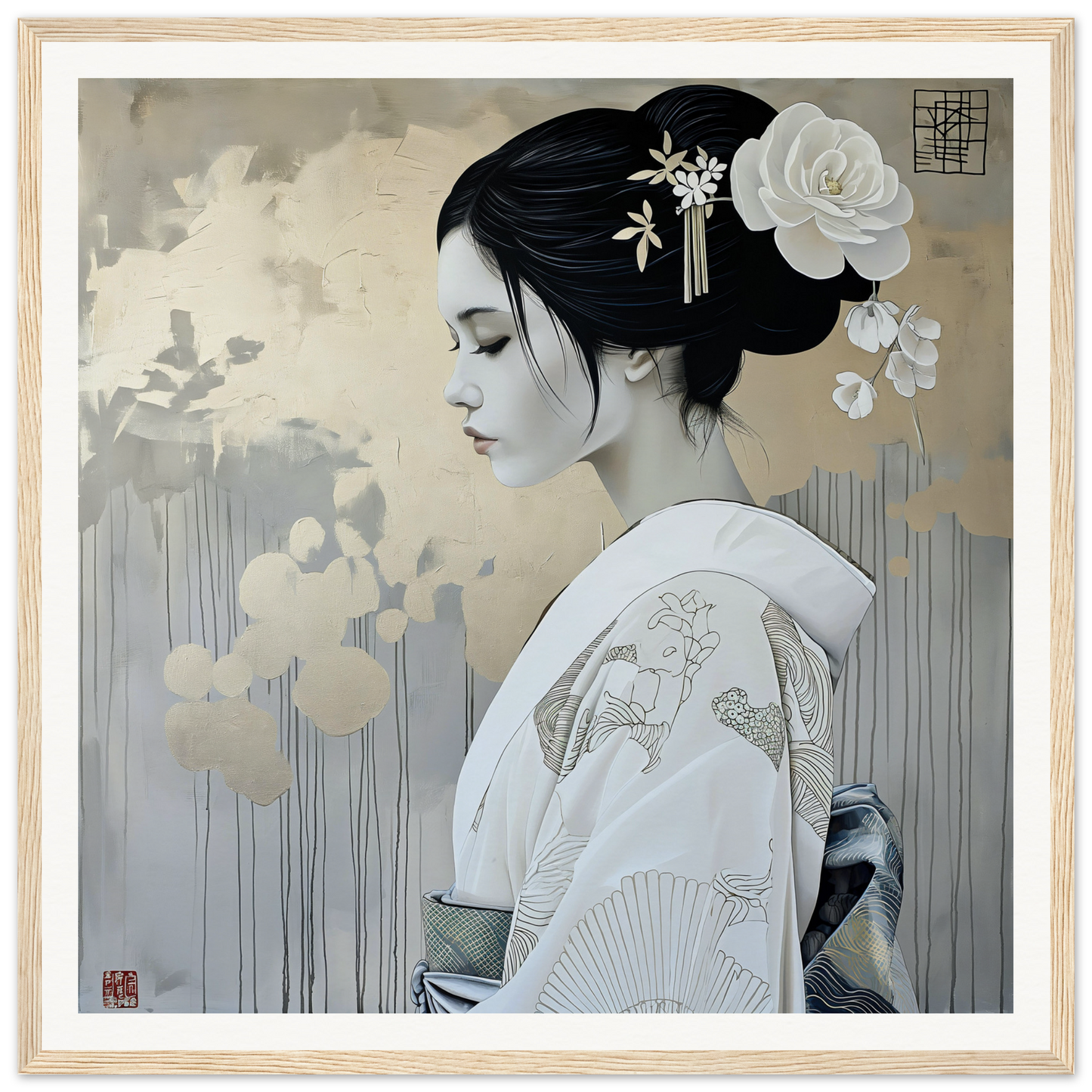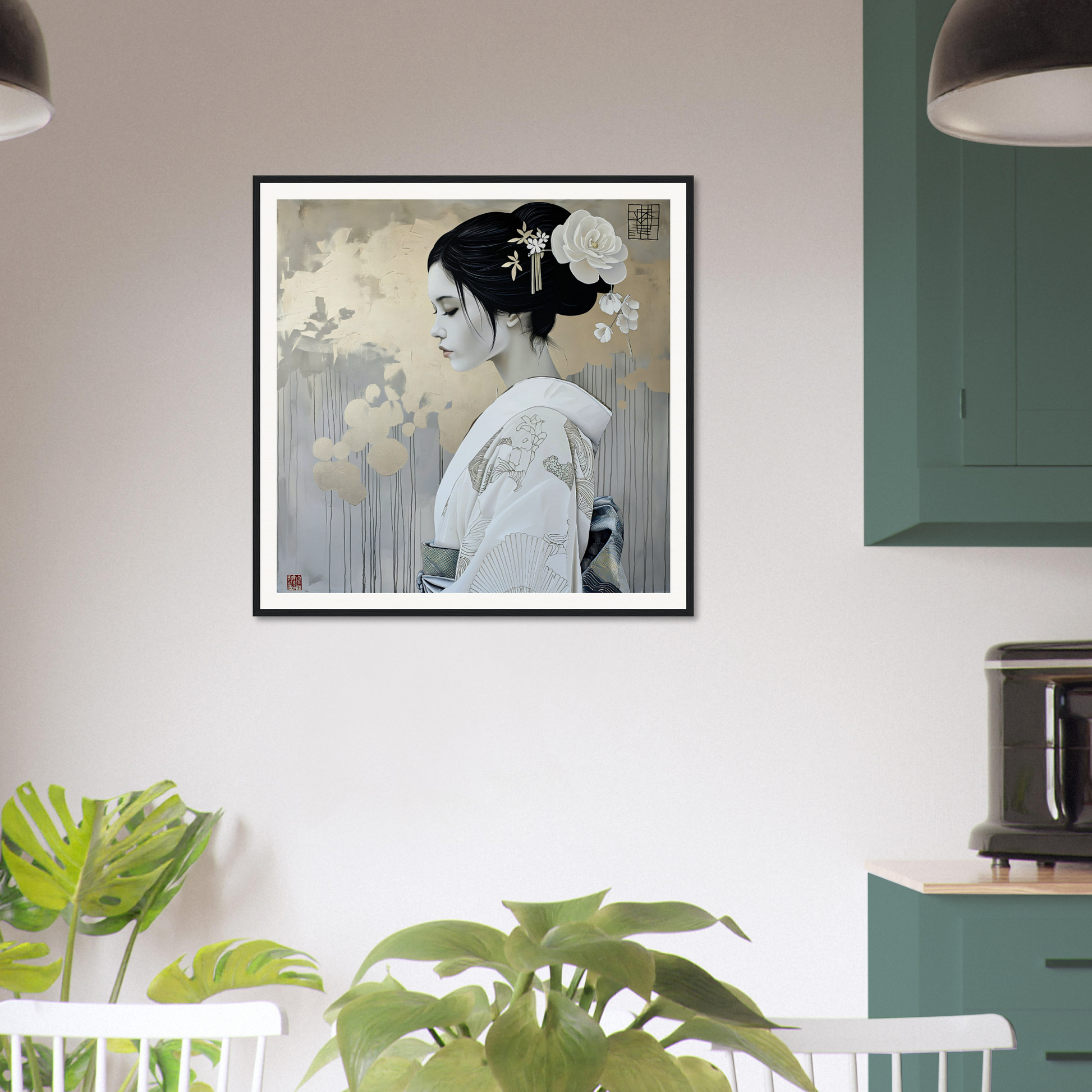 Printed on archival museum-quality paper, each element folded in the artwork blooms in vibrancy—the intricate kimono and floral nuances speak volumes. The luxurious off-white, uncoated finish provides unrivaled art appreciation.