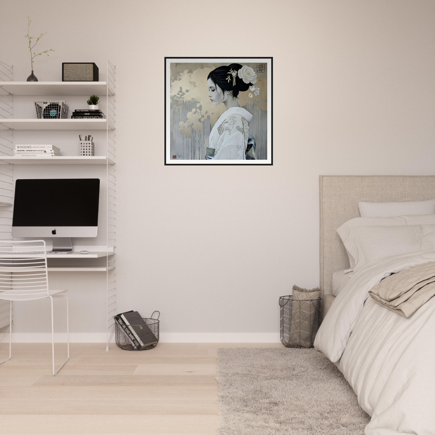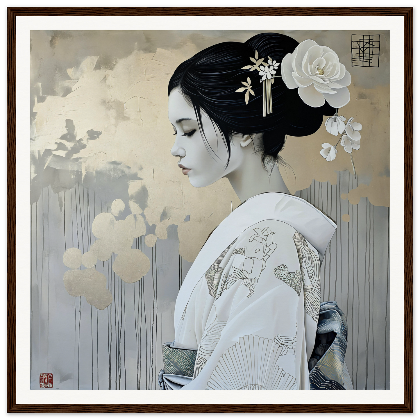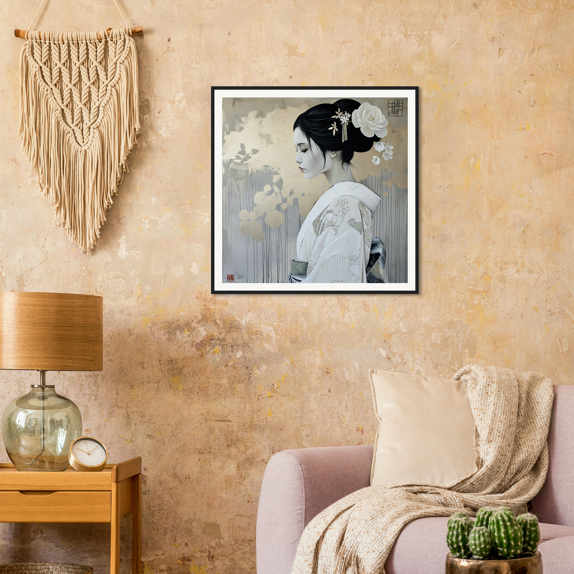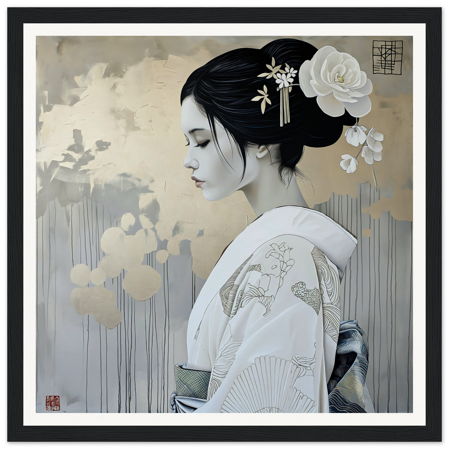 Printed on archival museum-quality paper, each element folded in the artwork blooms in vibrancy—the intricate kimono and floral nuances speak volumes. The luxurious off-white, uncoated finish provides unrivaled art appreciation.