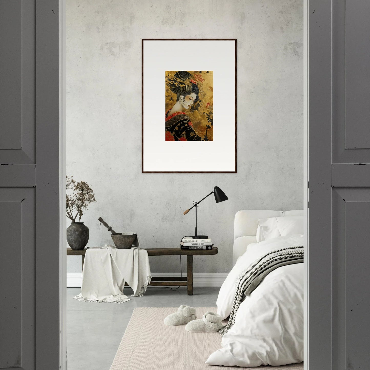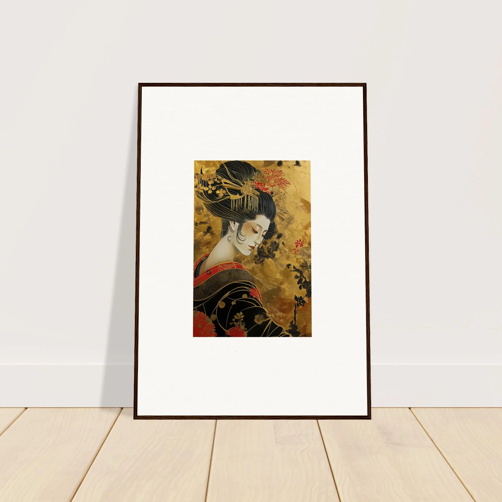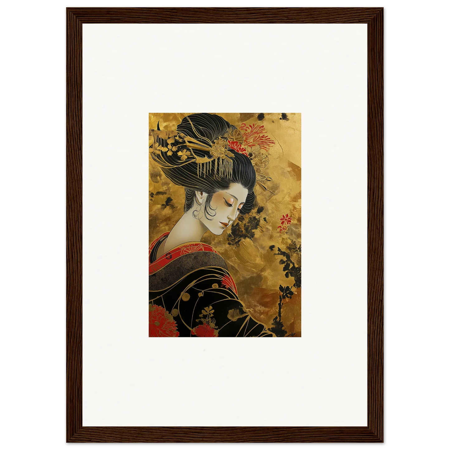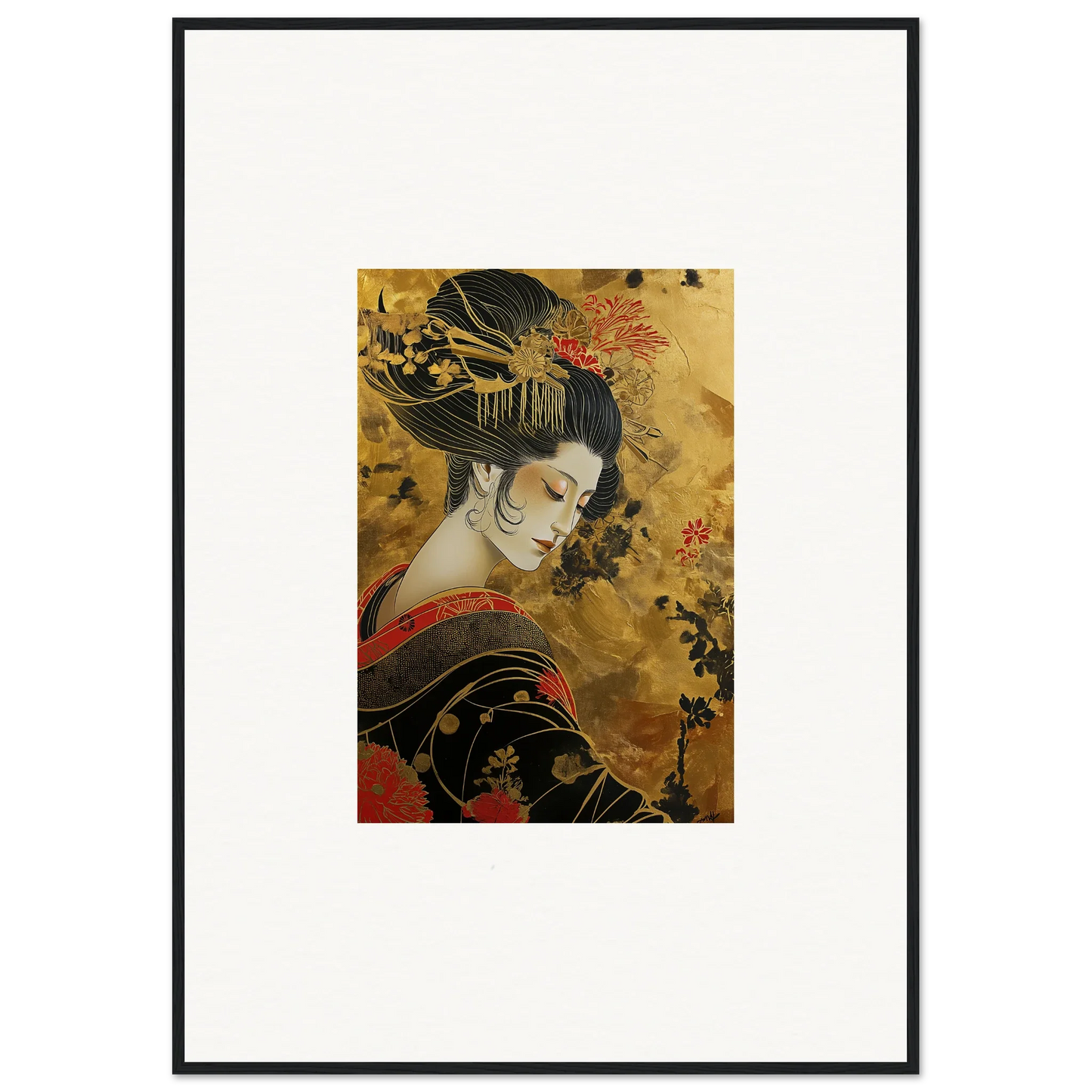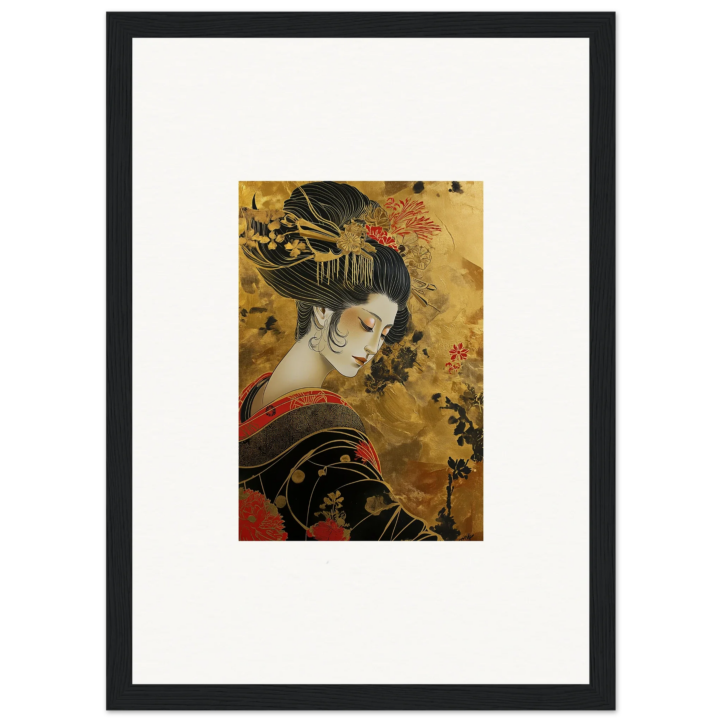 This exquisite piece is designed to bring a sense of serenity and luxury to any bedroom or living room. The harmonious blend of complementary colors, with black and gold as the main palette, captures the essence of Japanese art and world culture portraits. Its big margins command attention, making it an eye-catching centerpiece.