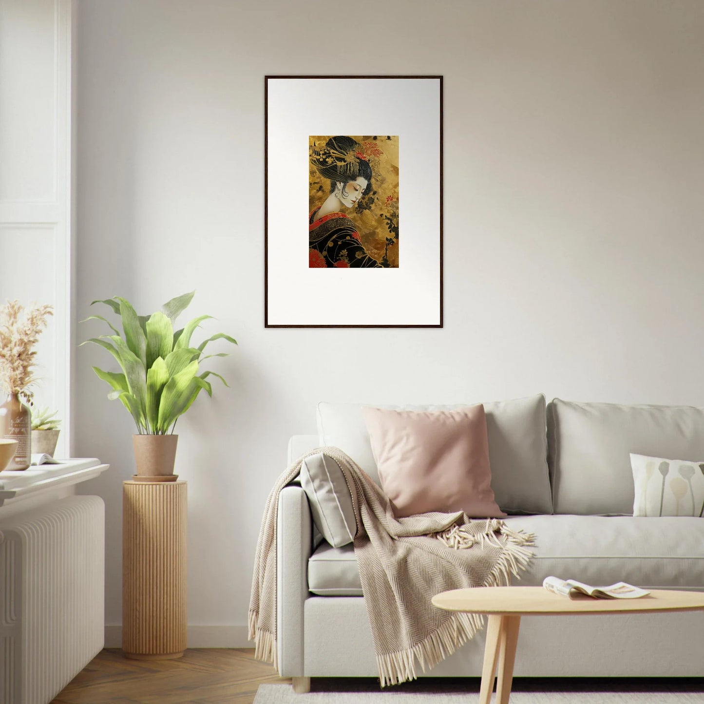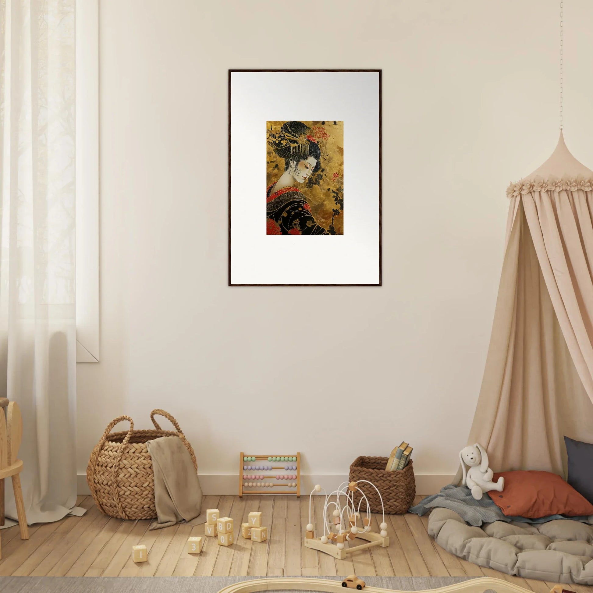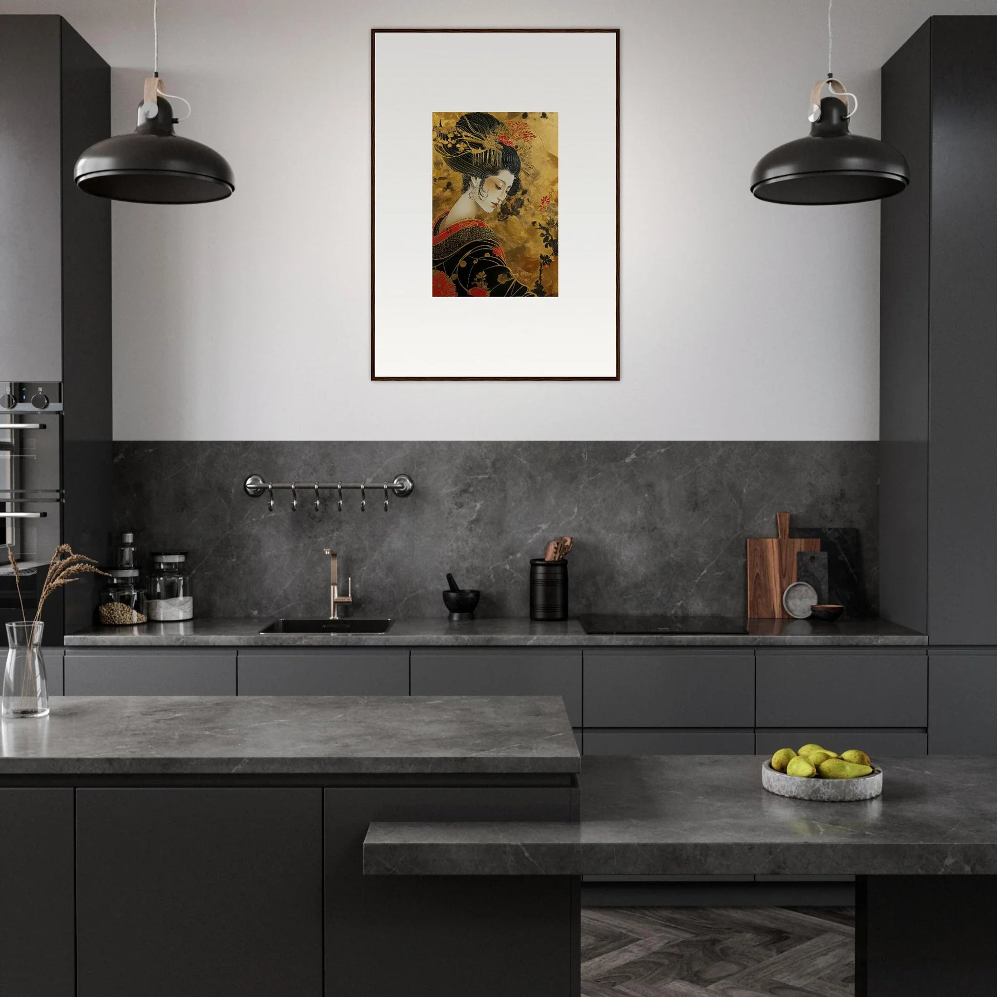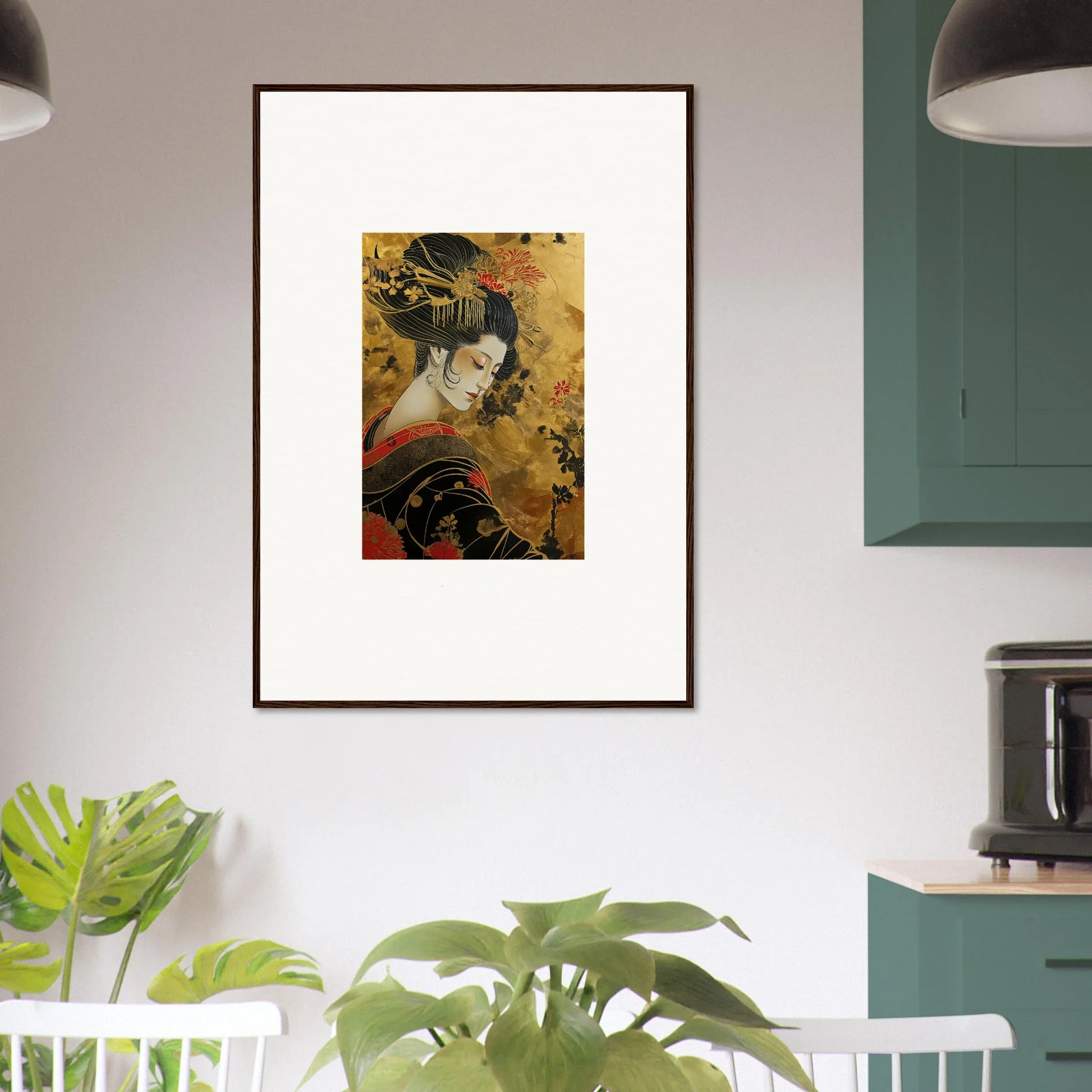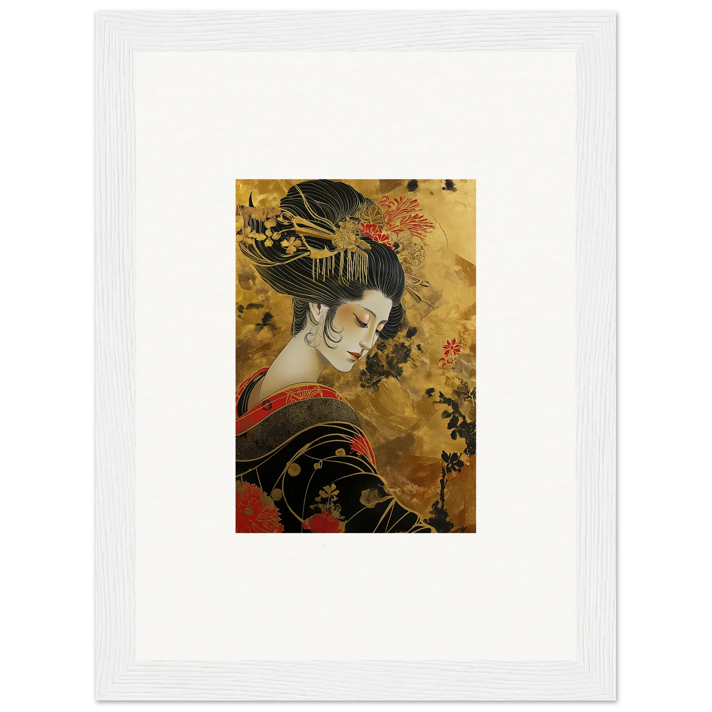 This exquisite piece is designed to bring a sense of serenity and luxury to any bedroom or living room. The harmonious blend of complementary colors, with black and gold as the main palette, captures the essence of Japanese art and world culture portraits. Its big margins command attention, making it an eye-catching centerpiece.