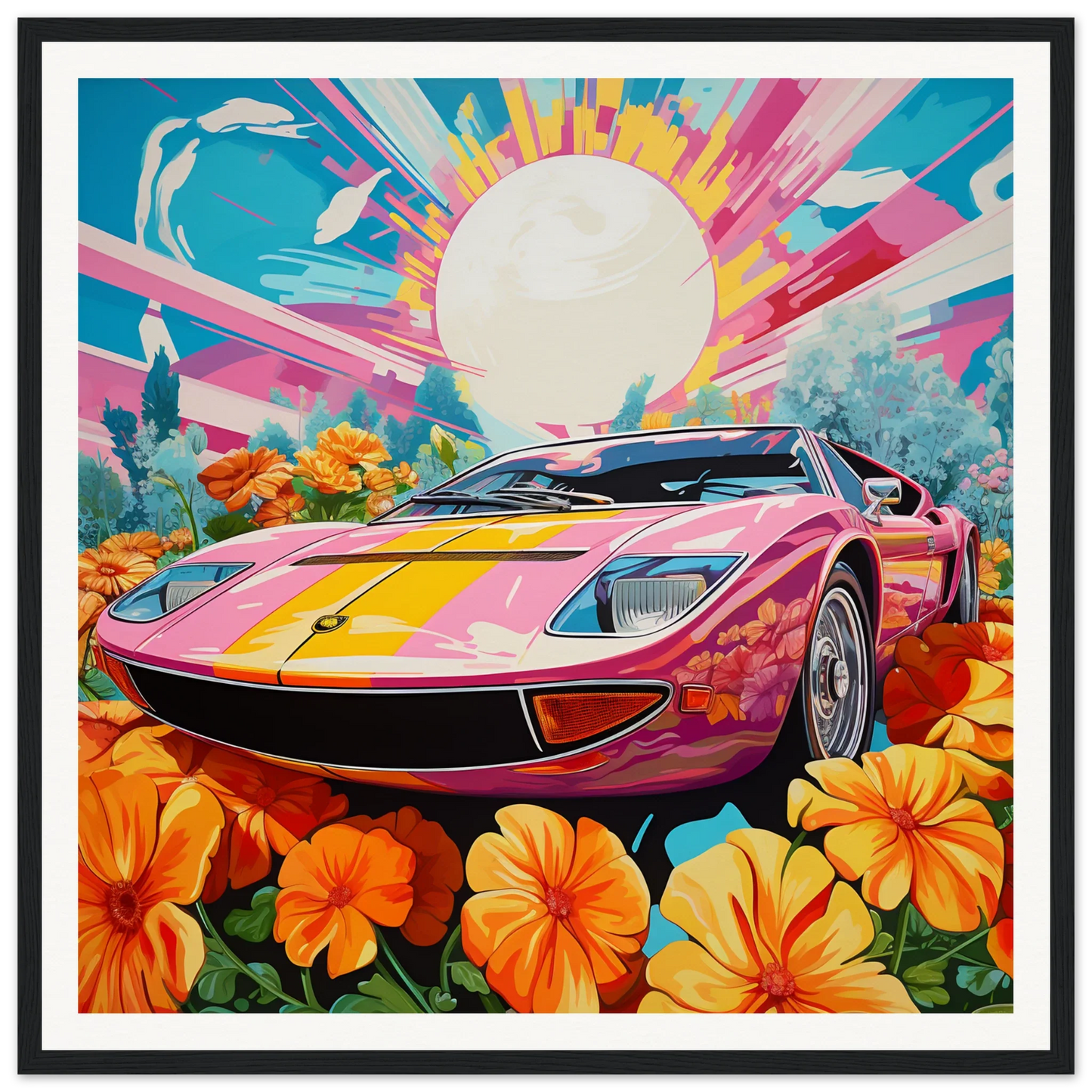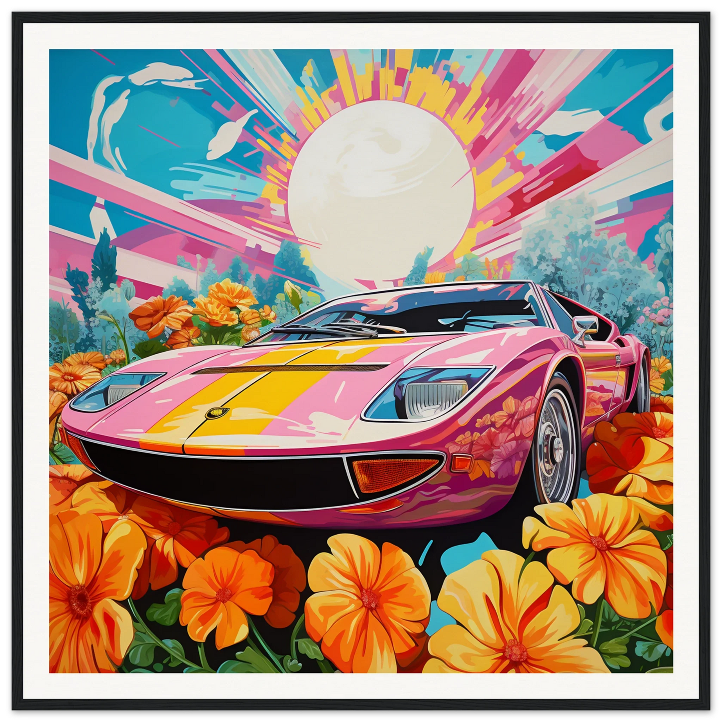 Step into a world where vibrant colors and futuristic design combine to create an artwork unlike any other. Our Floral Futurism Odyssey Framed Wall Art, created with cutting-edge AI image generation, transports you to a surreal realm where a colorful sports car races through fields of colossal flowers under an abstract sun. It’s more than just art; it's an invitation to adventure.