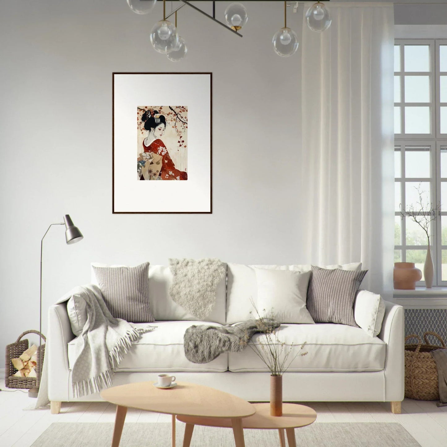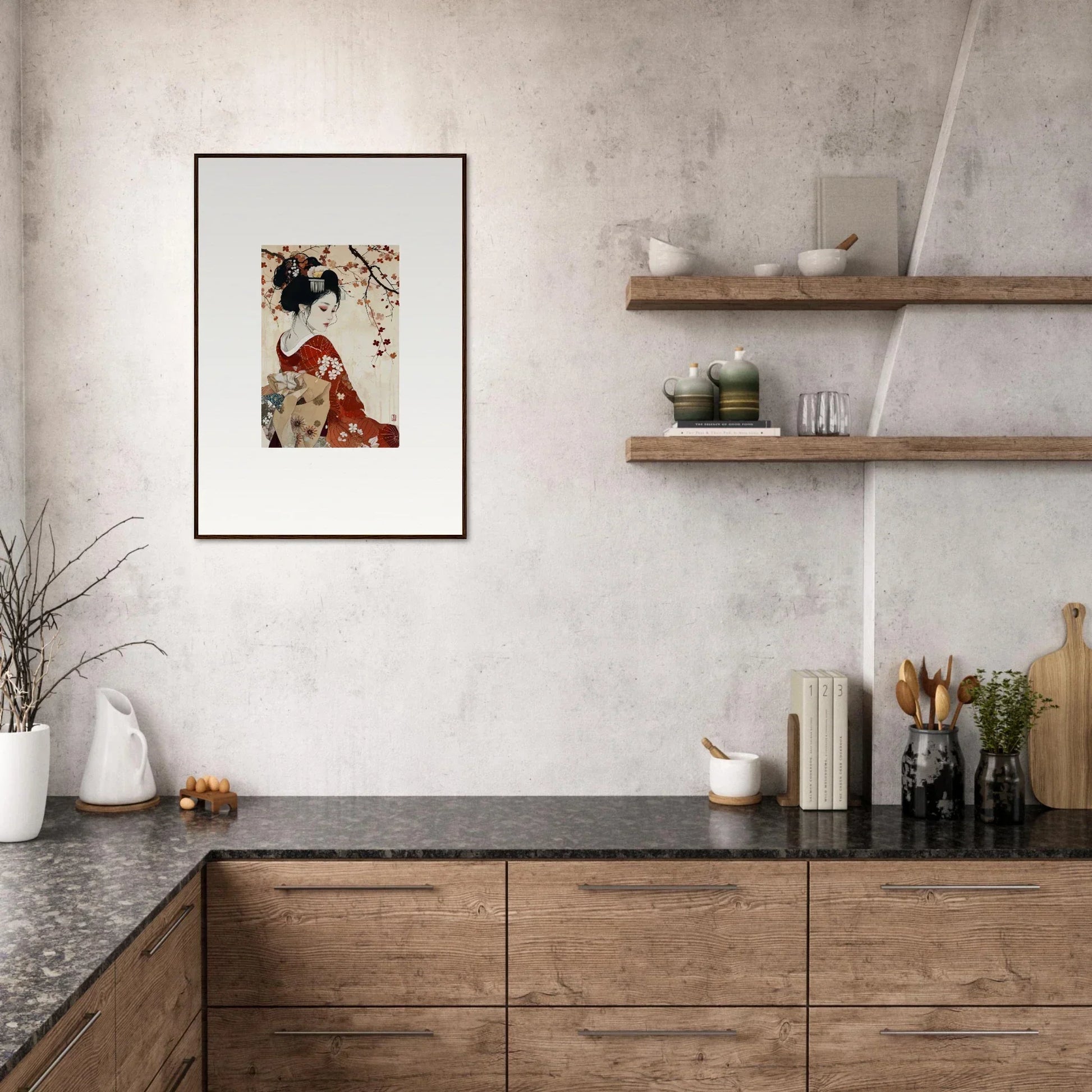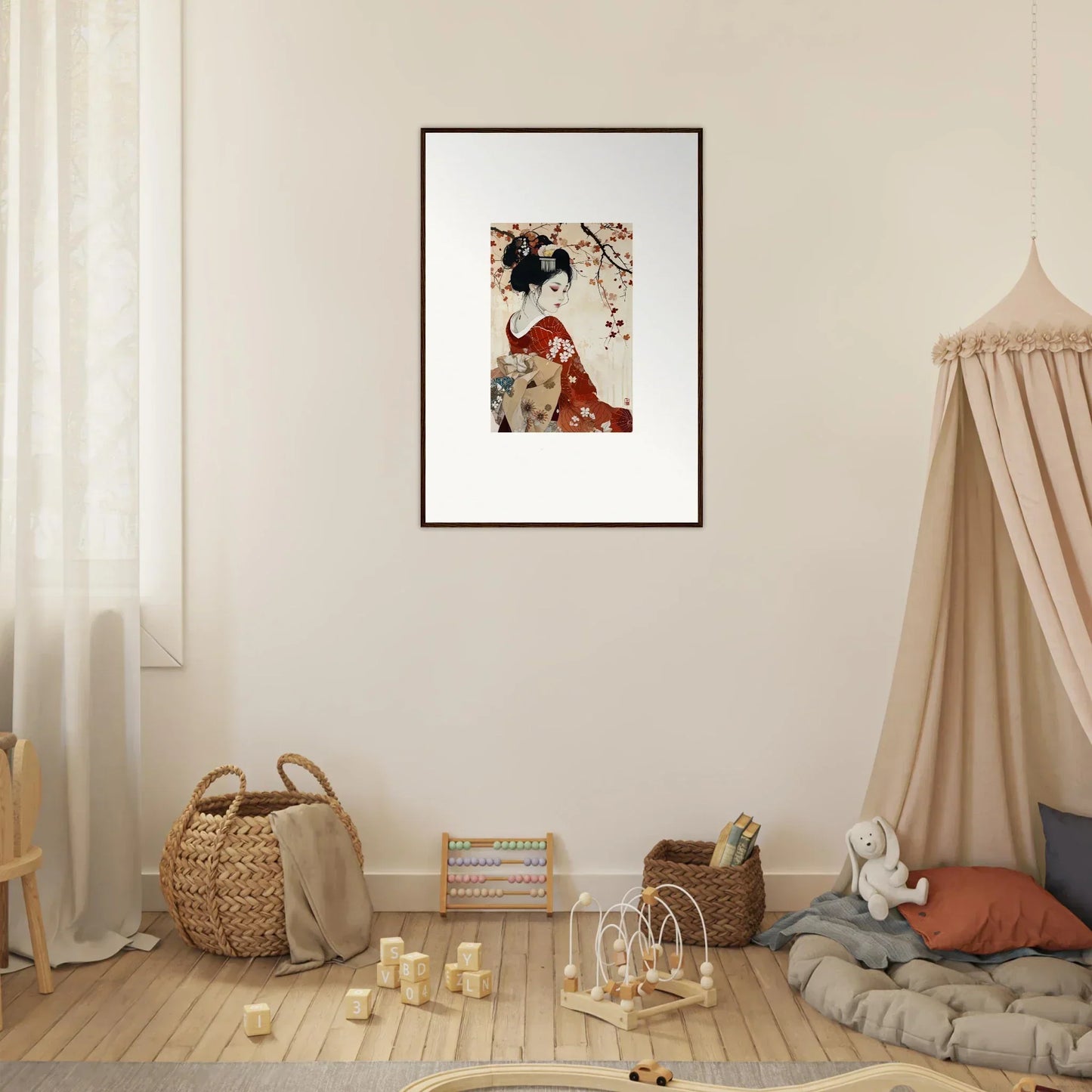 Immerse yourself in the enchanting world of Japanese artistry with our exquisite Geisha Moon Blossoms framed wall art. This masterpiece, crafted using the latest AI image generation technology, captures the delicate beauty of a geisha adorned in an intricate red kimono amidst a backdrop of blooming cherry blossoms. It brings an essence of tranquility and timeless elegance to any room it graces.
