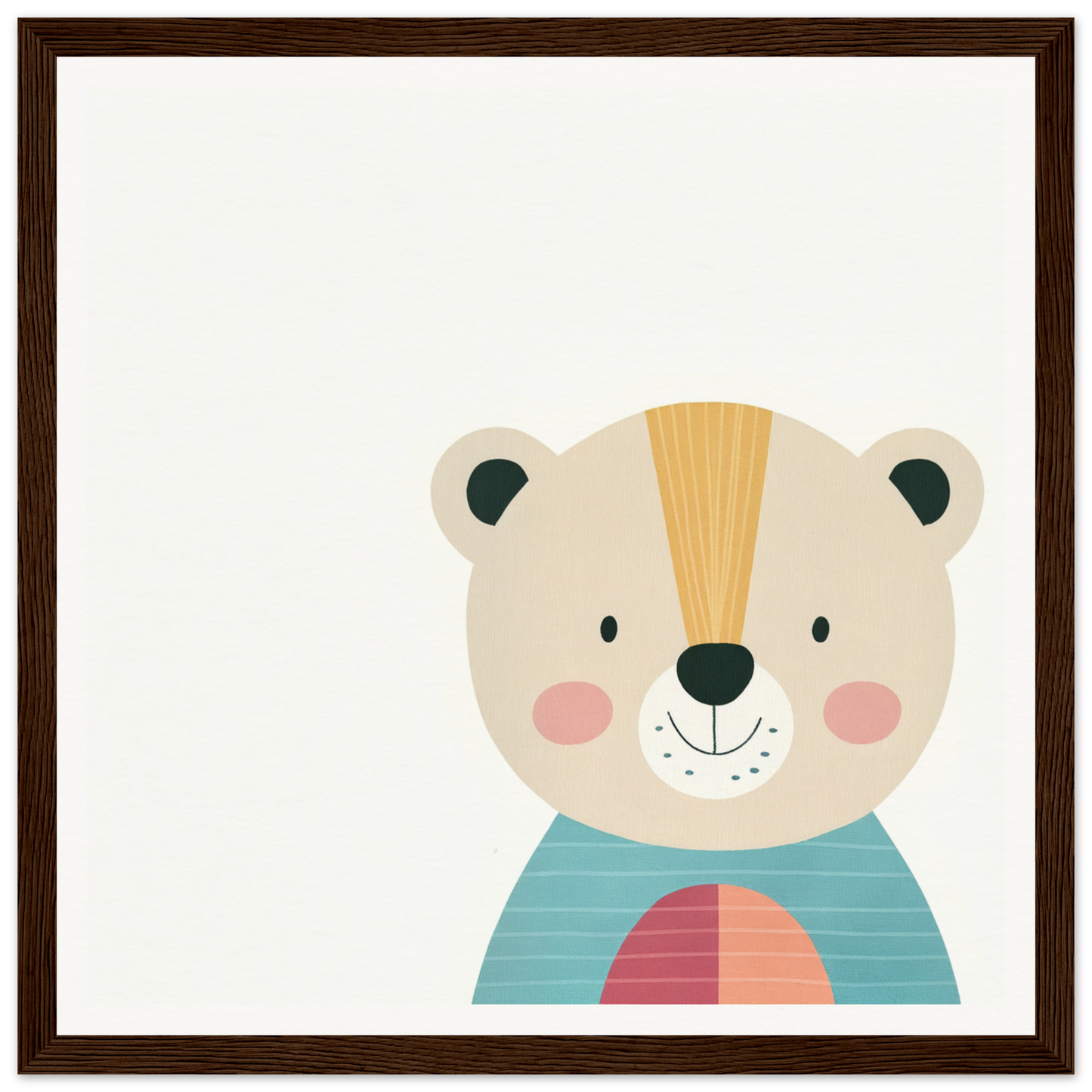 The softened tones of this artwork feature a primary beige, enhancing the gentle expression of our bear protagonist with warm accents of teal and pink. Set against an off-white background, this delightful palette invites tranquility to a baby nursery or children's playroom but extends its cheerful embrace to any cozy nook.