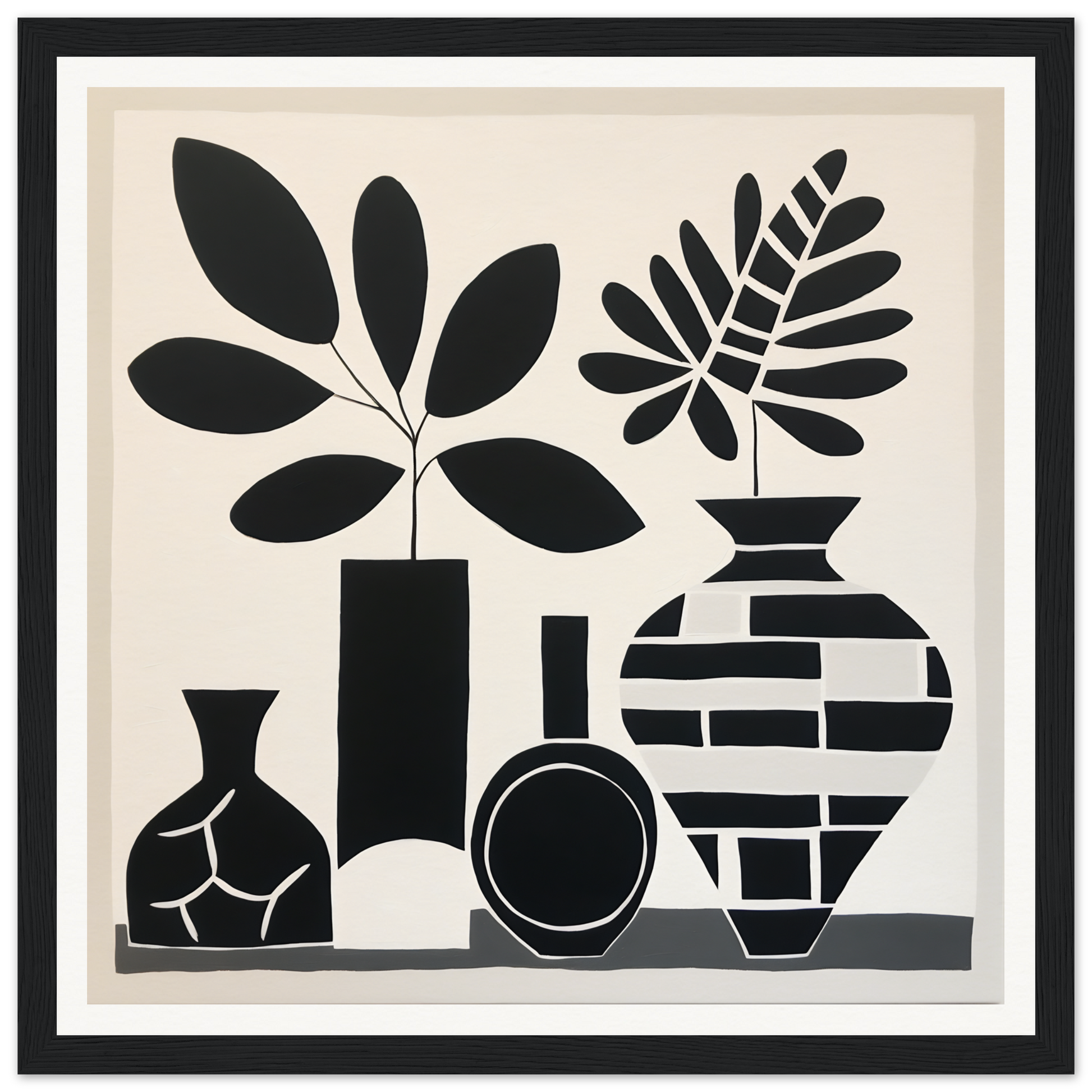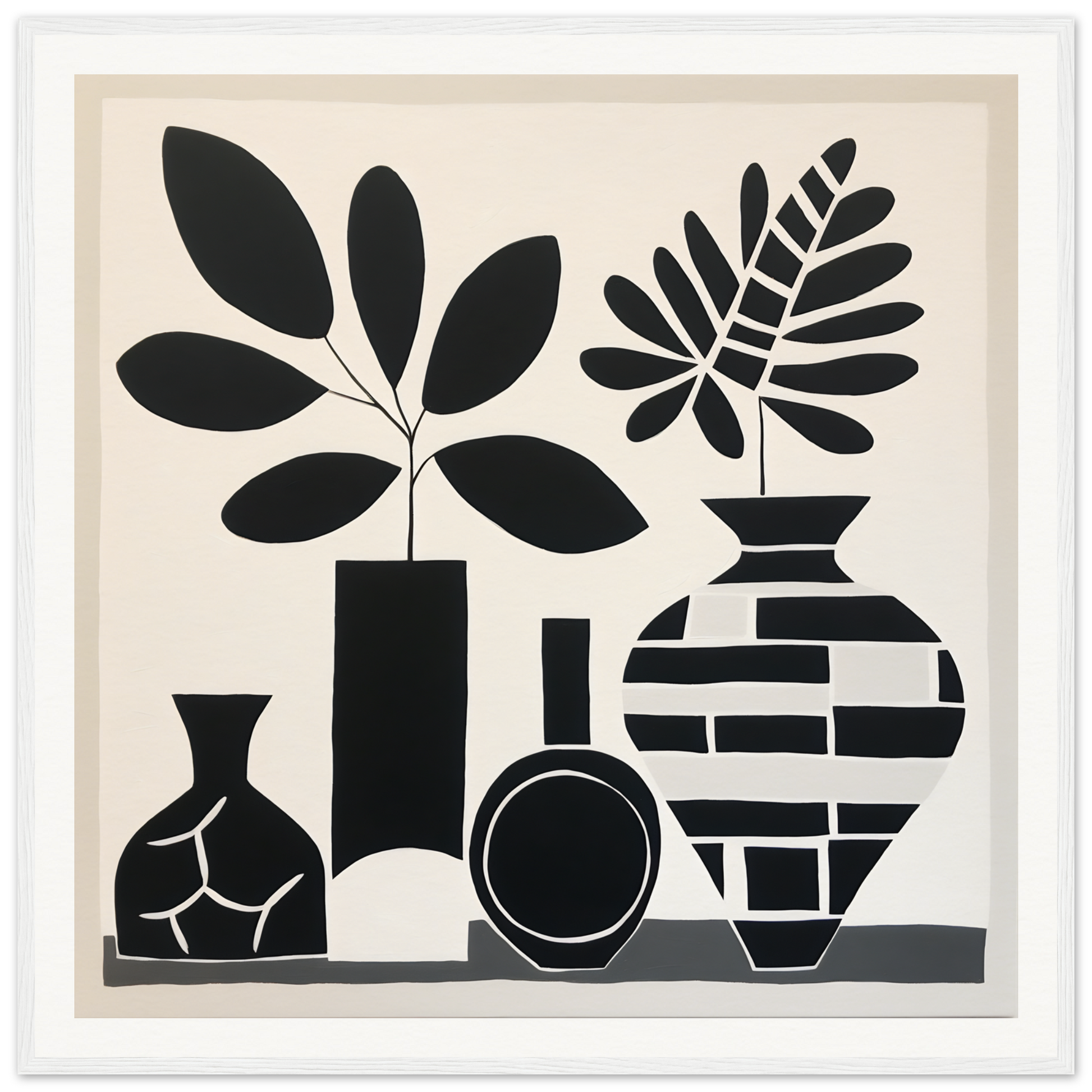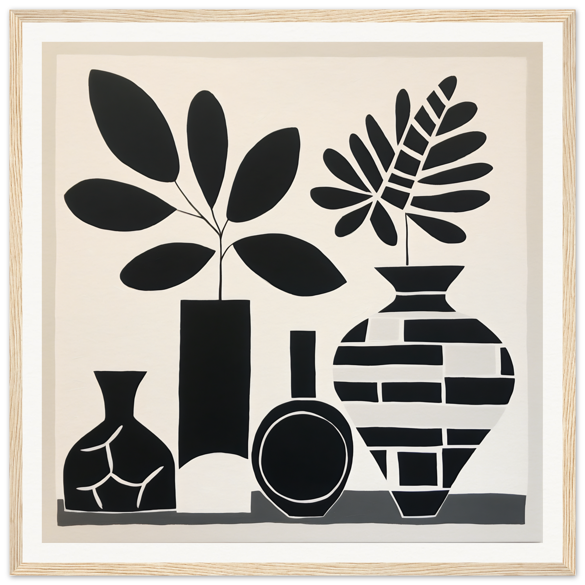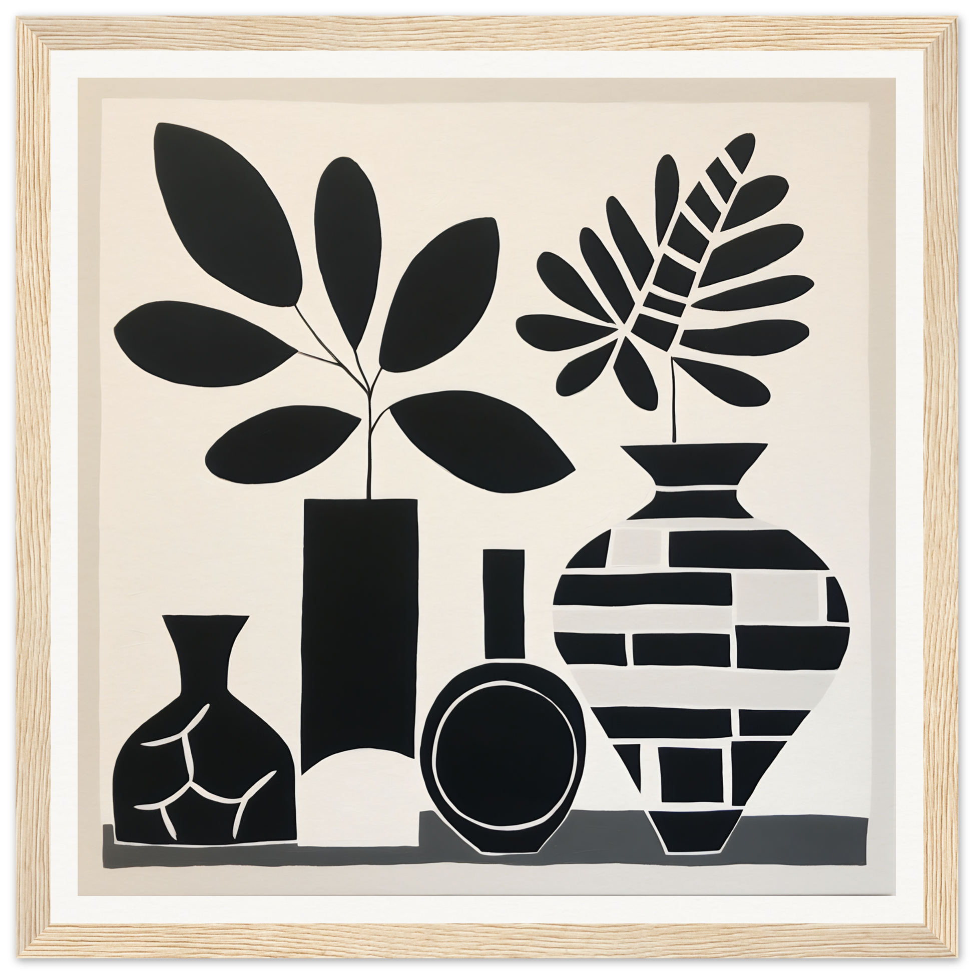 Embrace calm and order with this striking Framed Wall Art. Here, elegance lies in simplicity. Our latest AI technology brings to life a minimalist, monochrome still life depicting vases and plant leaves, merging geometric rigidity with organic forms.
