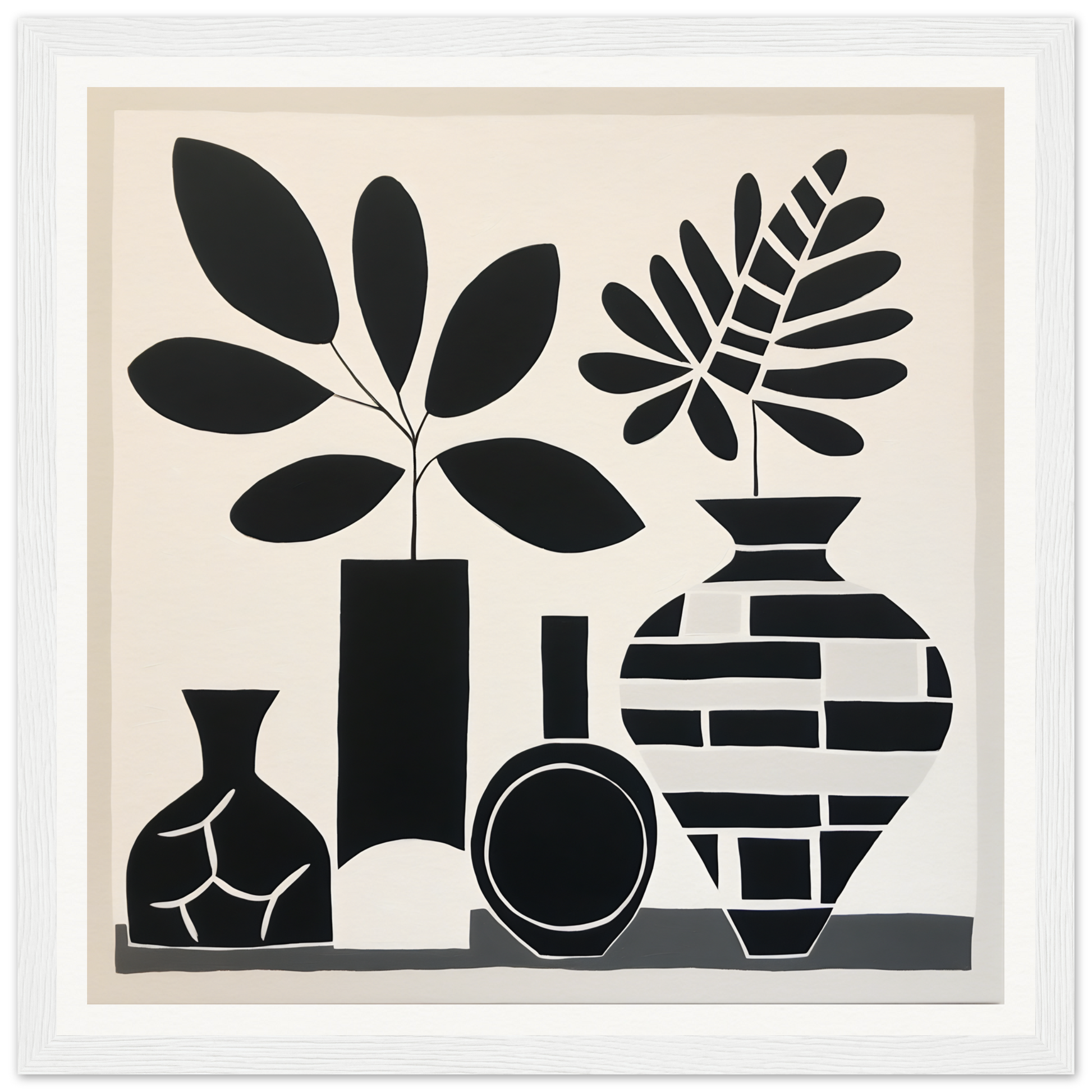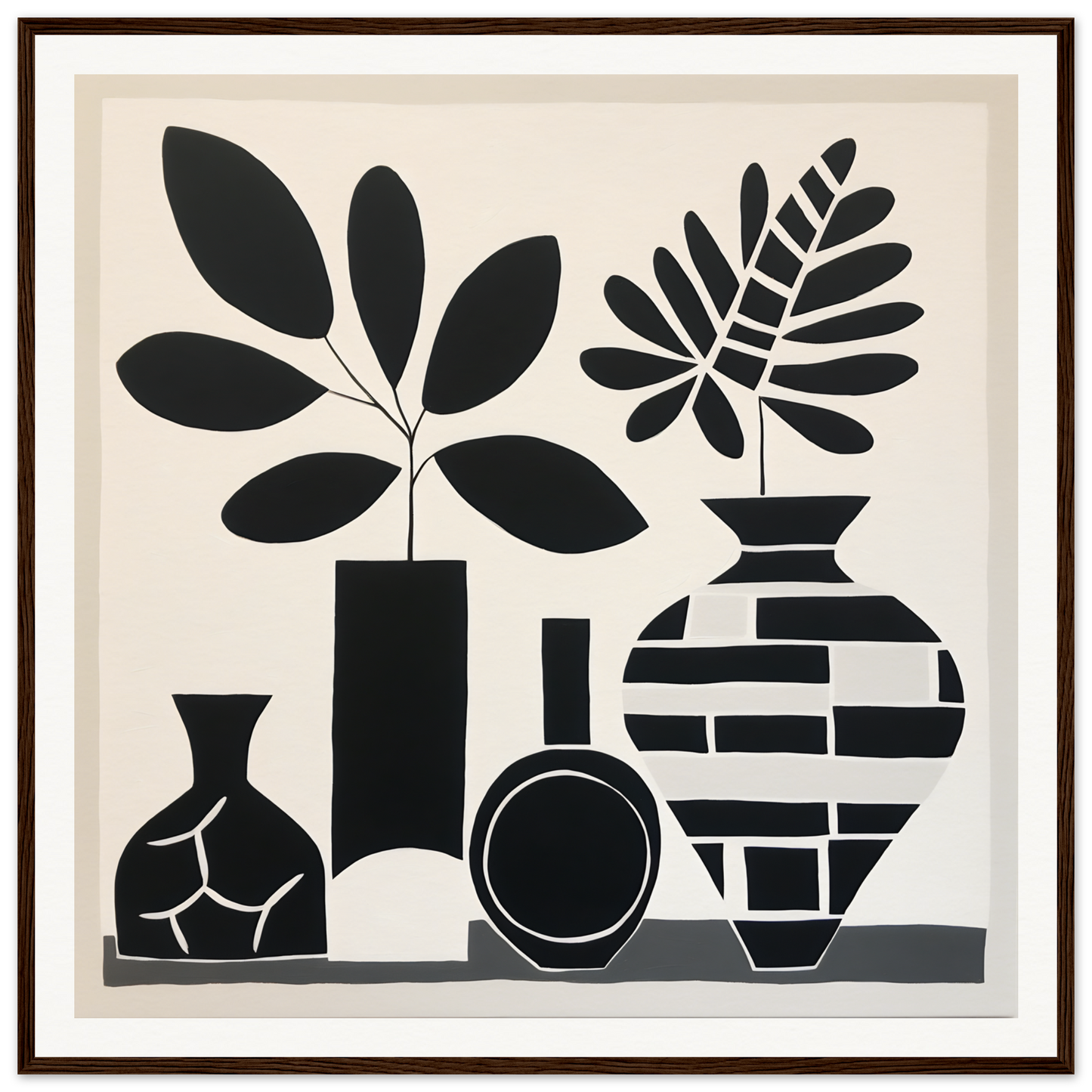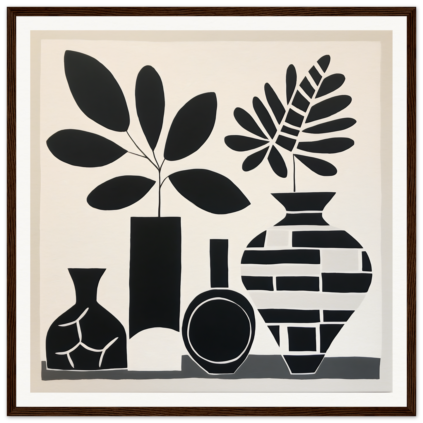 Embrace calm and order with this striking Framed Wall Art. Here, elegance lies in simplicity. Our latest AI technology brings to life a minimalist, monochrome still life depicting vases and plant leaves, merging geometric rigidity with organic forms.
