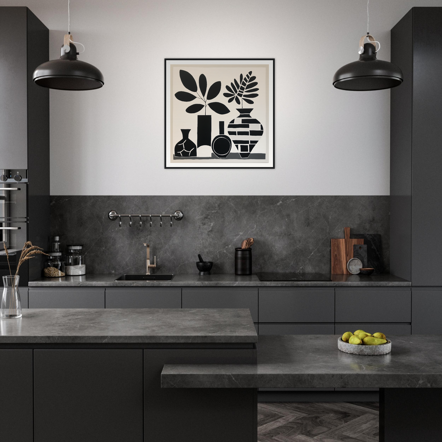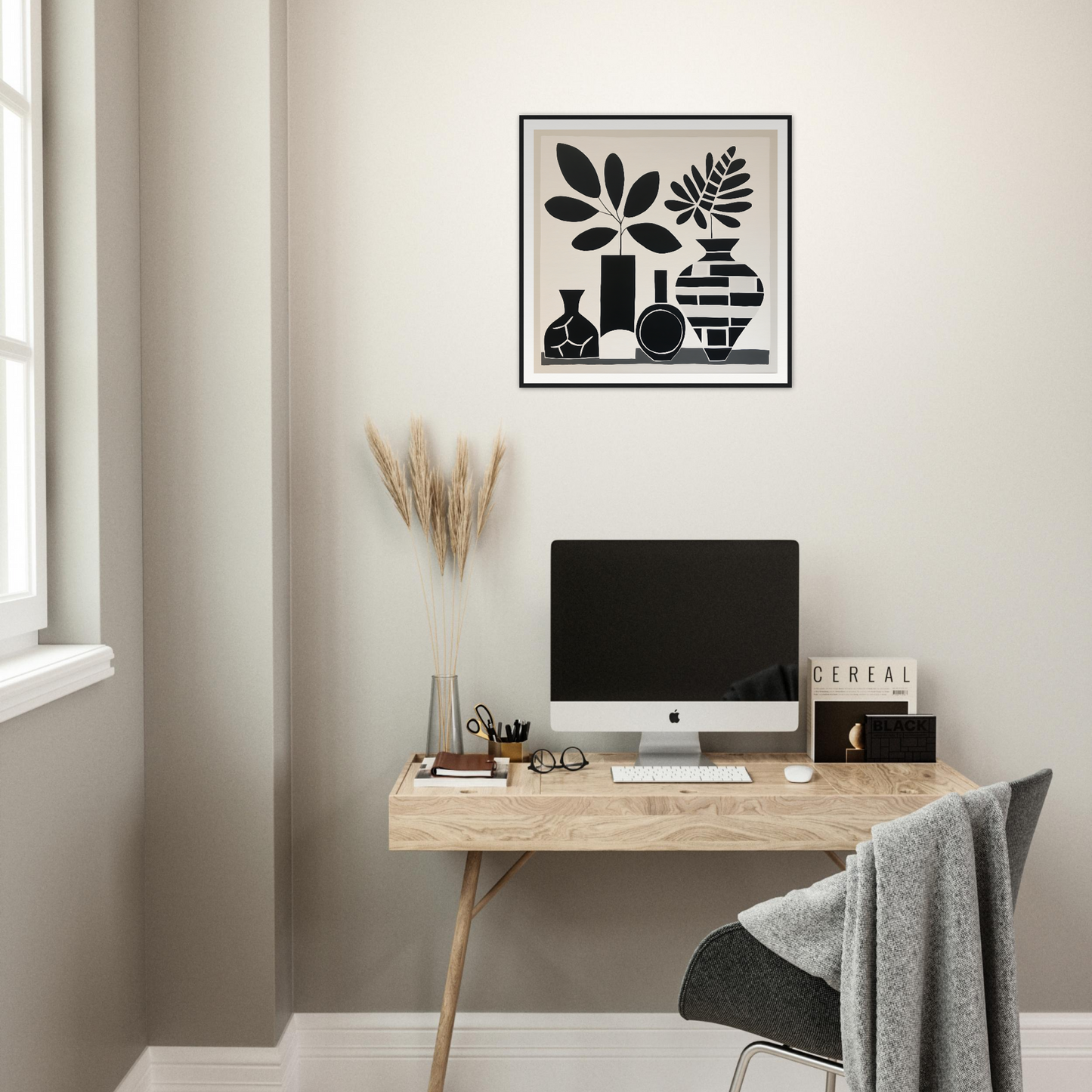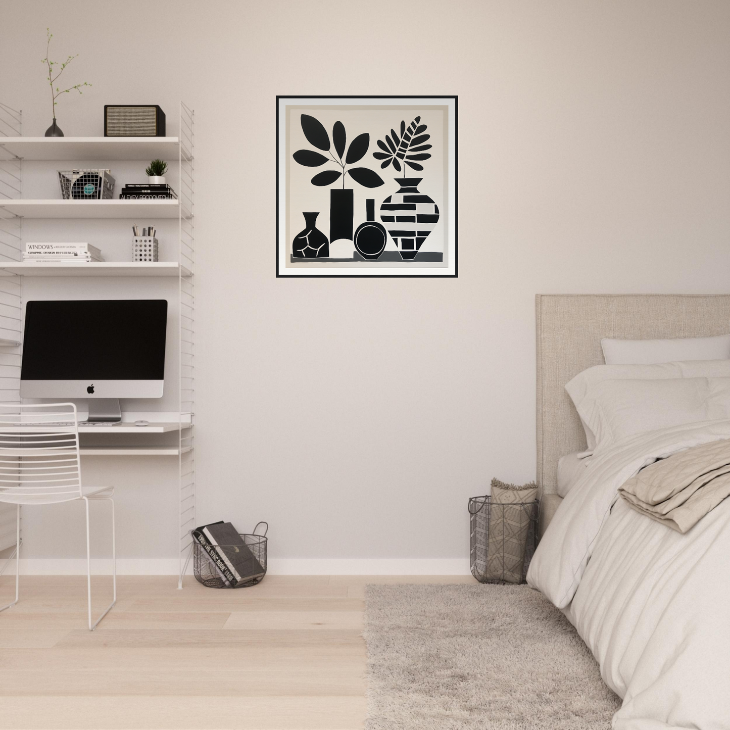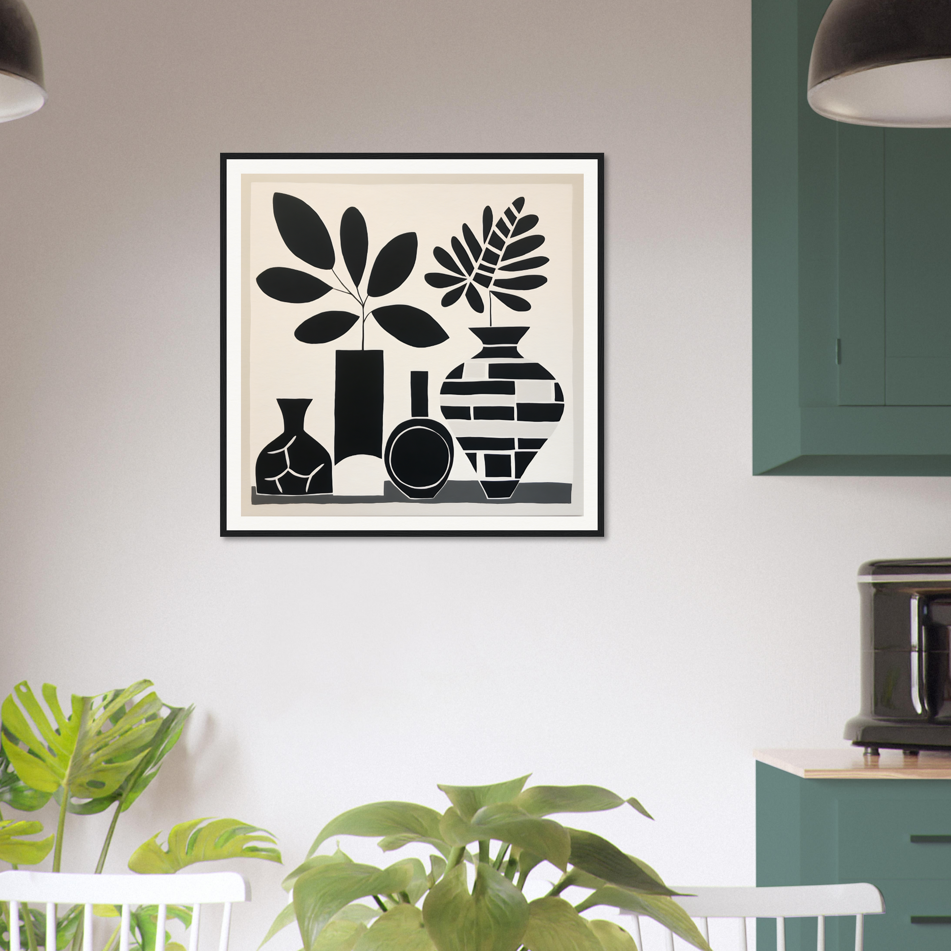 Embrace calm and order with this striking Framed Wall Art. Here, elegance lies in simplicity. Our latest AI technology brings to life a minimalist, monochrome still life depicting vases and plant leaves, merging geometric rigidity with organic forms.