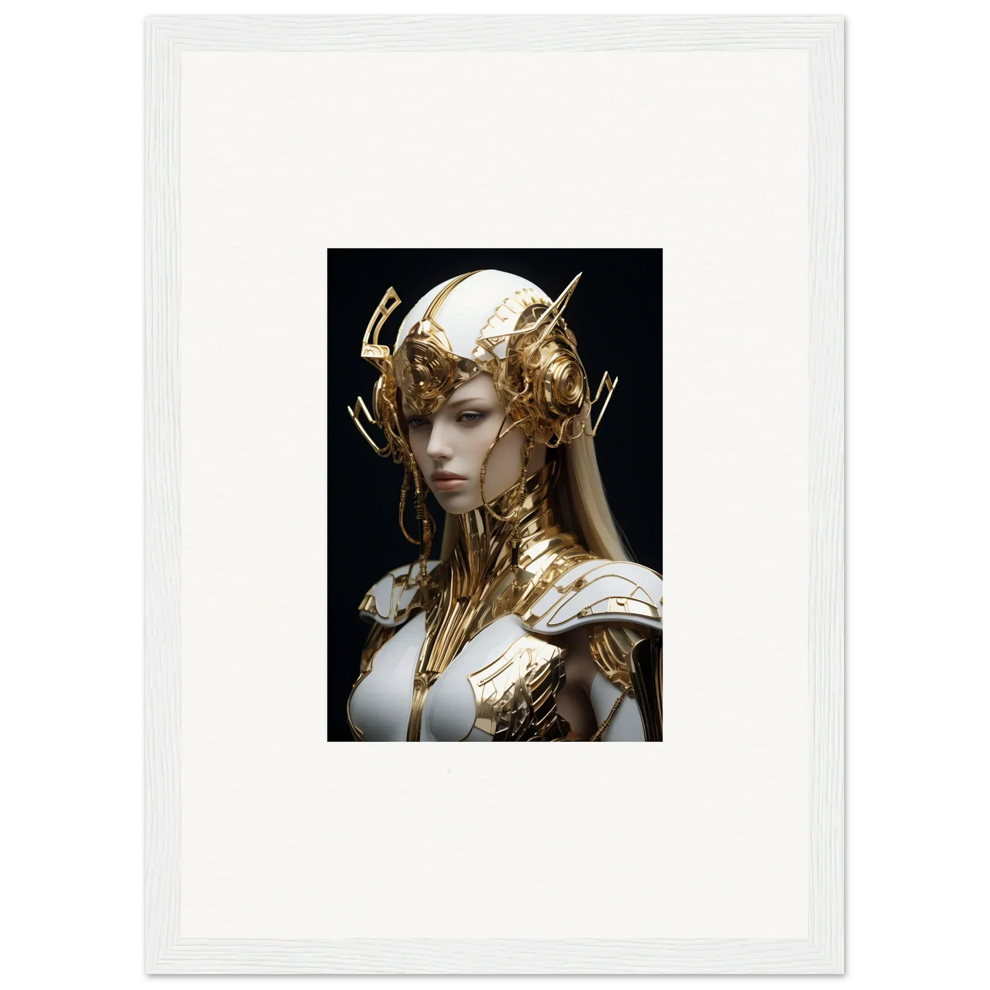 Whether for your home office or living room, the Gilded Elo Crowne art piece complements a wide range of decor styles. With its complementary color palette of white and gold, this artwork fits seamlessly into contemporary art spaces while adding a touch of futuristic fashion.