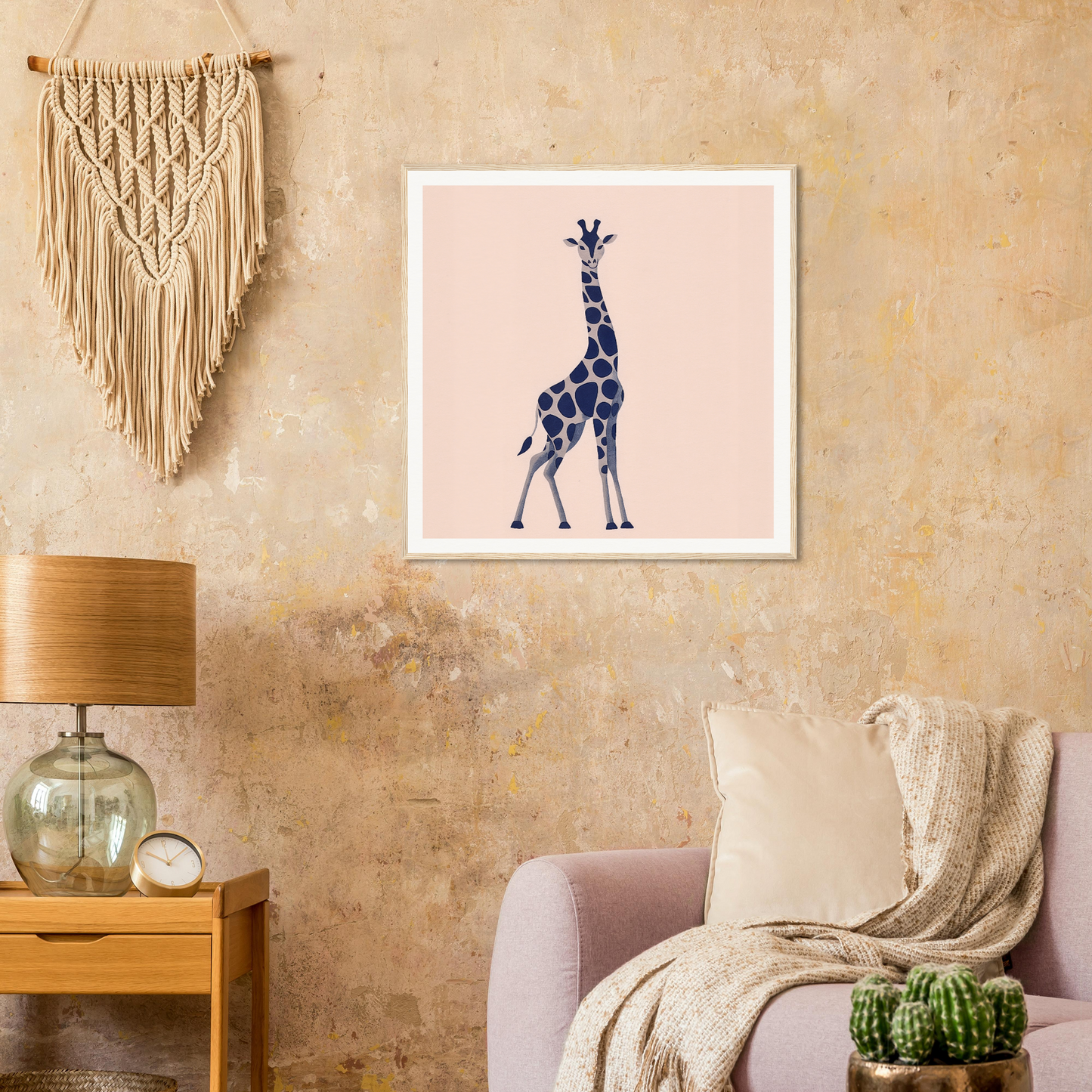 This framed artwork captures clean lines and color contrasts of pastel pink and navy blue. Our digital craftsmanship highlights the giraffe's serene, whimsical expression, inviting conversations of elegance and nature's wonders in any setting.