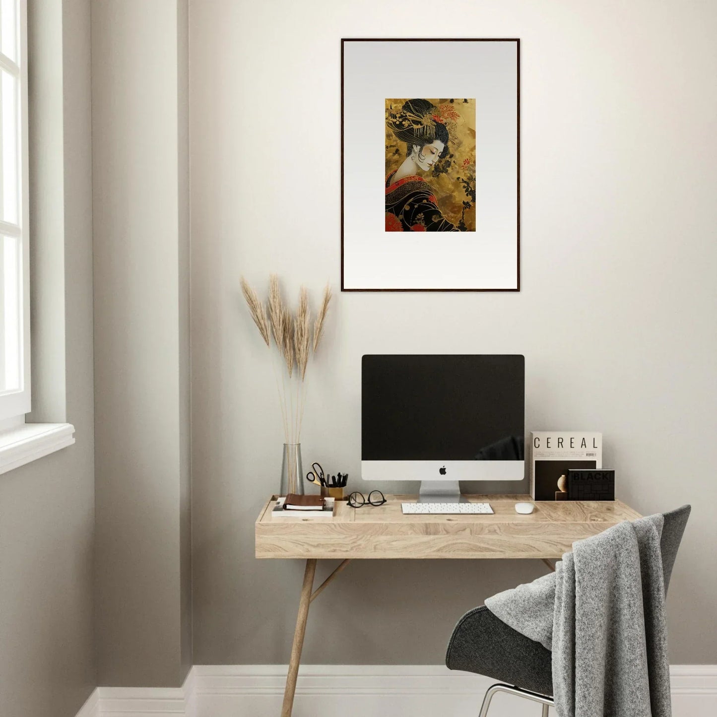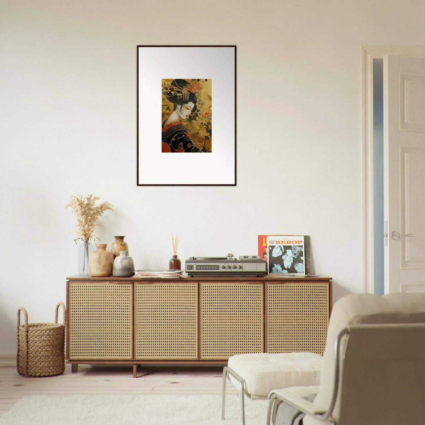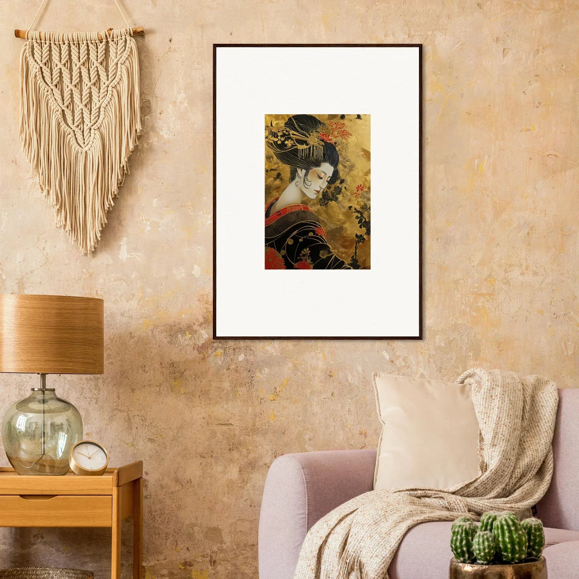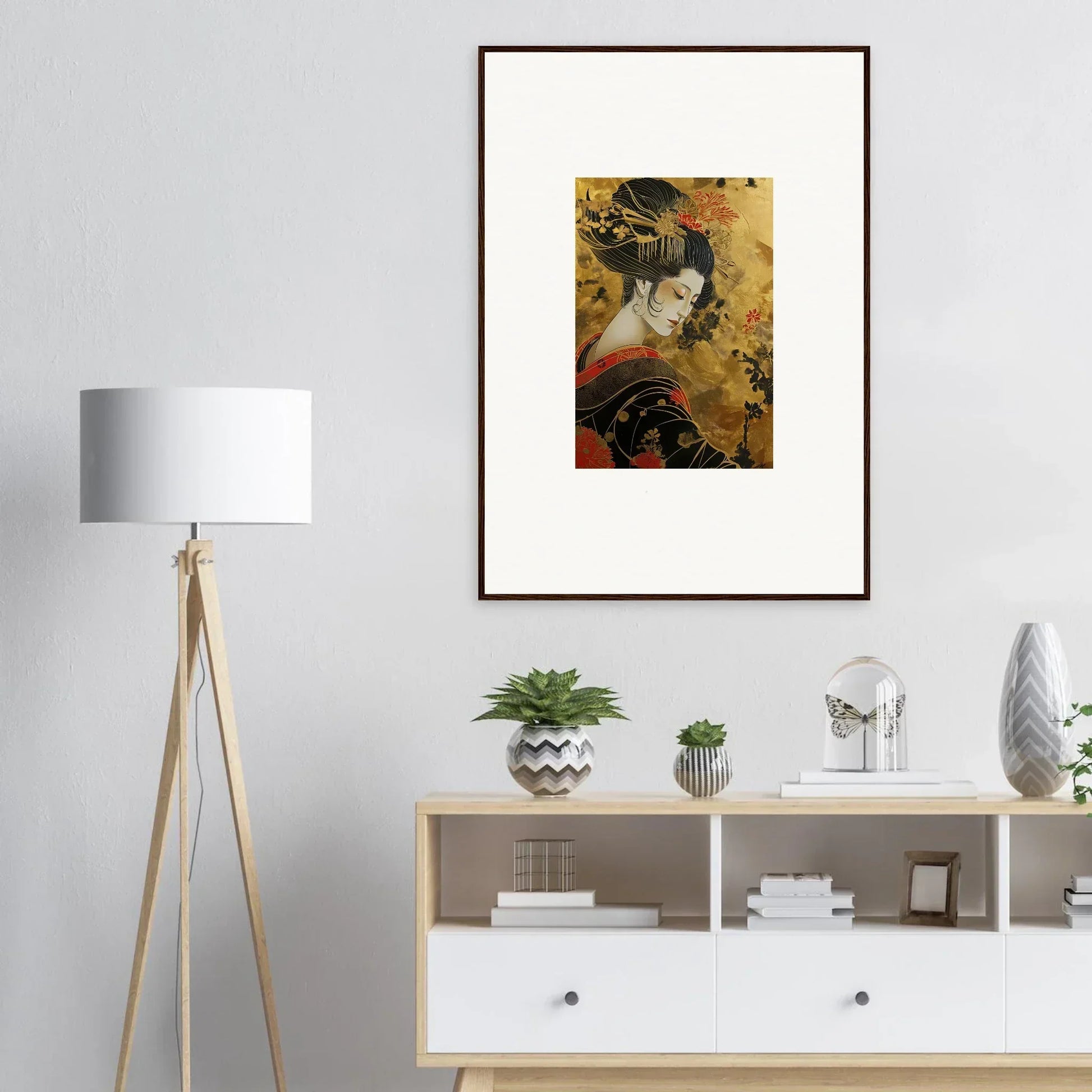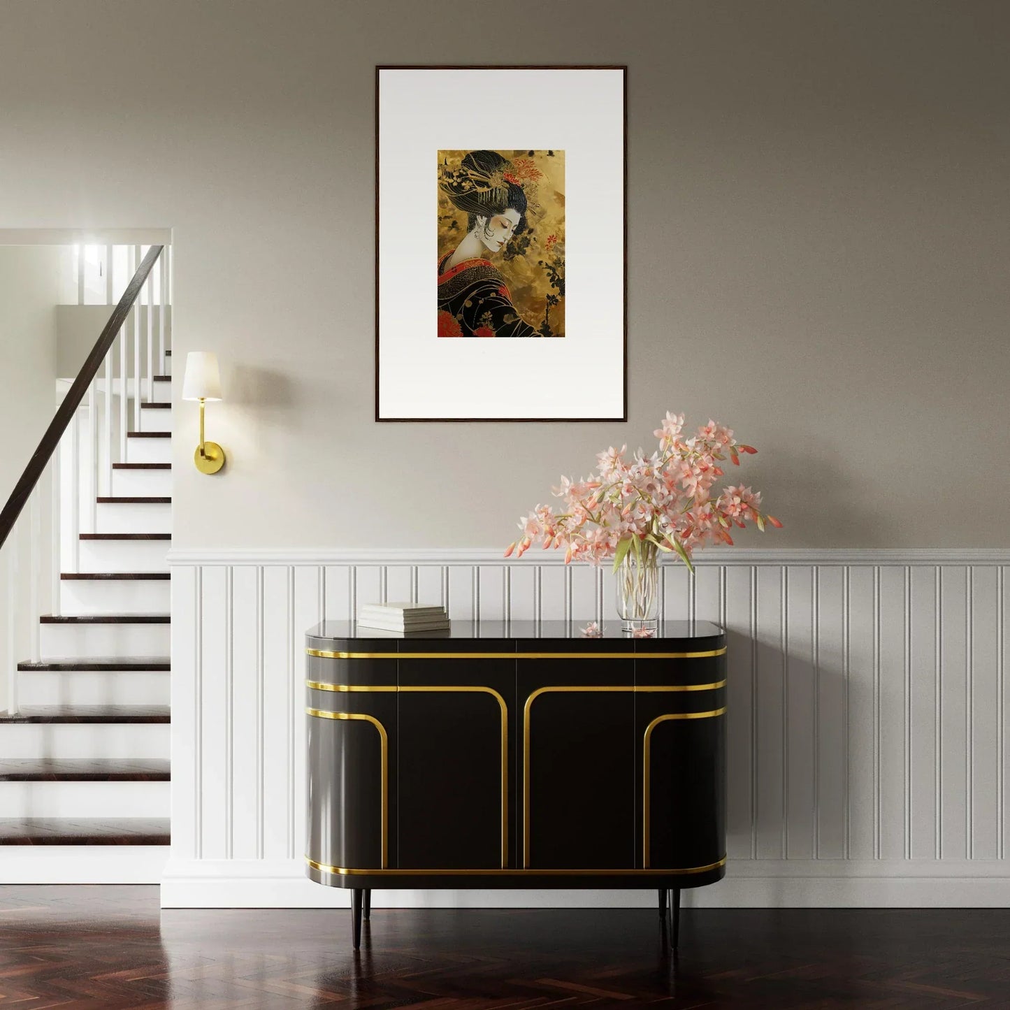 Our artwork, crafted with the latest AI image generation technology, captures the essence of Japanese Art and Cultural and World subjects. The intricate, figurative design and the luxurious gold and black color palette create a mood of serenity and peace, making this piece a perfect fit for your bedroom or living room.