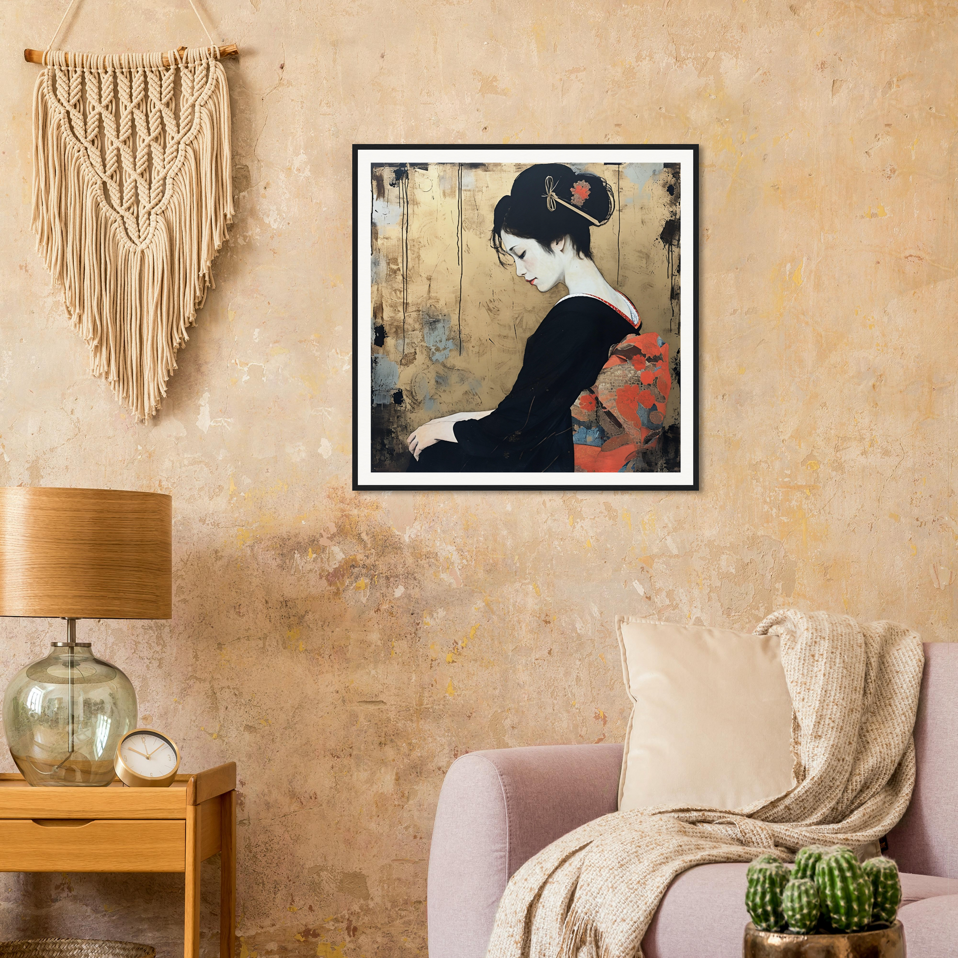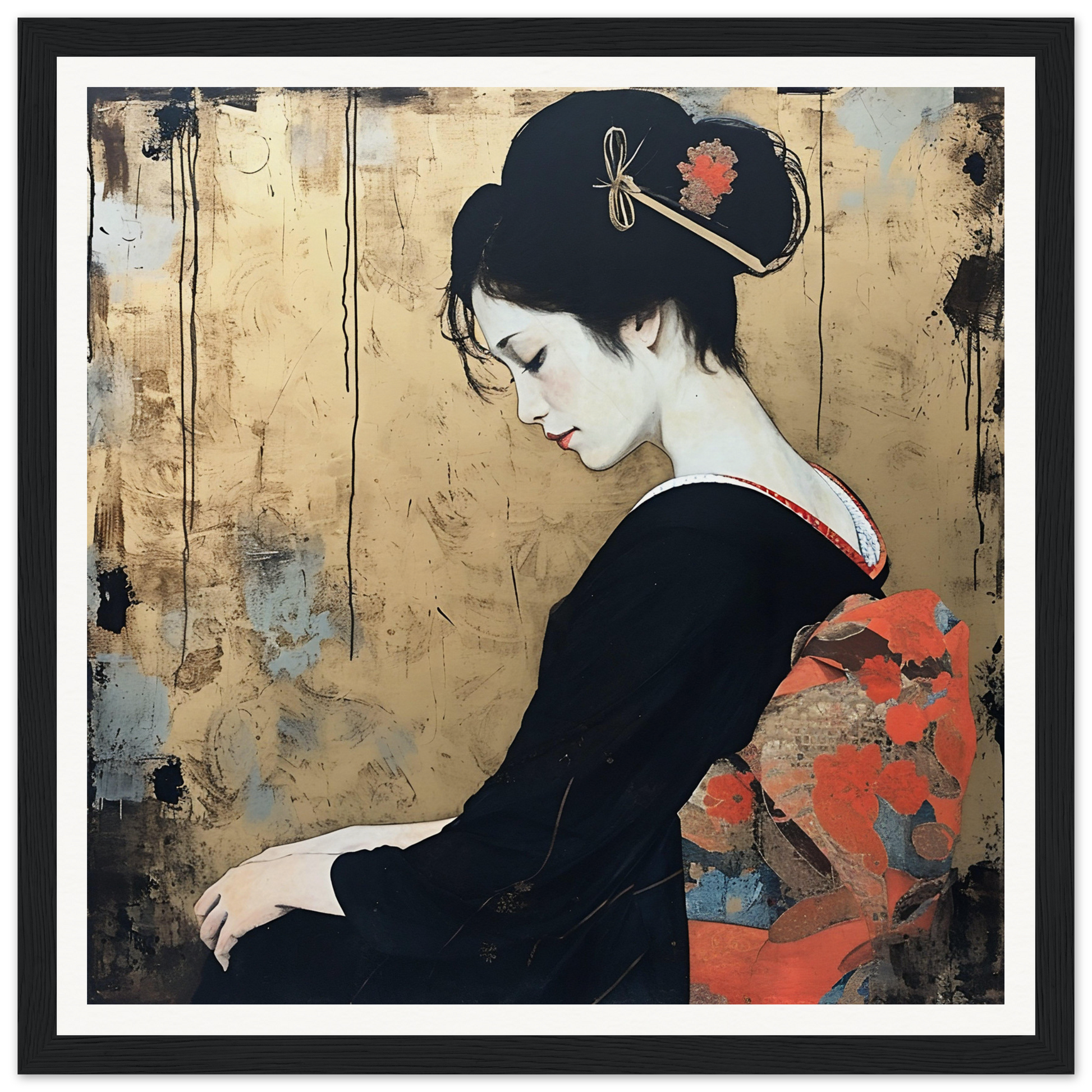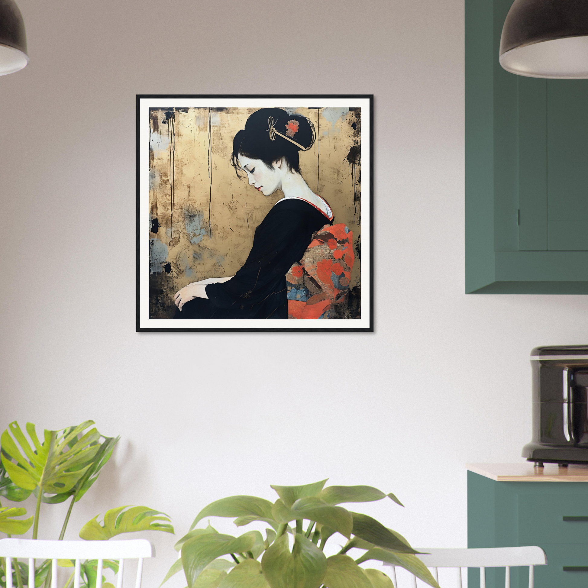 Step into a world where tradition and modernity blend seamlessly with our Golden Kimono Dreamland framed wall art. This exquisite piece, created using cutting-edge AI technology, presents a stunning portrait of a woman in traditional Japanese attire. Her serene, reflective pose is set against a muted gold background, offering an aura of tranquility and contemplation that can instantly elevate your space.