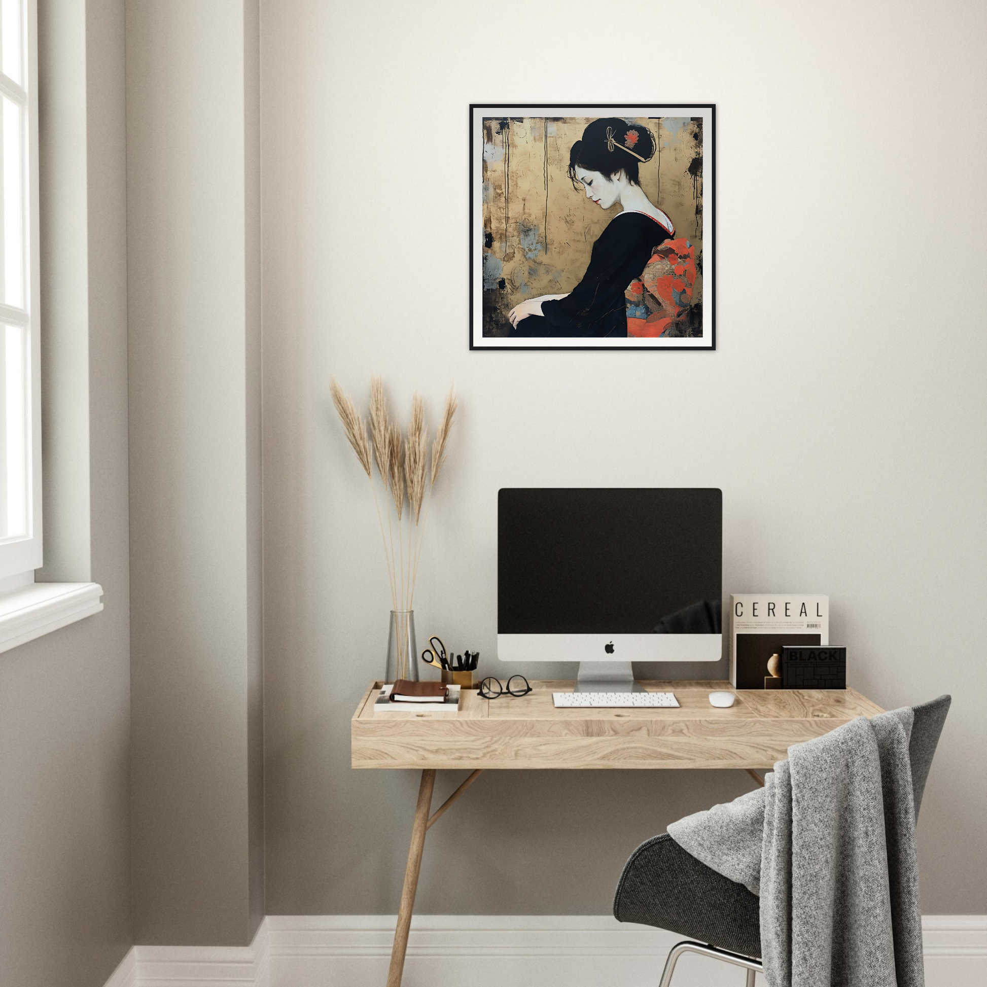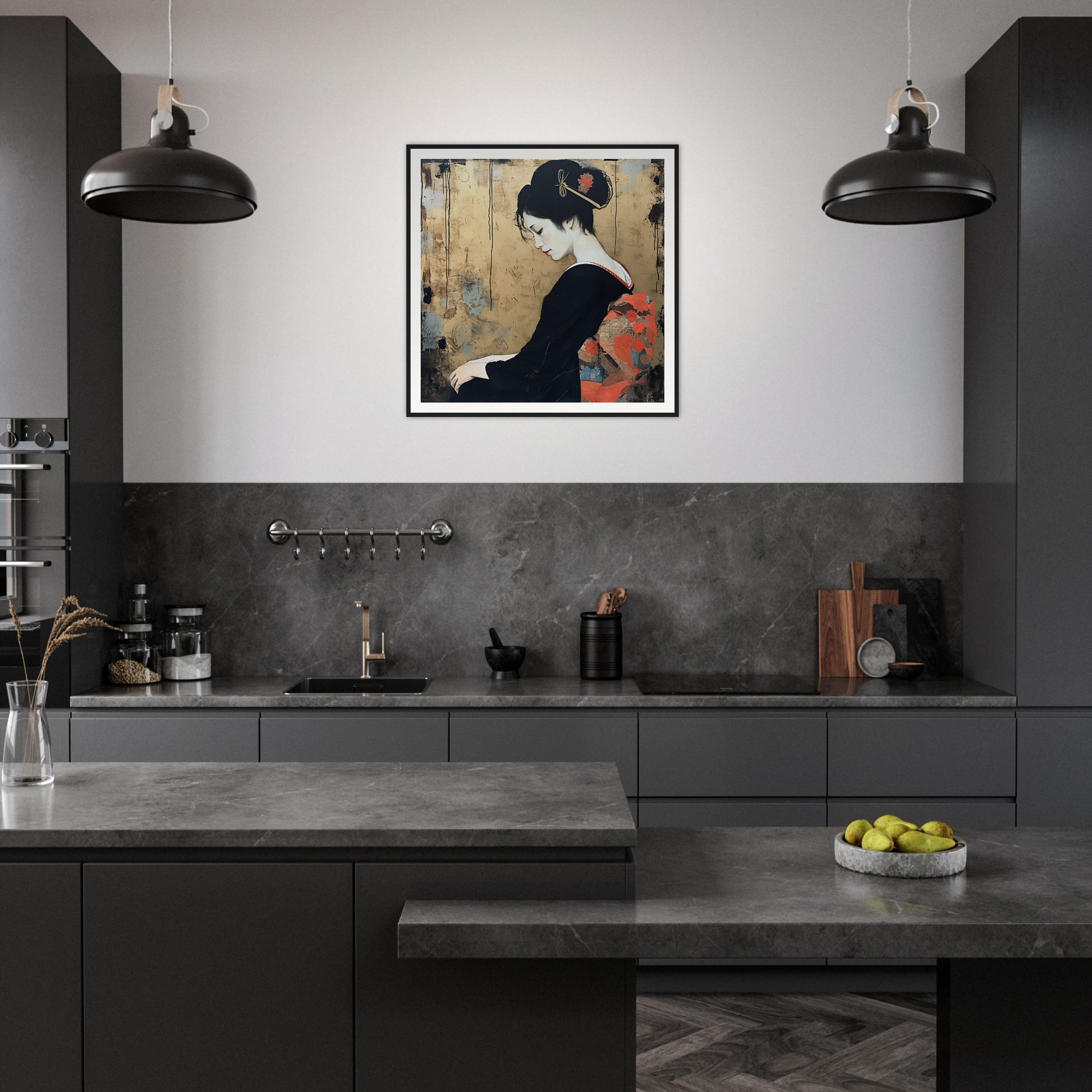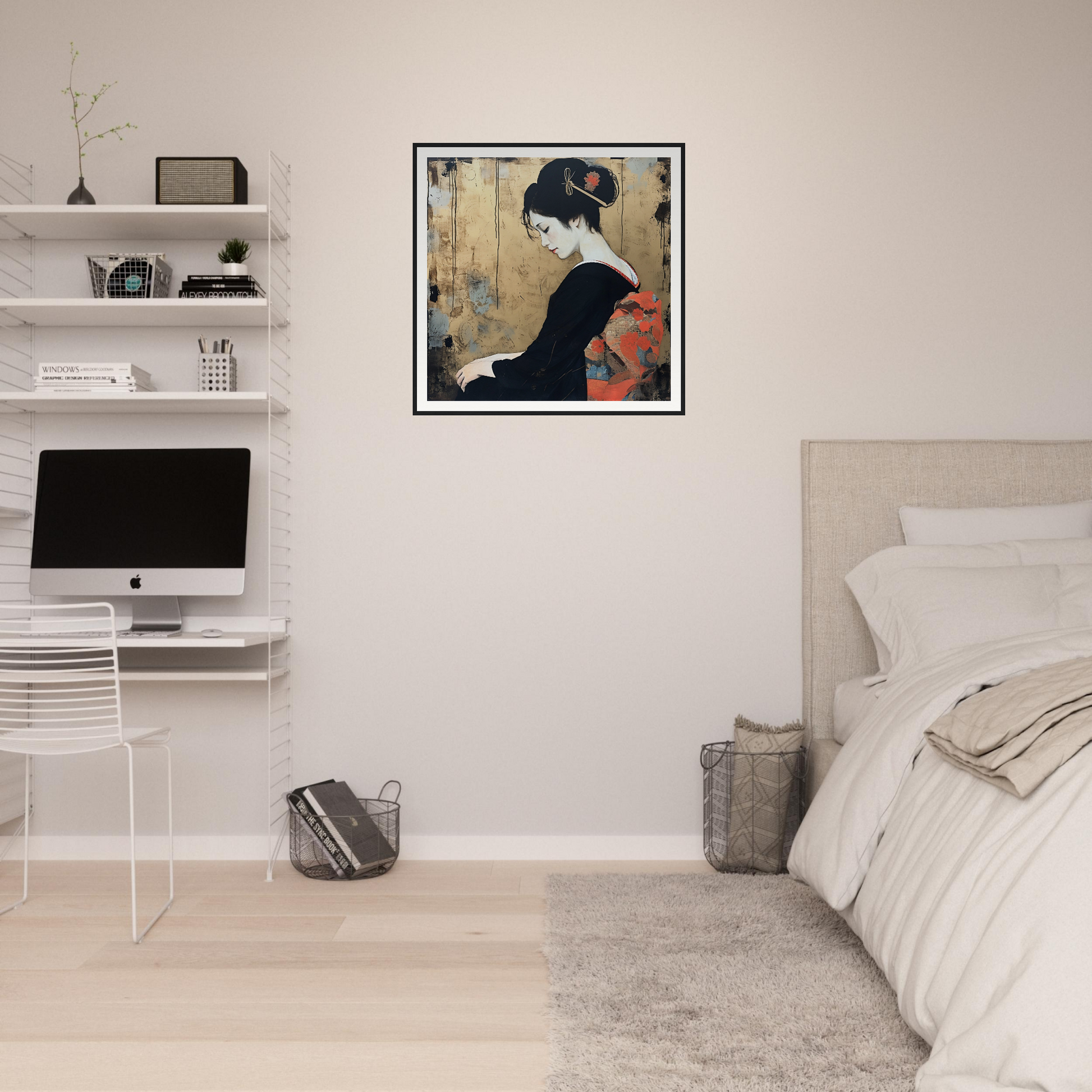 Step into a world where tradition and modernity blend seamlessly with our Golden Kimono Dreamland framed wall art. This exquisite piece, created using cutting-edge AI technology, presents a stunning portrait of a woman in traditional Japanese attire. Her serene, reflective pose is set against a muted gold background, offering an aura of tranquility and contemplation that can instantly elevate your space.