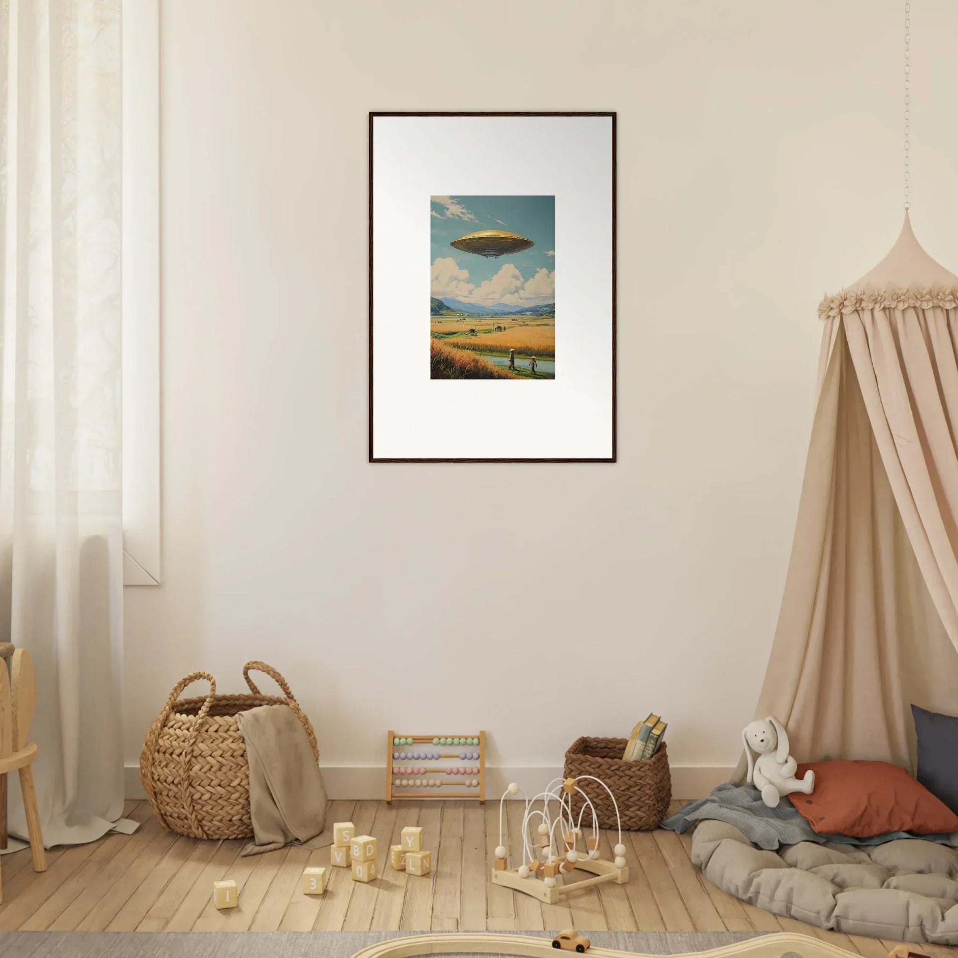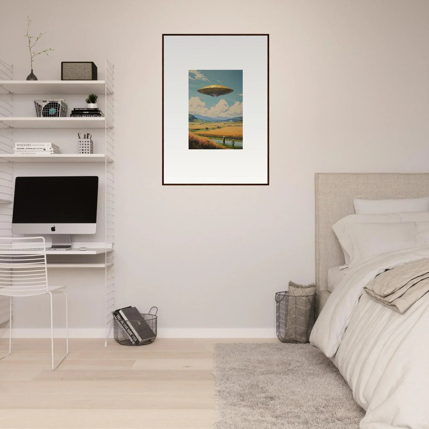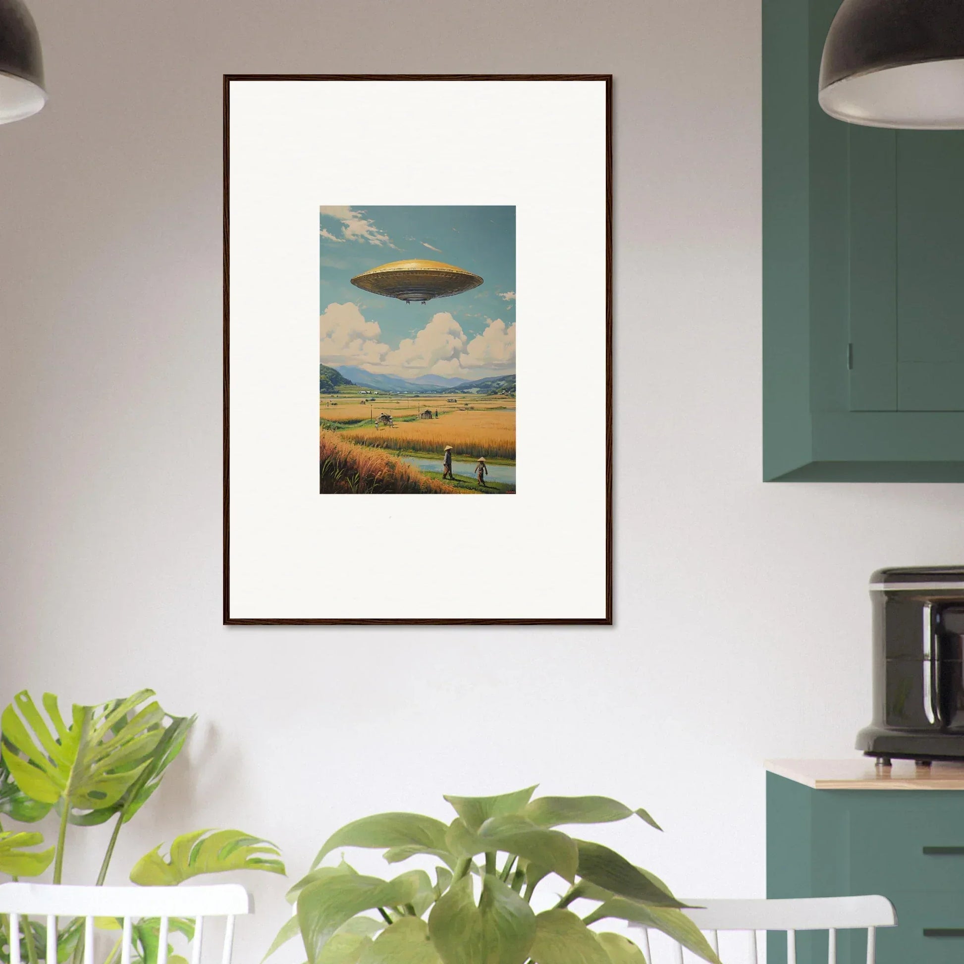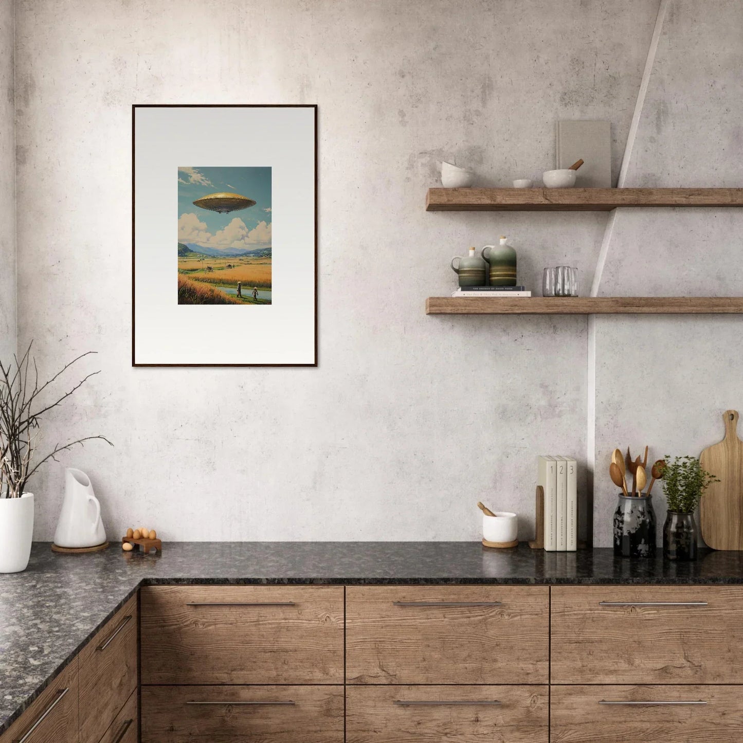 This stunning piece, boasting hues of blue and complementary naturals, is perfect for injecting a sense of adventure and exploration into your living room or home office. Its contemporary art style and subject matter, blending architecture and cityscapes with a touch of fantasy, make it a captivating focal point in any setting. The expansive margins draw the eye inward, making the art appear to hover and adding a layer of depth to your walls.