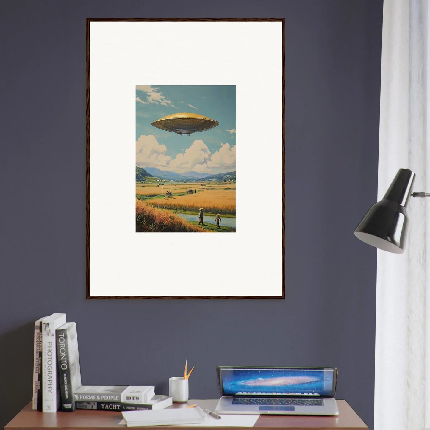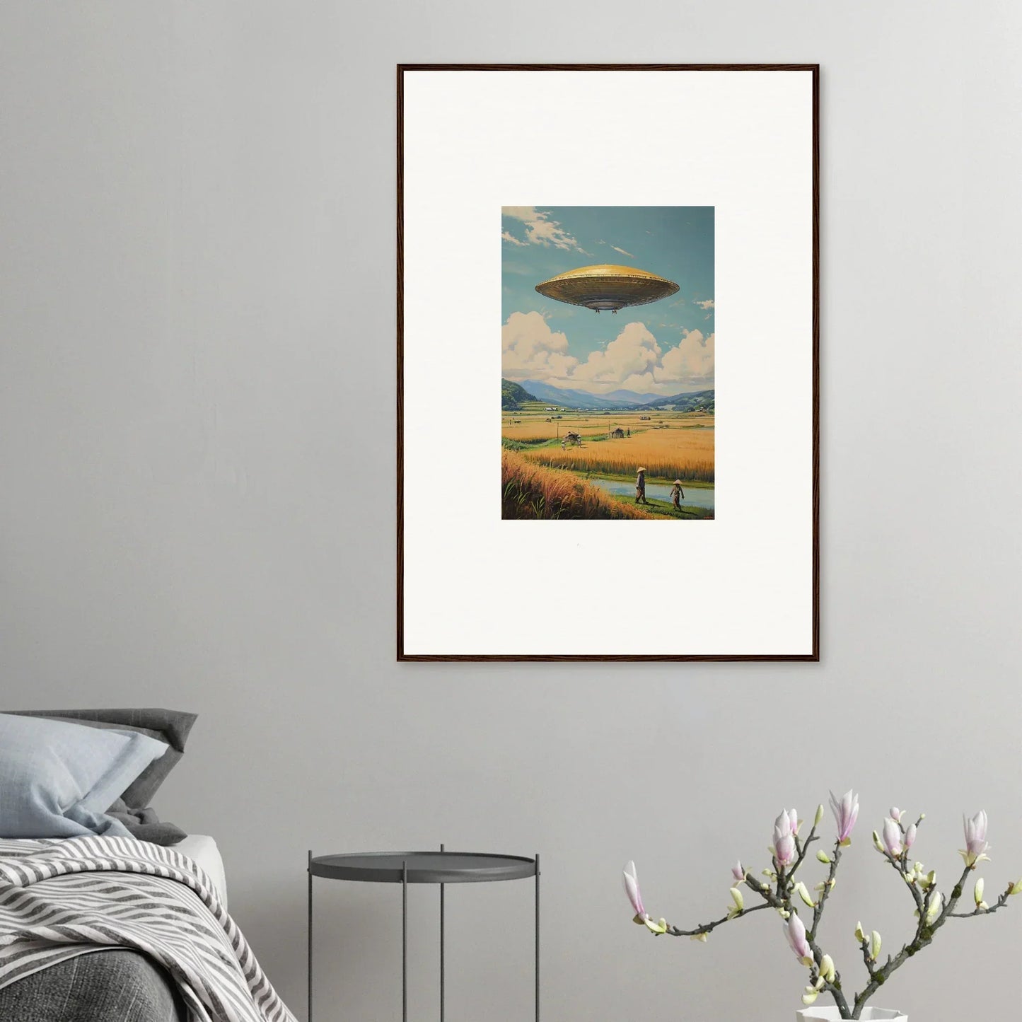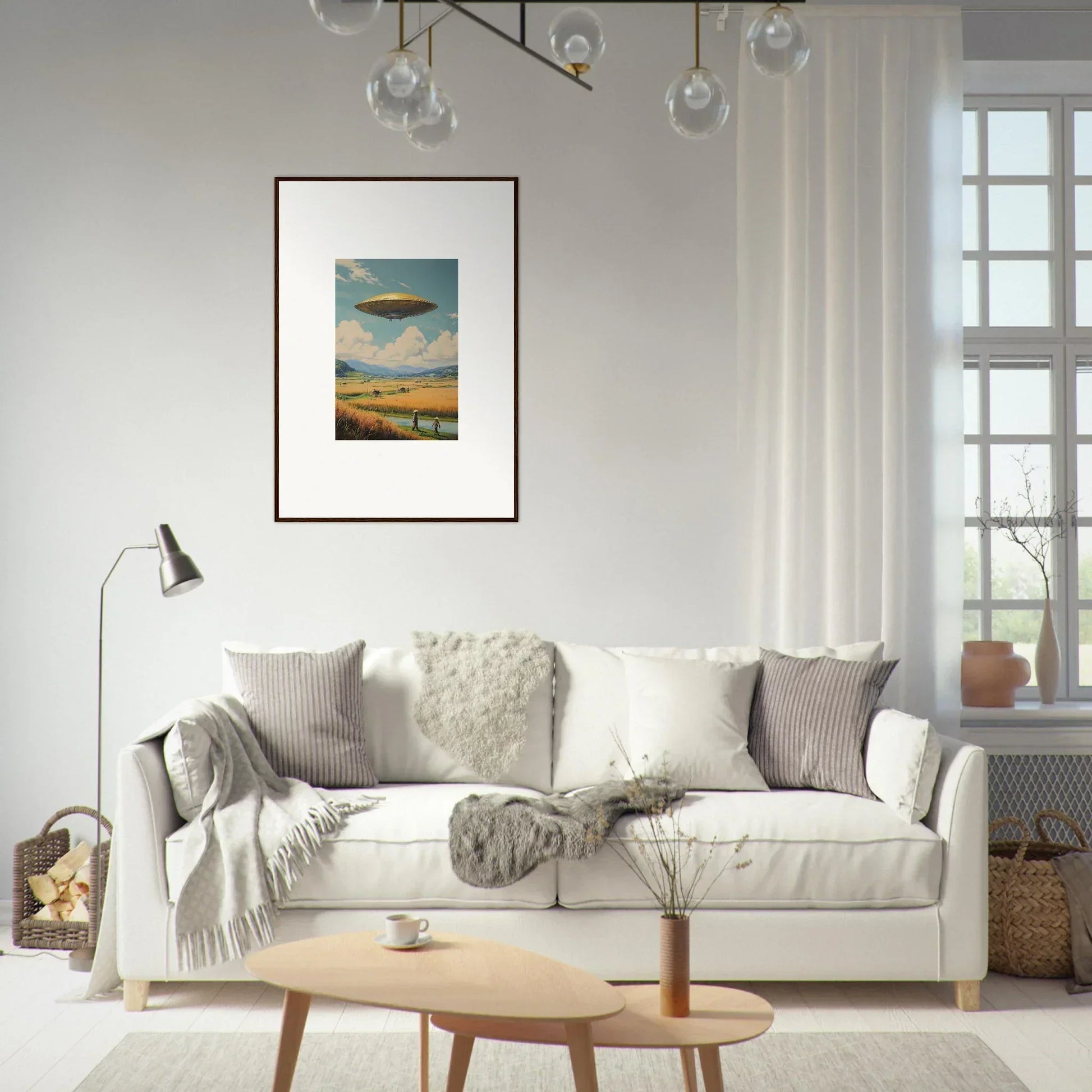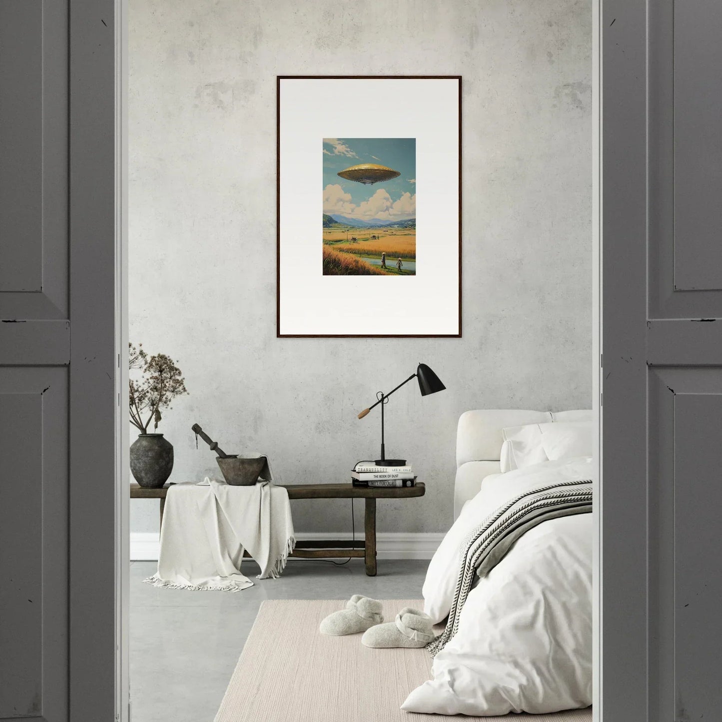This stunning piece, boasting hues of blue and complementary naturals, is perfect for injecting a sense of adventure and exploration into your living room or home office. Its contemporary art style and subject matter, blending architecture and cityscapes with a touch of fantasy, make it a captivating focal point in any setting. The expansive margins draw the eye inward, making the art appear to hover and adding a layer of depth to your walls.