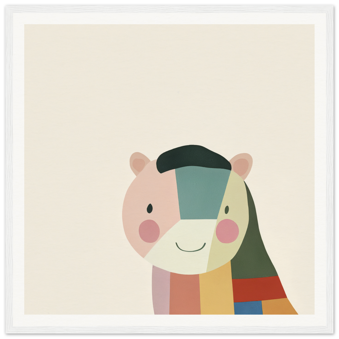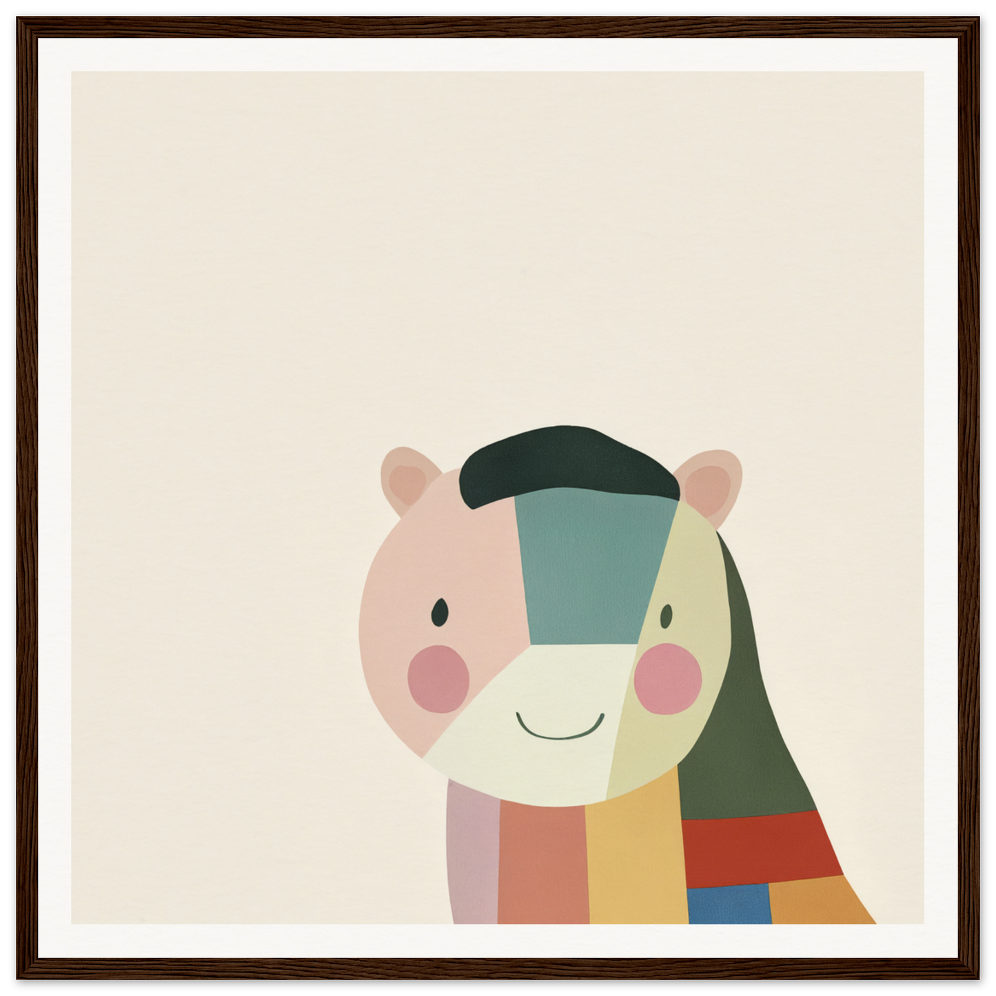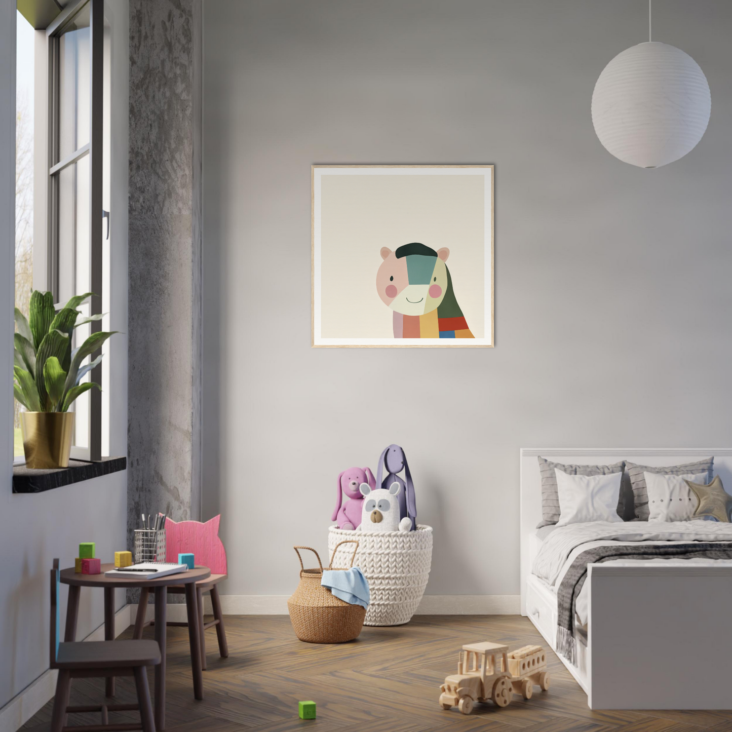 This wall art decor, framed in a sleek, contemporary style, is perfect for transforming any nursery or children's room into a haven of joy and safety. The gentle interplay of pale pinks, greens, and muted earthy tones invites a tranquil ambiance. Its light-hearted character offers a welcoming embrace to both the young and young-at-heart.