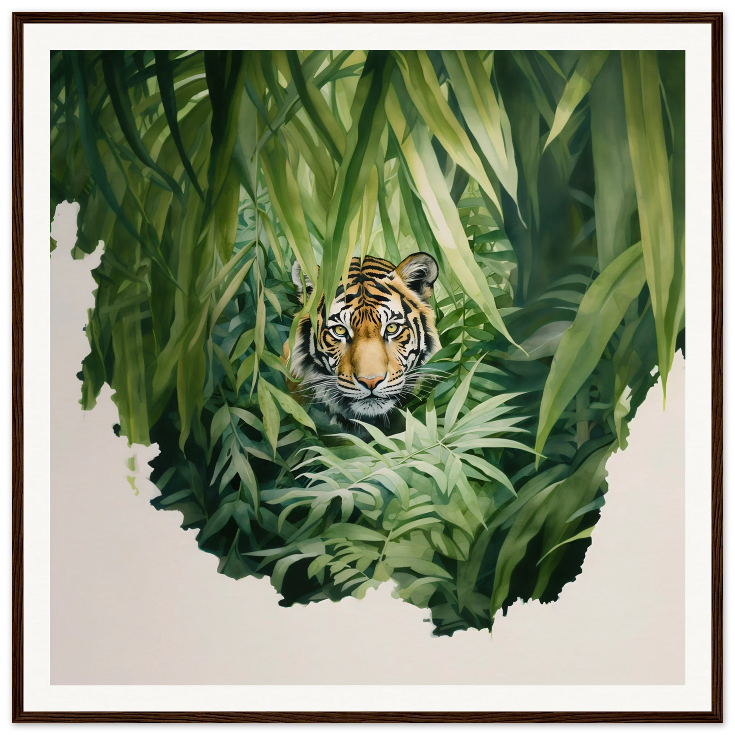 Imagine the raw beauty of nature captured in one stunning work of art, where the majestic tiger peers from lush jungle foliage, crafted with cutting-edge AI imagery. This Jungle Savagery Minimalism Framed Wall Art seamlessly marries nature with sophistication, inviting elegance into your space and creating a conversation piece that resonates with wild grandeur and sleek modernity.