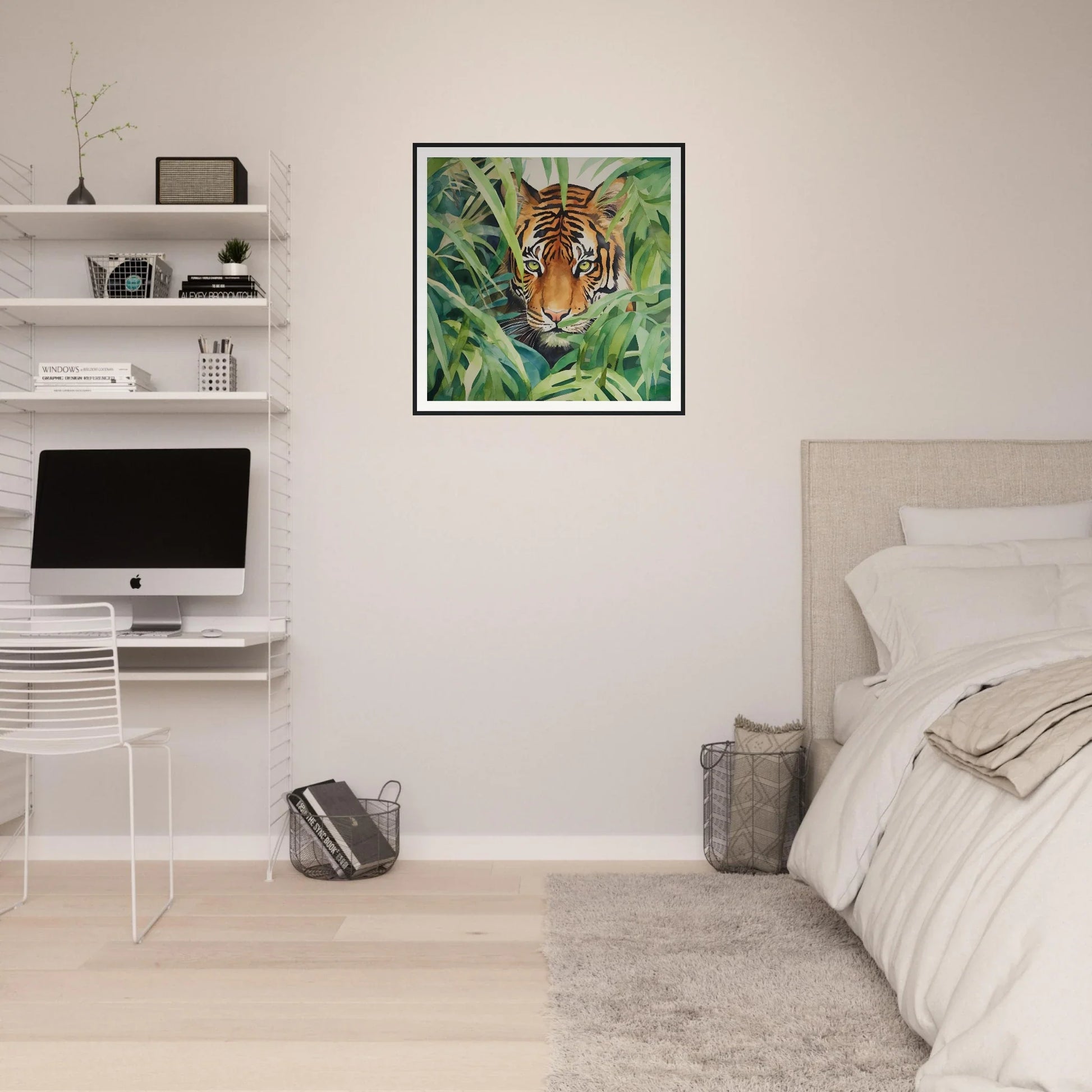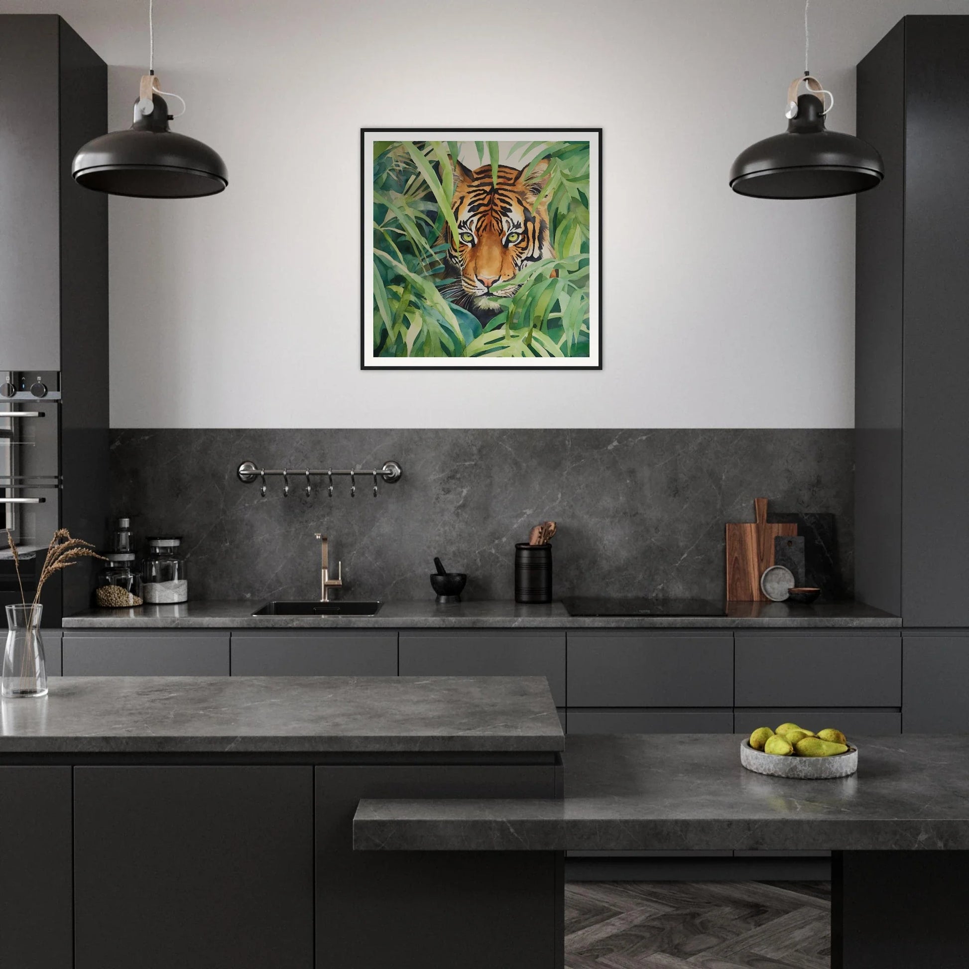 This piece fits splendidly in living rooms, home offices, entryways, and more — any setting craving a dash of nature's grandeur. Its dynamic color palette of greens, earthy hues, and the tiger's stunning oranges invites complementary decor styles, from minimalist to modern eclectic.