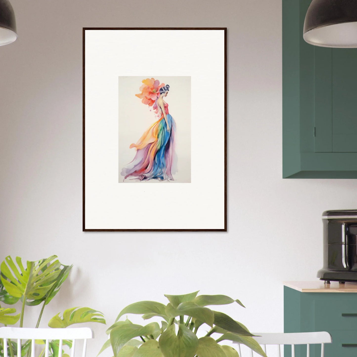 The "Kaleidoscope Floral Musing" framed wall art is a vibrant rainbow of colors, with the dominant pink hues capturing the eye. This piece fits perfectly in a fashionista's haven or a lively living room. The colorful and creative vibe exudes happiness, joy, and celebration, making it a perfect fit for spaces that thrive on inspiration and style. The fashion illustration subject, with its figurative elegance, adds a sparkling touch to any room seeking a blend of fashion and art.