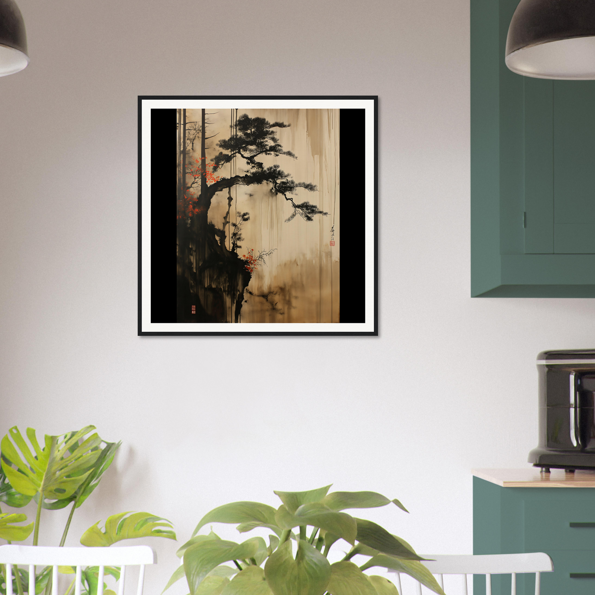 This exquisite piece features a gnarled pine tree on a precipice, captured with flowing lines and subtle hues. The tufts of pine needles stretch across the canvas in harmonious balance, while the misty backdrop adds depth and mystery. Splashes of red add vibrant contrast, reminiscent of delicate blossoms whispering in the breeze.