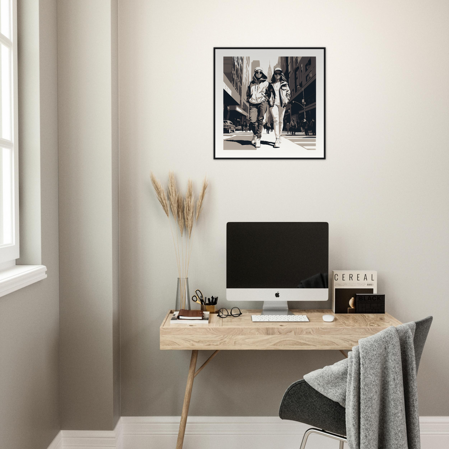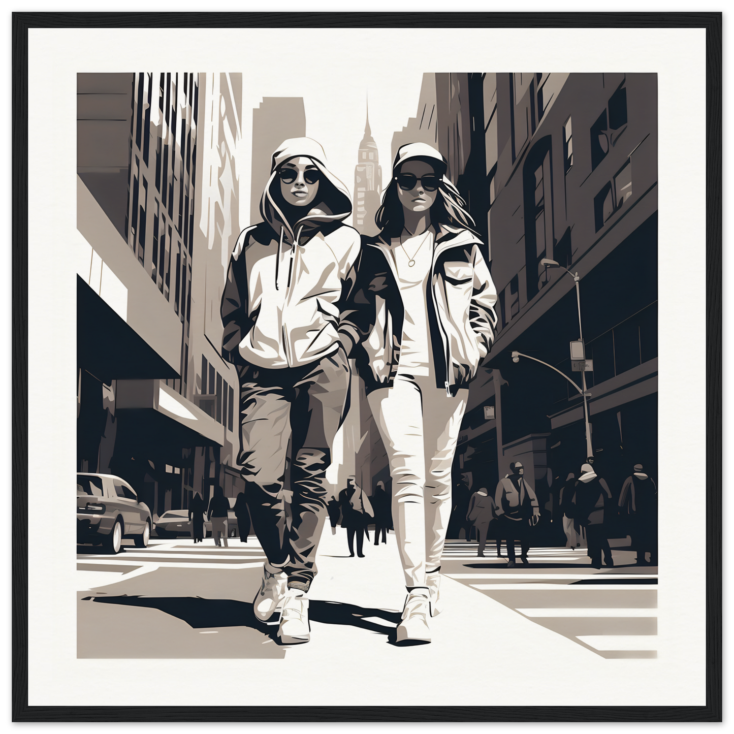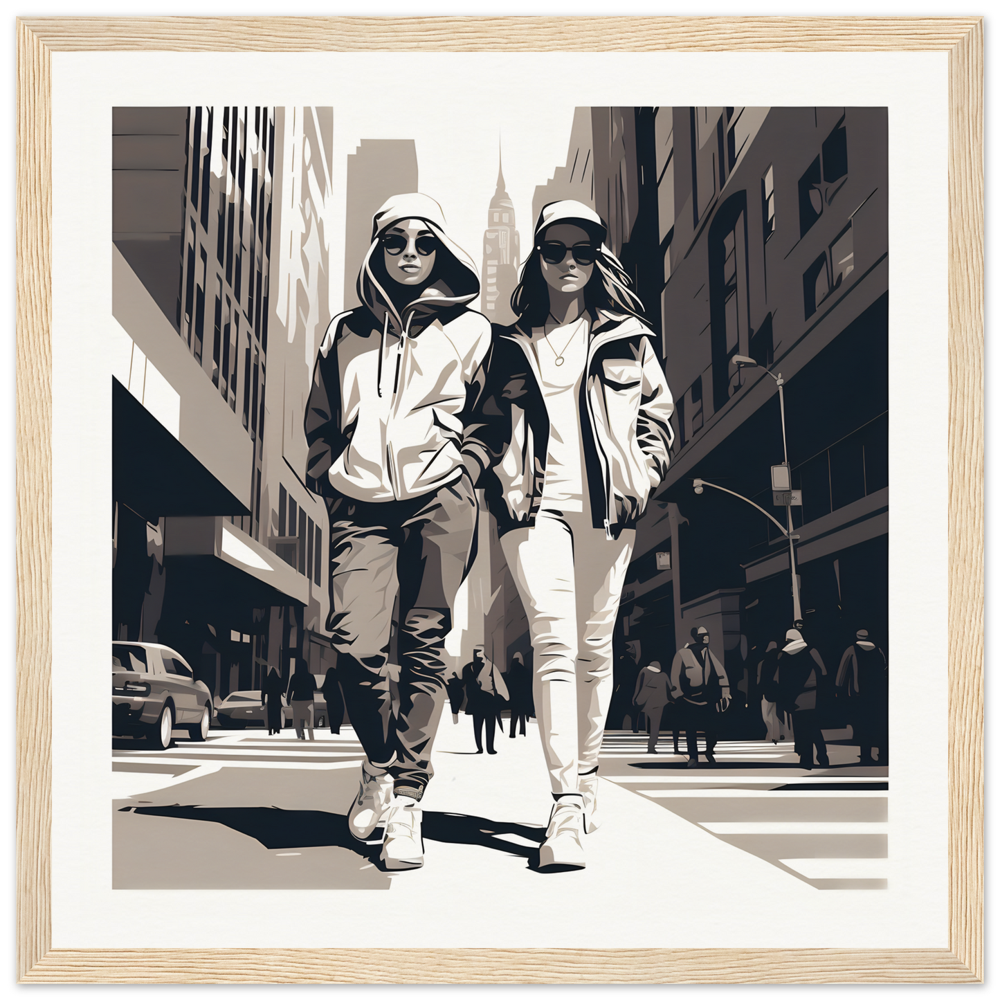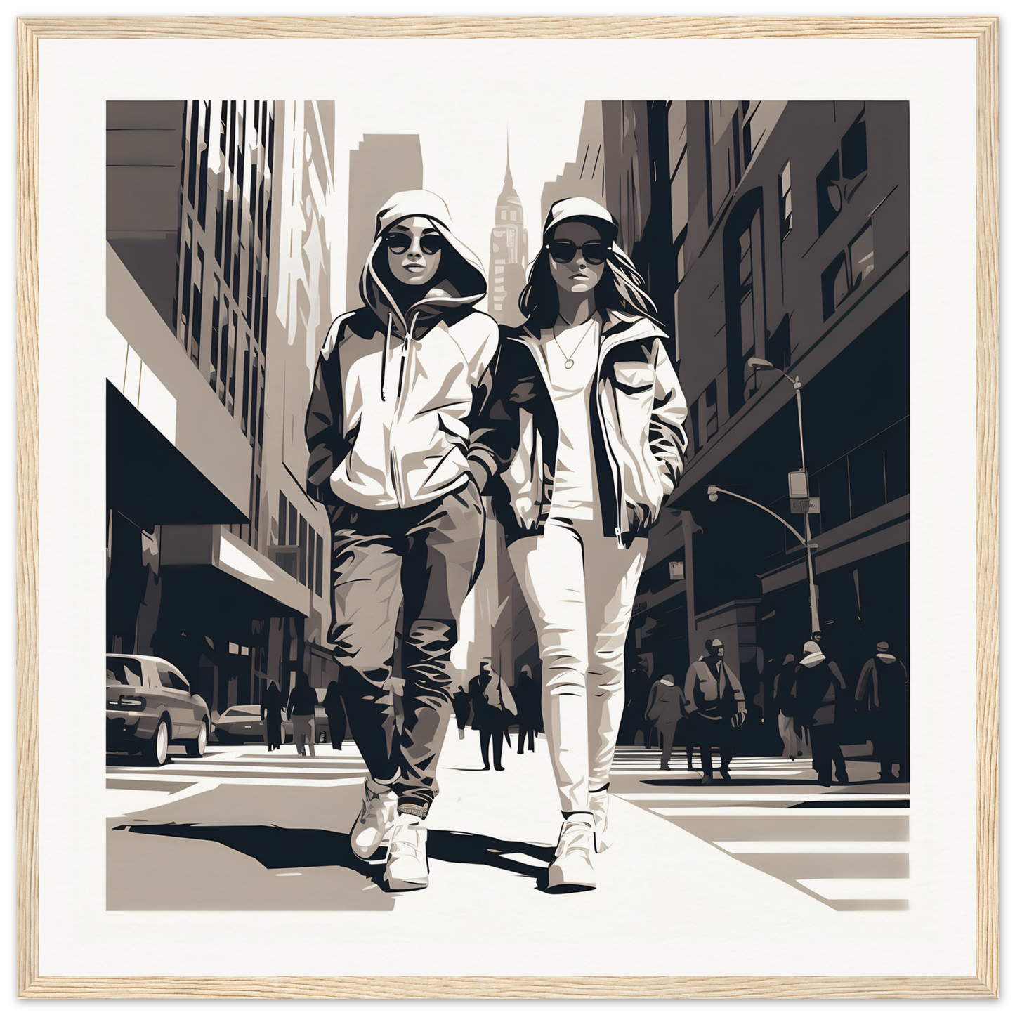 Crafted from durable pine, each frame is available in elegant finishes: black, white, natural, or dark brown. Whether you seek a stark monochromatic look or the warmth of natural wood grains, our frames promise to complement the stylish urban narrative of the artwork.