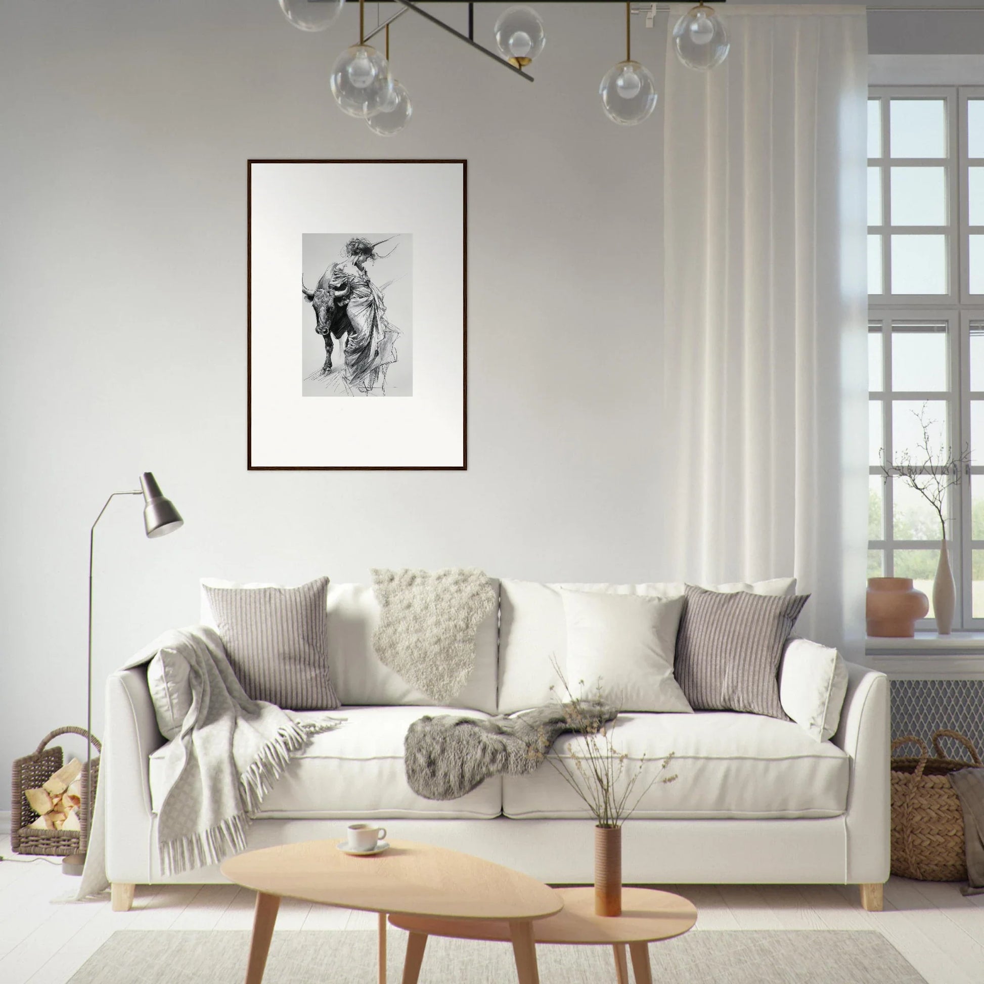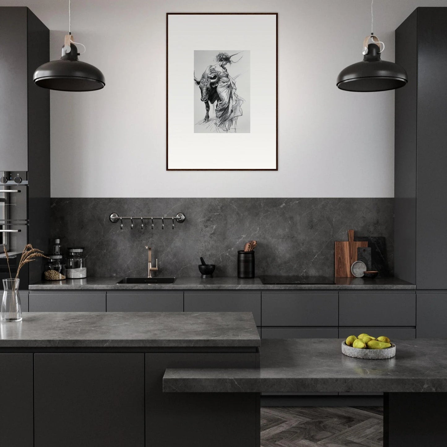 The Minotaur's Melodic Siesta art print showcases a monochrome palette with grey tones, making it perfectly versatile for a home office or living room. Fit for the contemporary art lover, this abstract yet figurative piece evokes a sense of mystery and intrigue while inspiring creativity.
