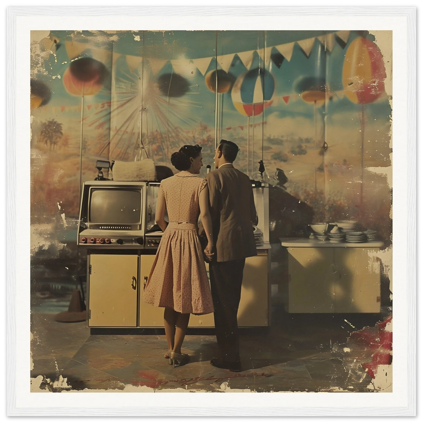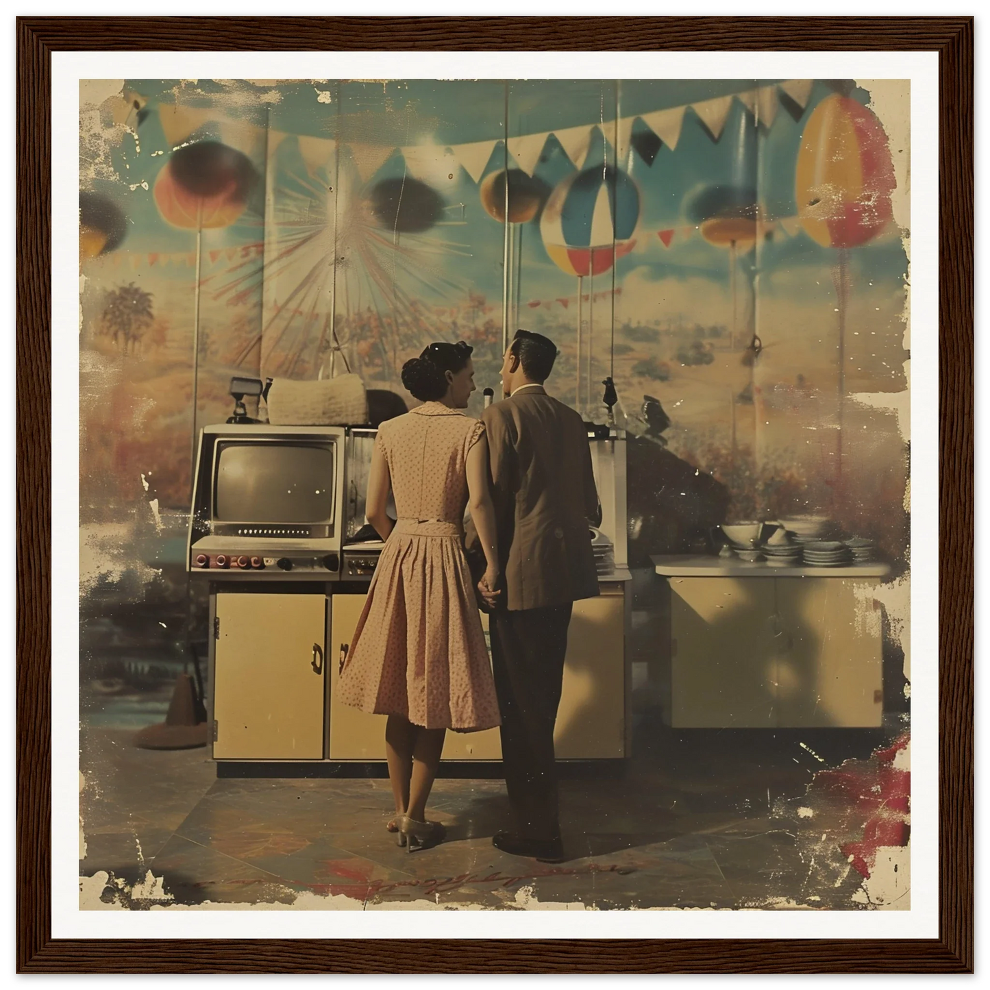 Imagine capturing the essence of a wistful, mid-20th-century moment and bringing it into your home’s heart. Our Nostalgic Hues Dreaming framed wall art carries more than imagery; it holds an affectionate passage through time. Created with the latest AI image generation technology, this piece offers a seamless blend of nostalgia and artistry that will elevate any living space to a realm of elegance and charm. Perfectly poised for your living room or bedroom, this artfully framed image invites you to relish in the serenity of unity and shared dreams.