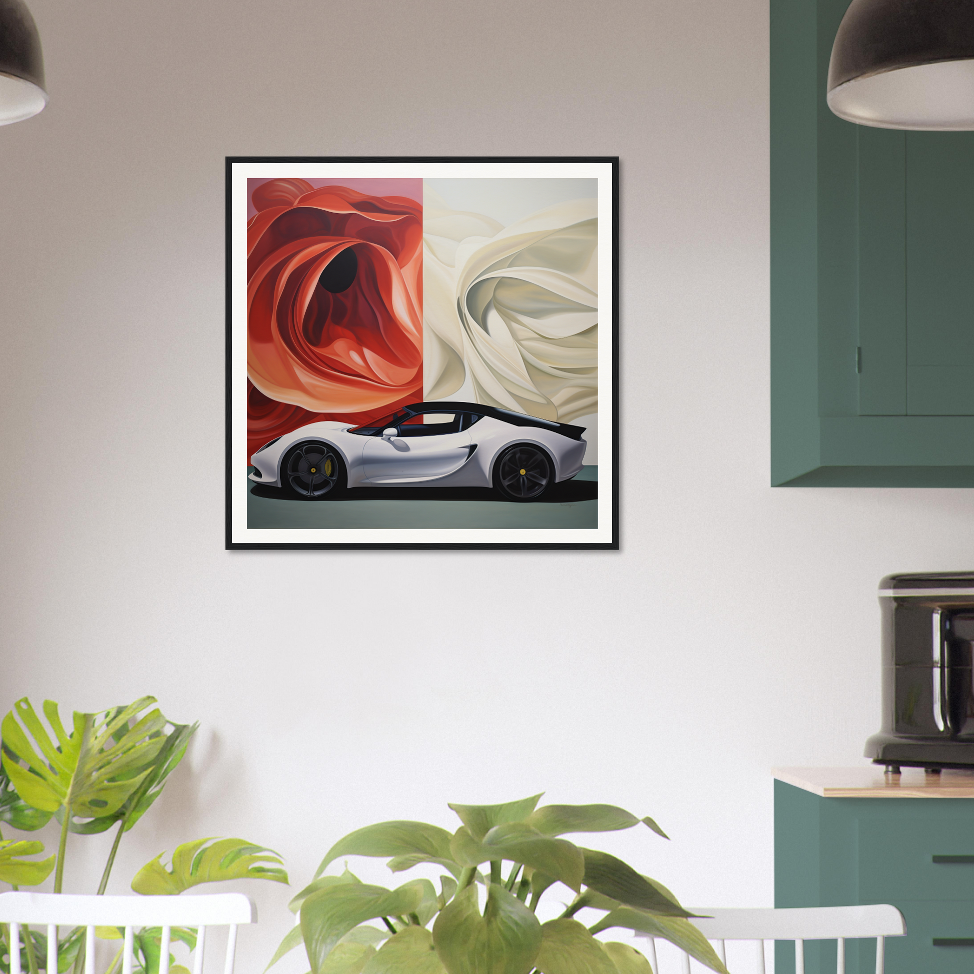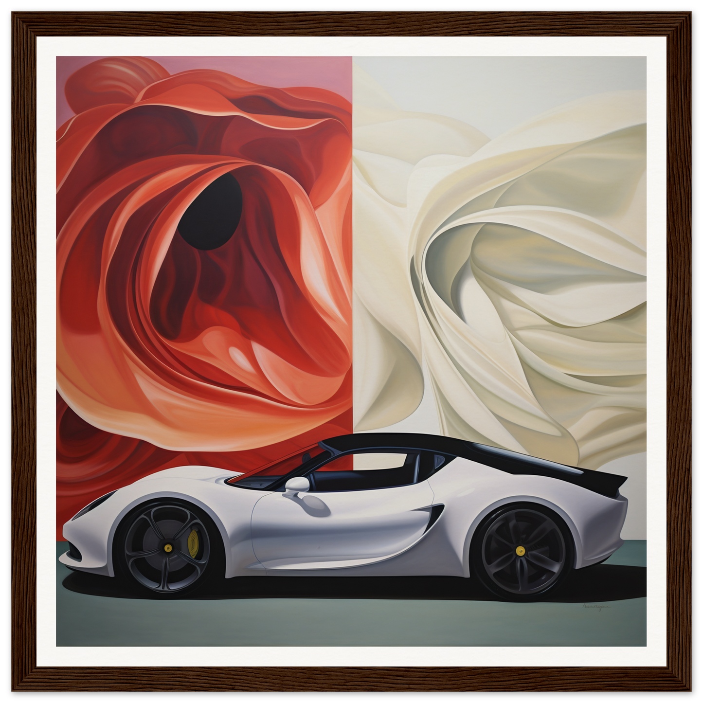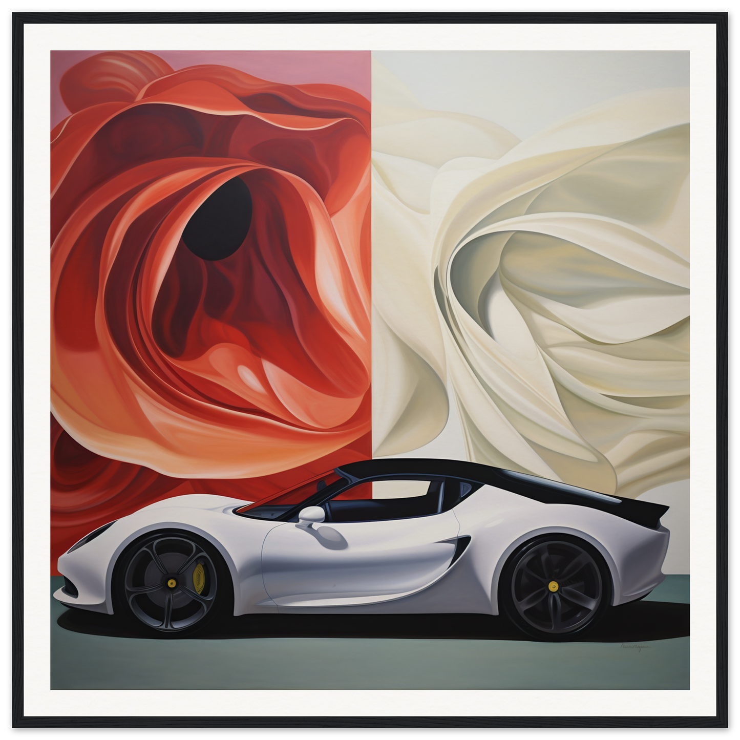 Drawing inspiration from the vibrant tensions between nature and technology, this piece captures the essence of modern artistic brilliance. The meticulously detailed white sports car embodies luxury and sophistication, set against a backdrop of vivid, abstracted petals flowing in deep reds and soft creams. The art, reminiscent of Georgia O’Keeffe’s organic explorations, allures with its enticing narrative of collaboration and contrast.