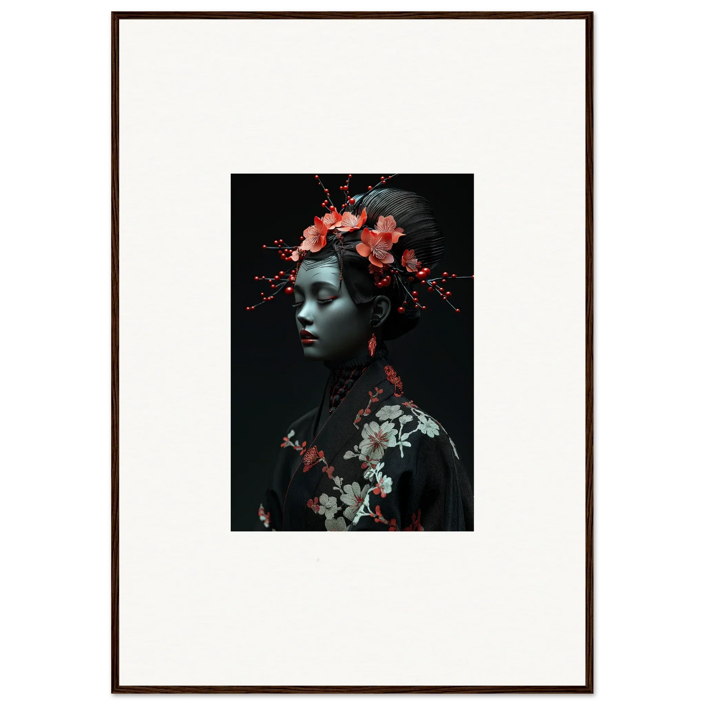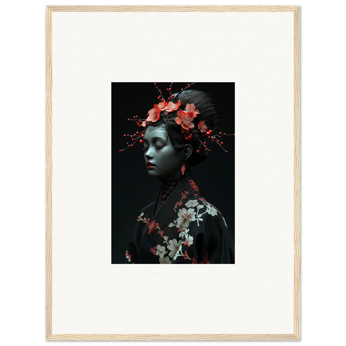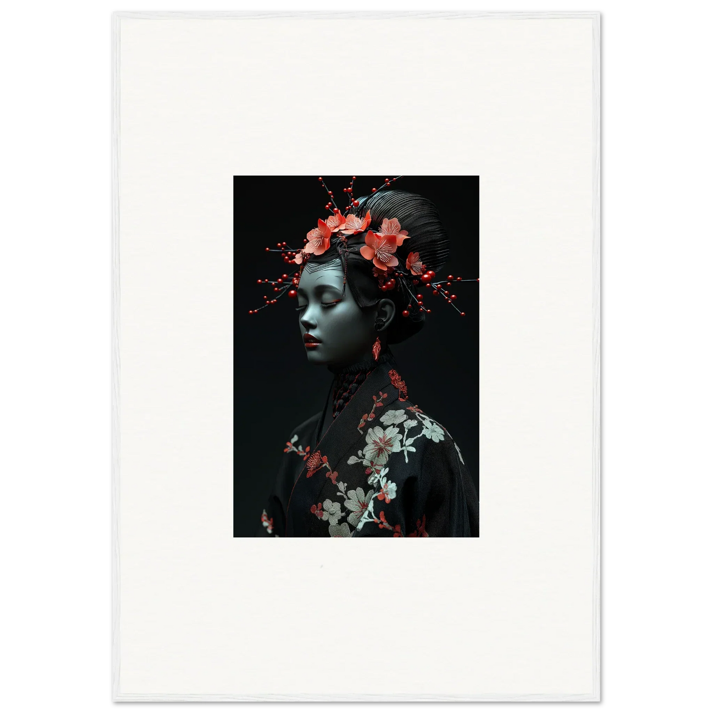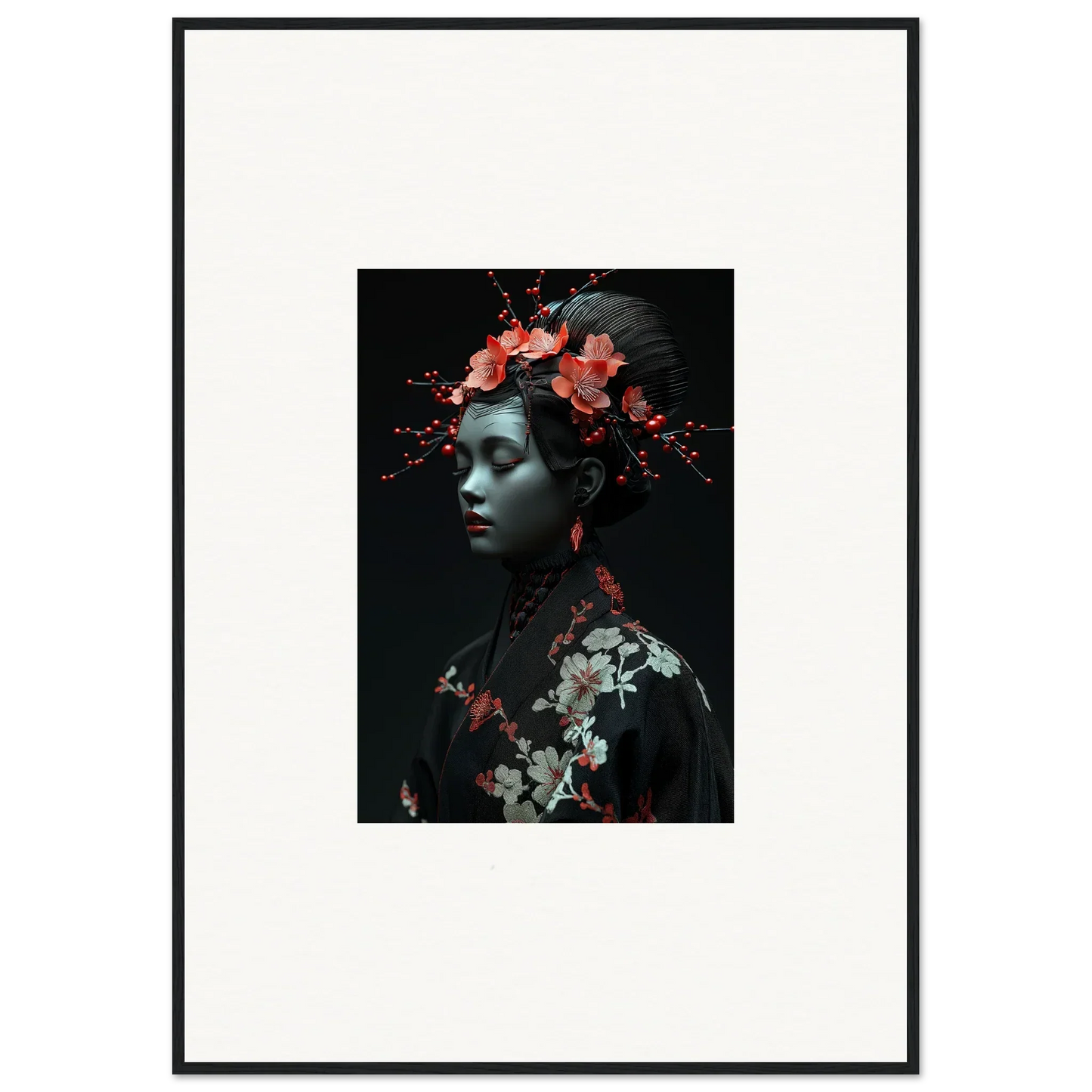 The eloquent Porcelain Cherry Essence is more than just a visual delight; it's an embodiment of luxurious style and serenity. The beautifully composed portrait, enriched with harmonious red hues and a bold black backdrop, effortlessly complements any bedroom or living room. The serene mood it brings is perfect for infusing tranquility and peace in your cultural and world-themed spaces.