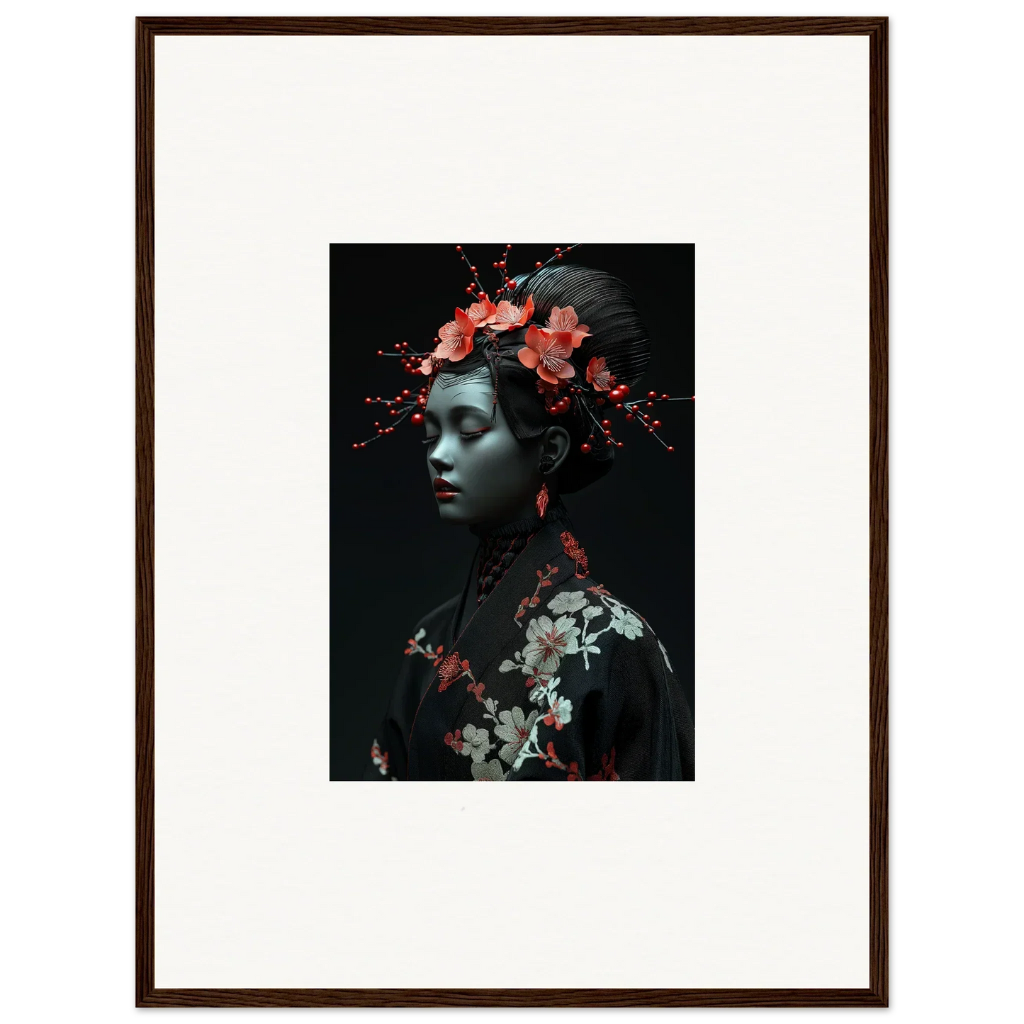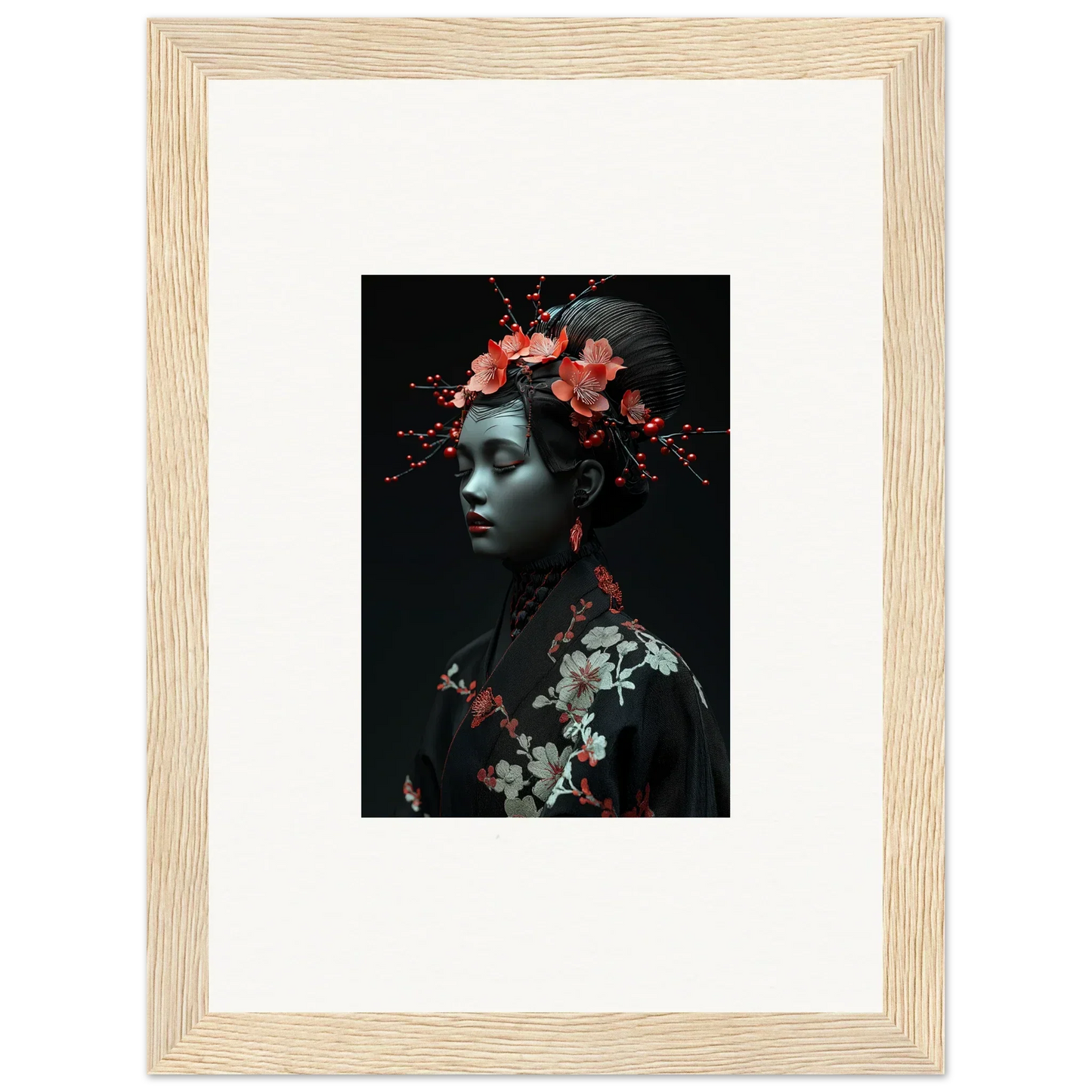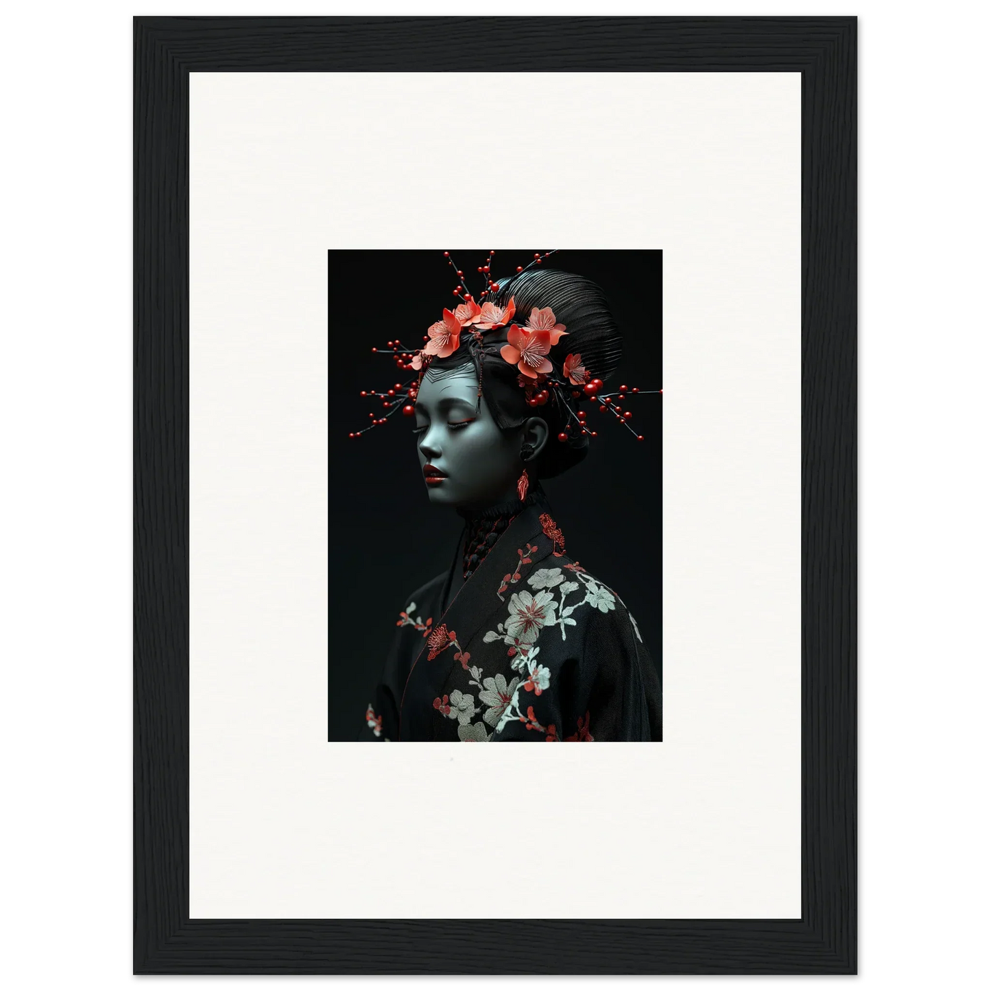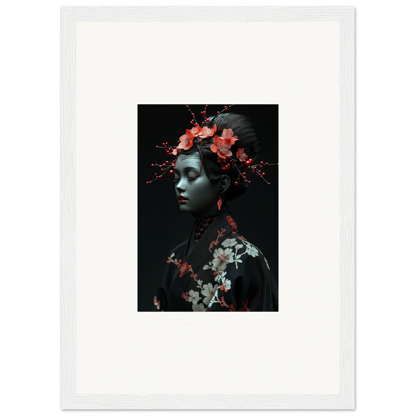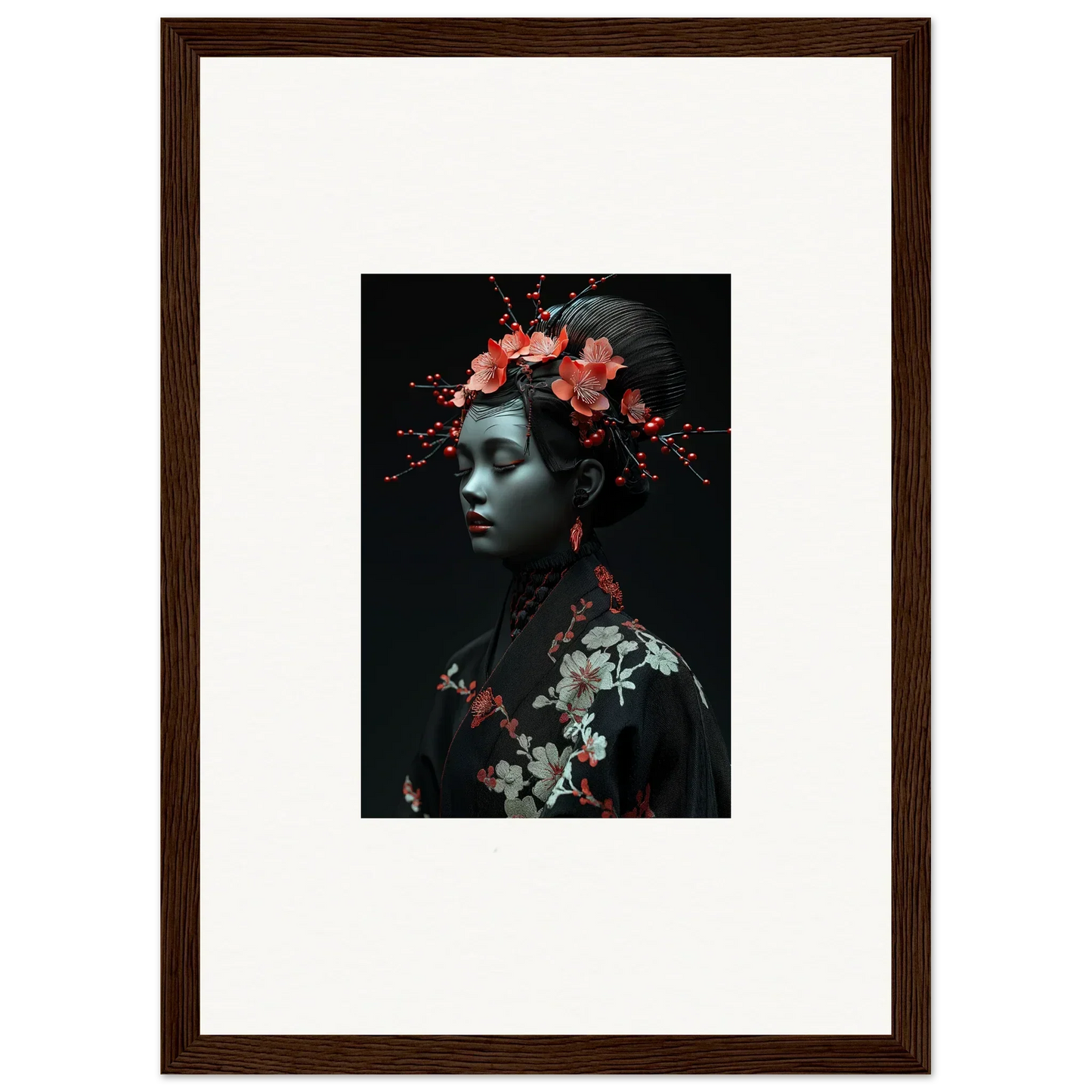 The eloquent Porcelain Cherry Essence is more than just a visual delight; it's an embodiment of luxurious style and serenity. The beautifully composed portrait, enriched with harmonious red hues and a bold black backdrop, effortlessly complements any bedroom or living room. The serene mood it brings is perfect for infusing tranquility and peace in your cultural and world-themed spaces.