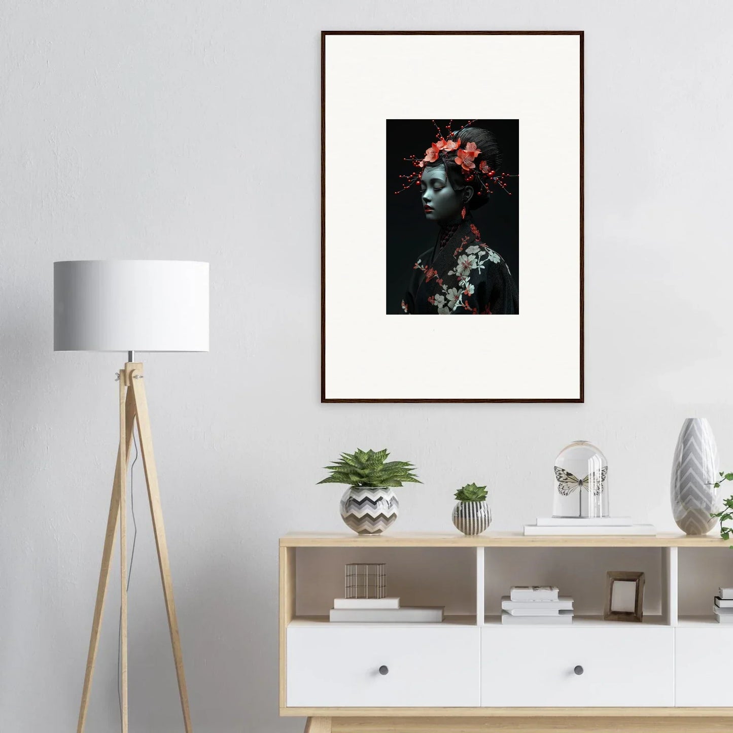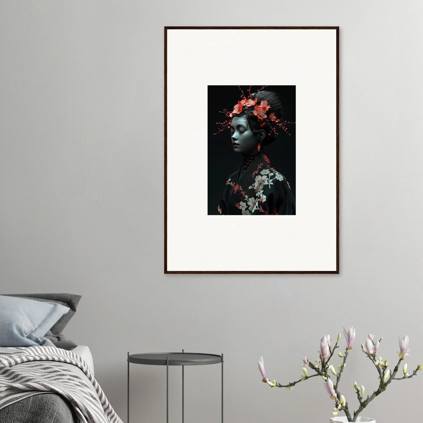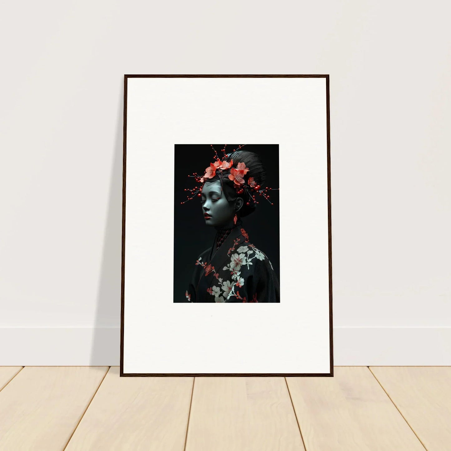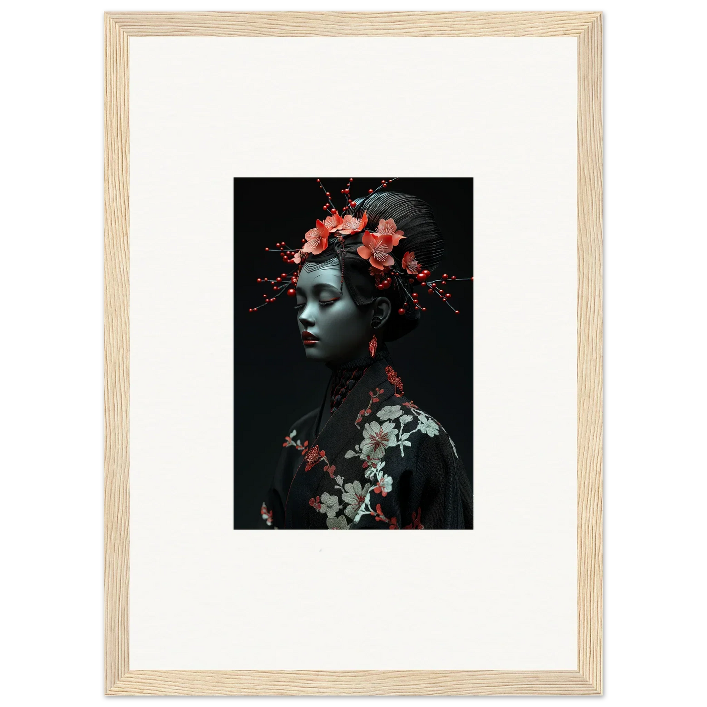 The eloquent Porcelain Cherry Essence is more than just a visual delight; it's an embodiment of luxurious style and serenity. The beautifully composed portrait, enriched with harmonious red hues and a bold black backdrop, effortlessly complements any bedroom or living room. The serene mood it brings is perfect for infusing tranquility and peace in your cultural and world-themed spaces.